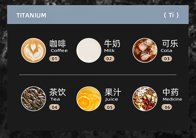 钛表面会形成稳定的氧化膜,所以钛杯可以泡茶、装咖啡、牛奶、果汁、中药……不会与液体发生化学反应,安全无毒,在健康上十分有保障。
