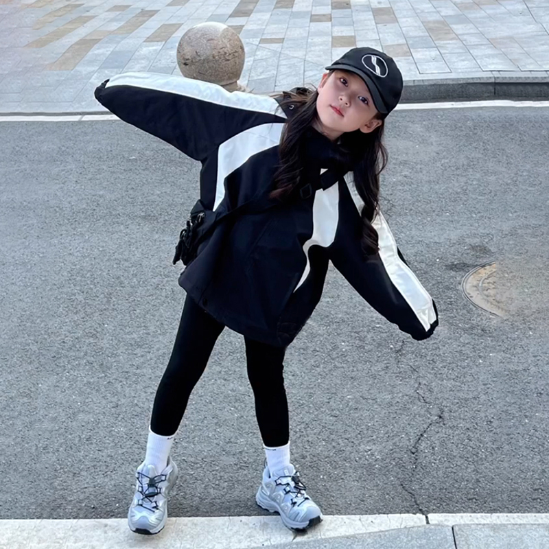 此款外套也是男孩子女孩子都可以穿的,设计上黑白拼接,通过色块分割,在视觉上修饰身形,让孩子看起来更精神,是永恒的经典款。