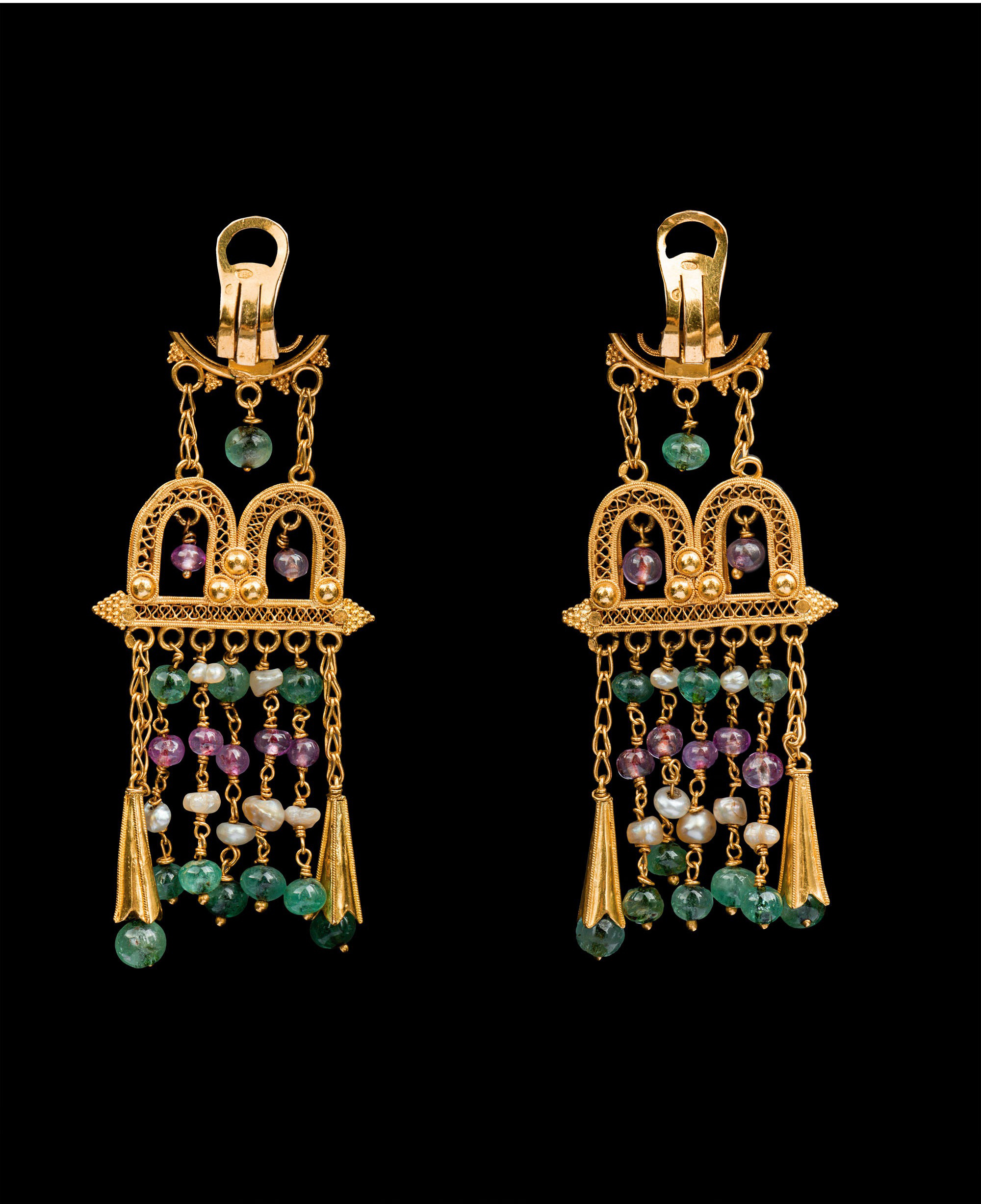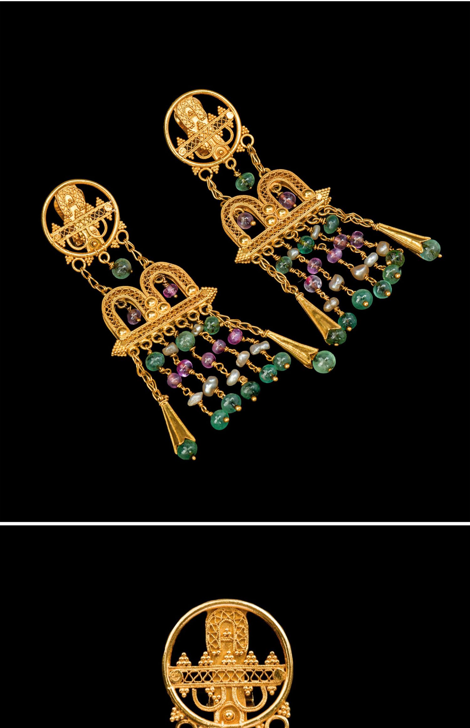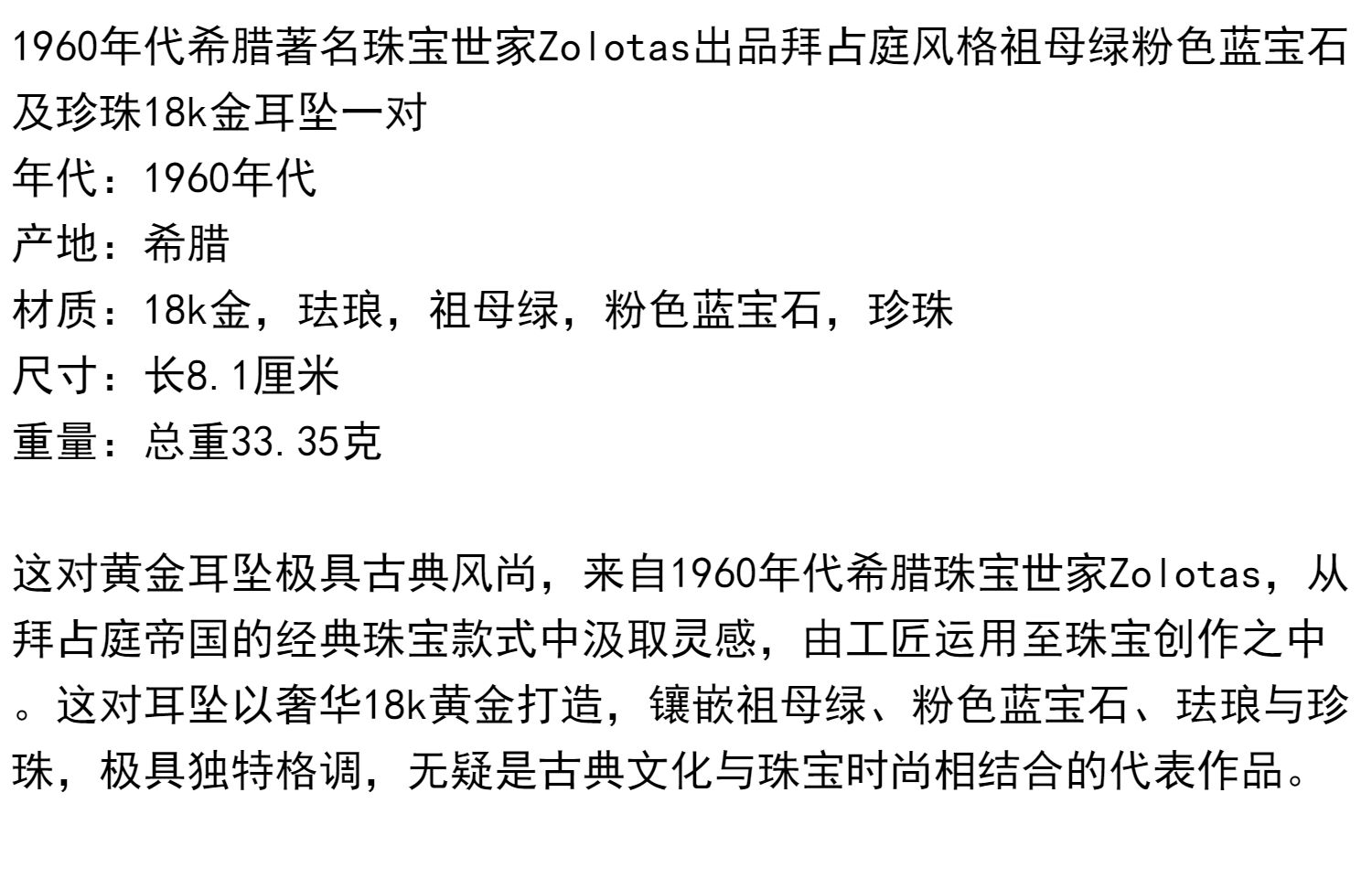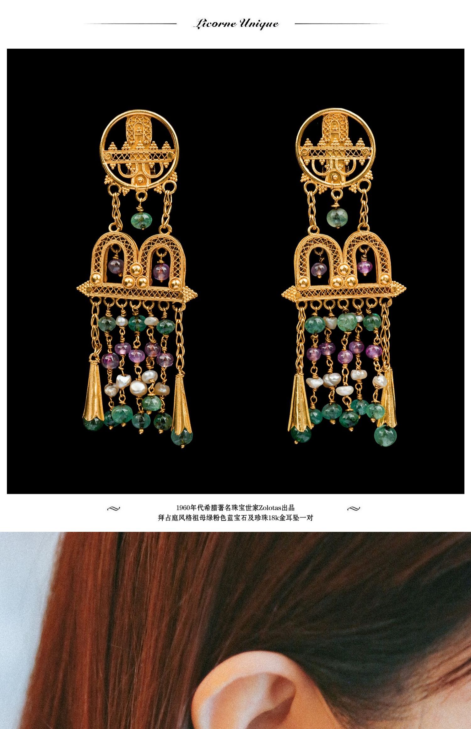 独角鹿西洋古董珠宝希腊18K金镶祖母绿粉色蓝宝石珍珠耳坠耳环