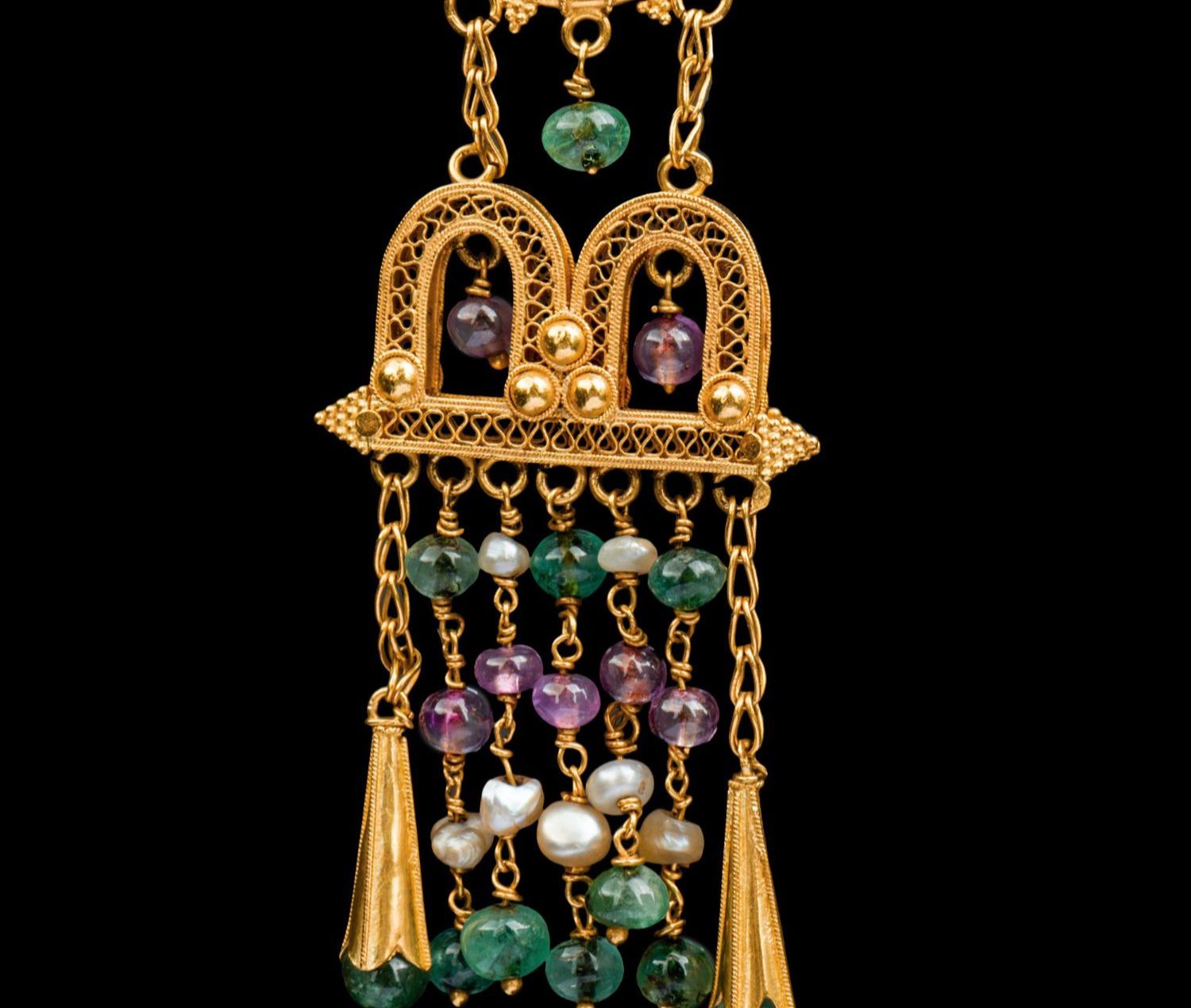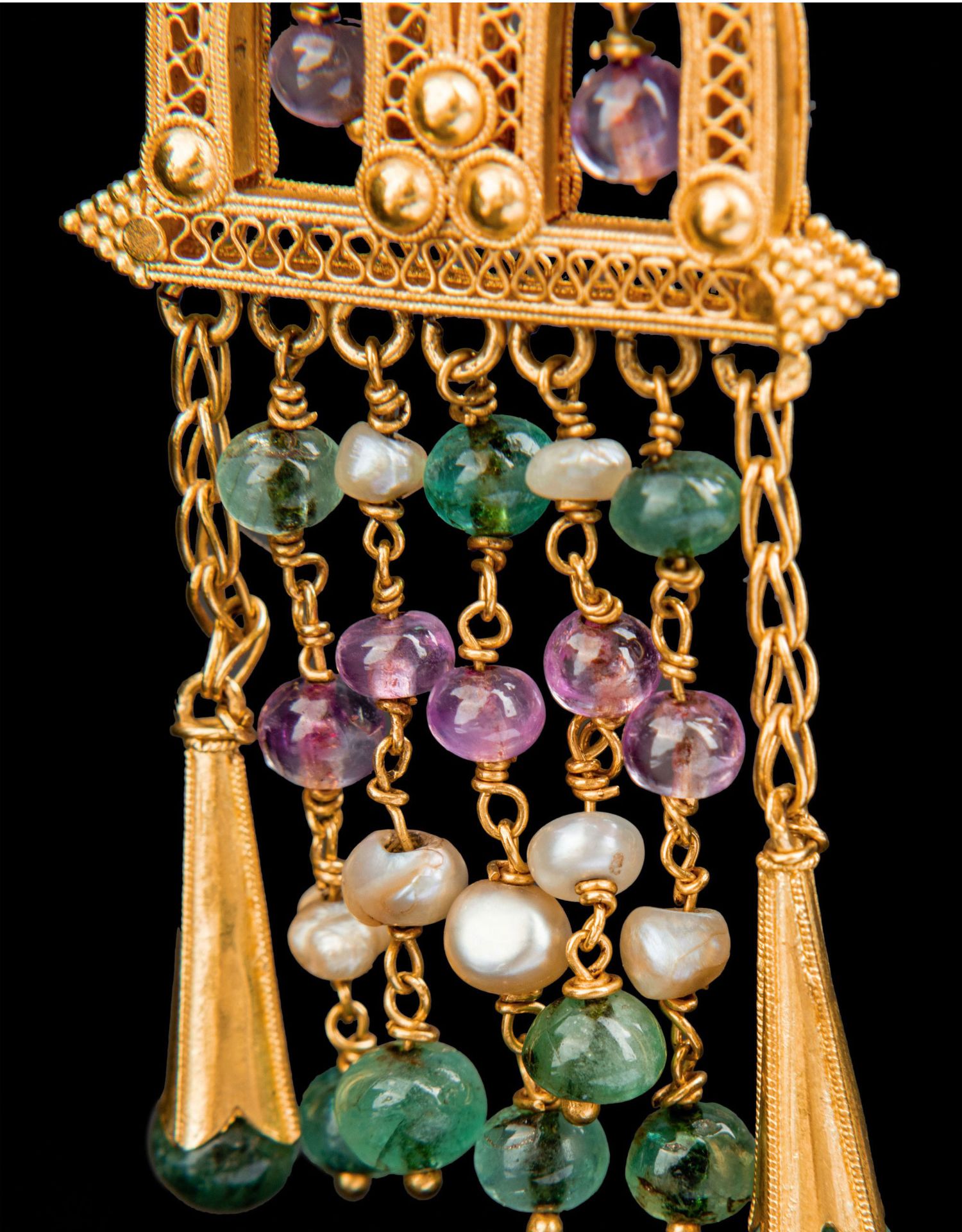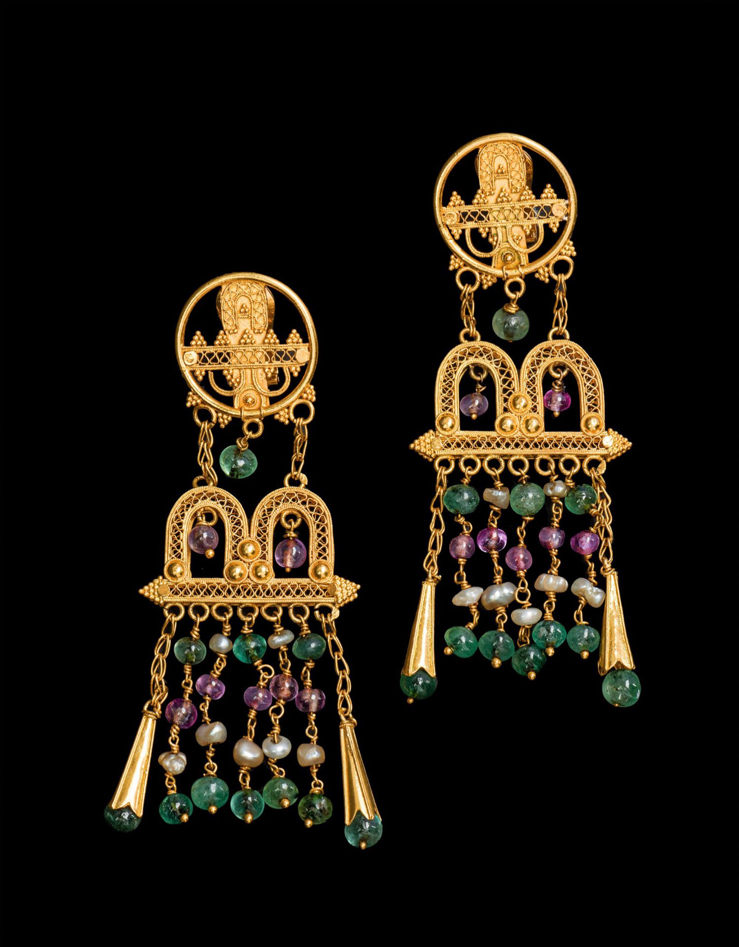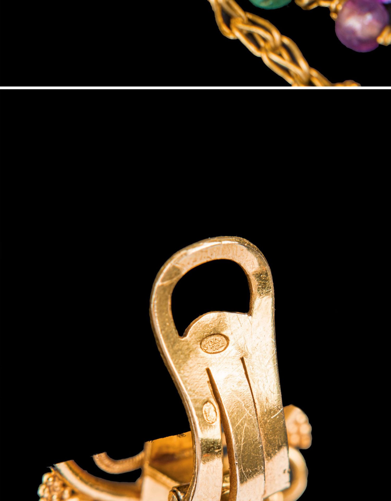 独角鹿西洋古董珠宝希腊18K金镶祖母绿粉色蓝宝石珍珠耳坠耳环