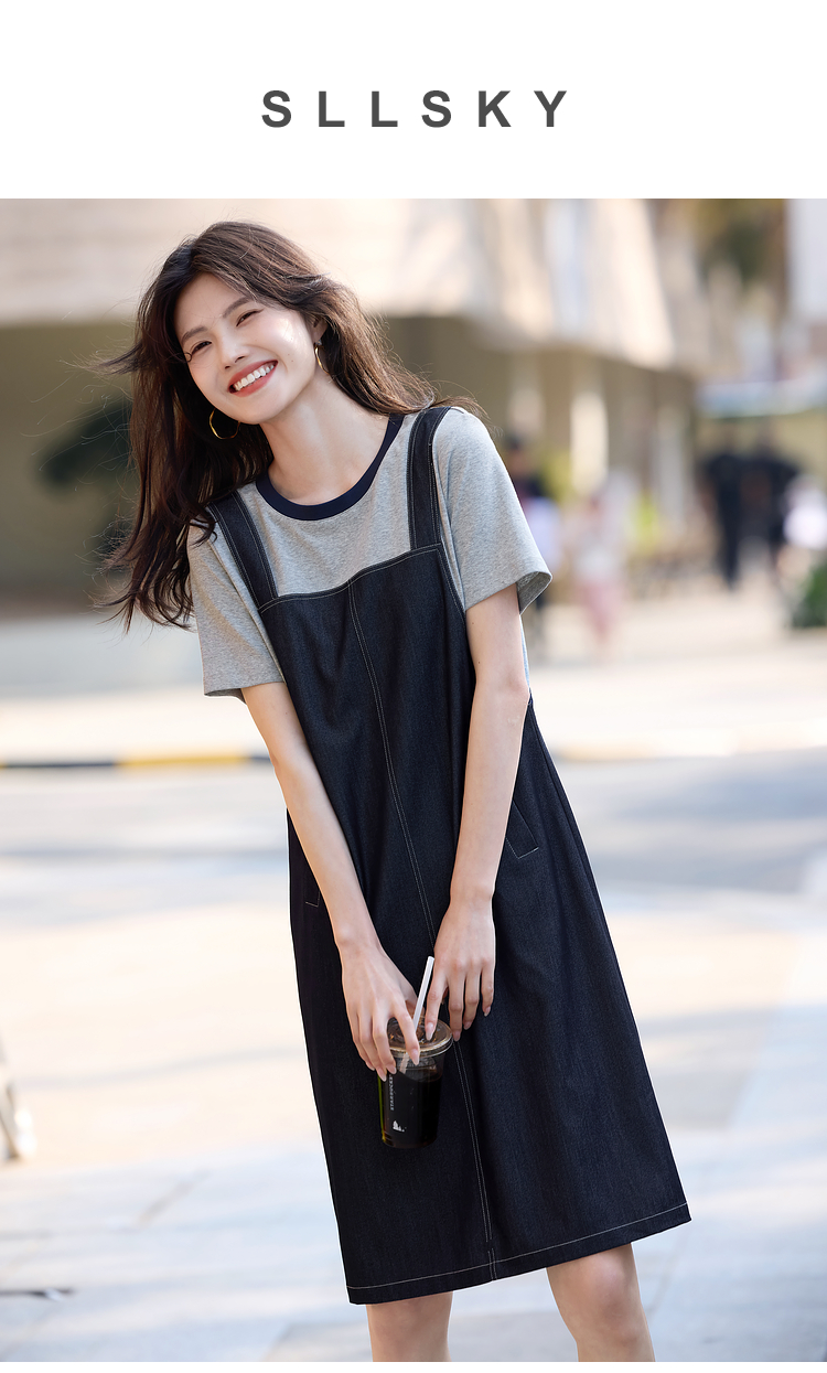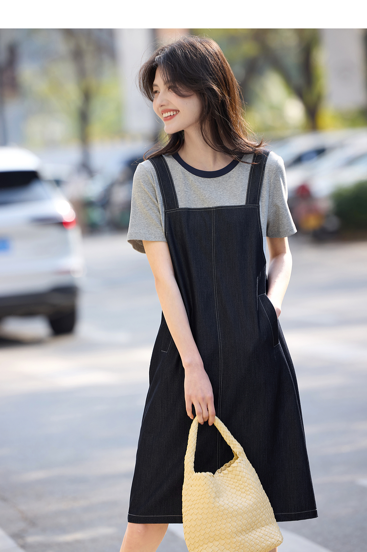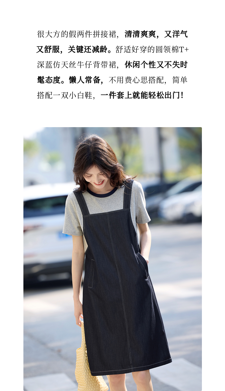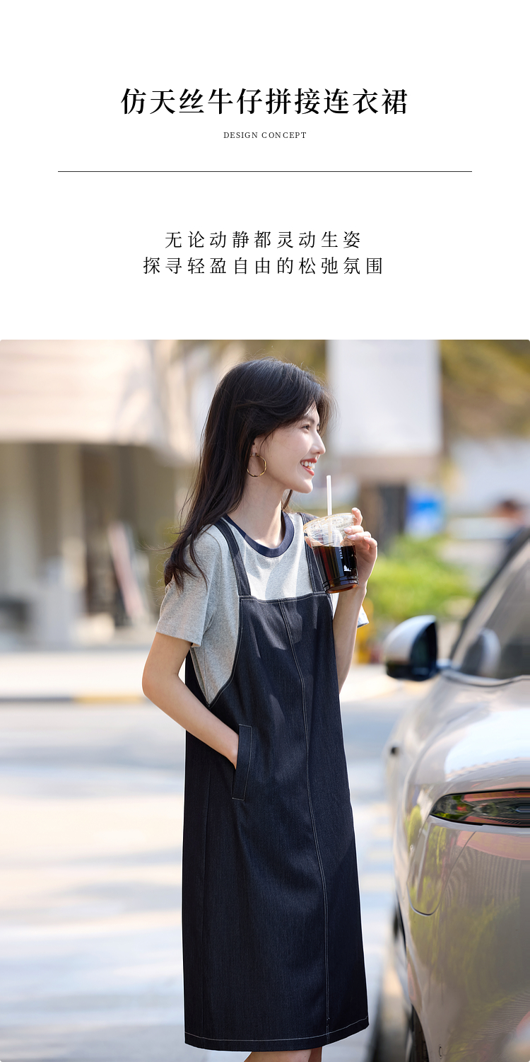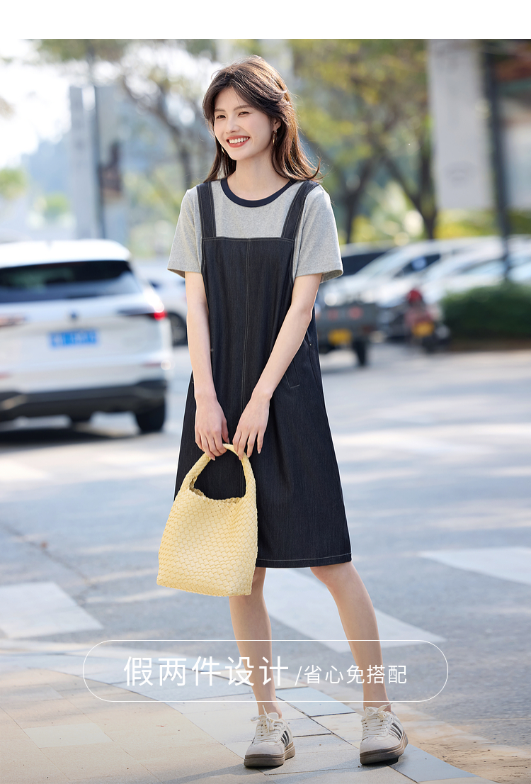 【周四狂欢价】熙世界仿天丝牛仔拼接短袖连衣裙女设计感假两件裙子2025夏季新款