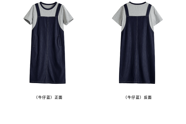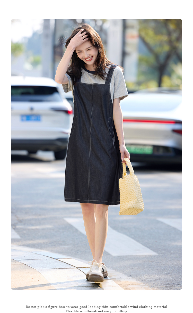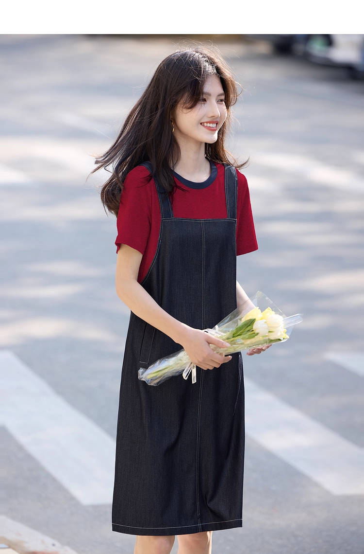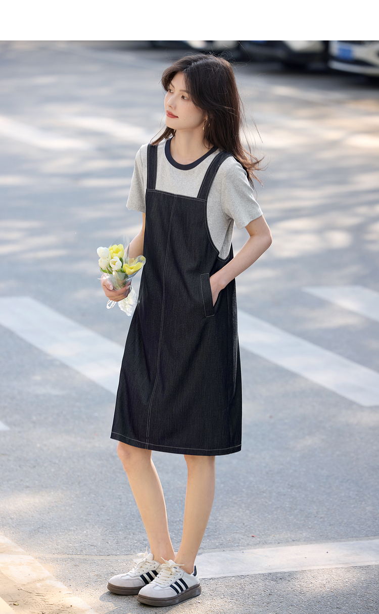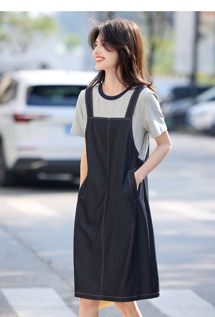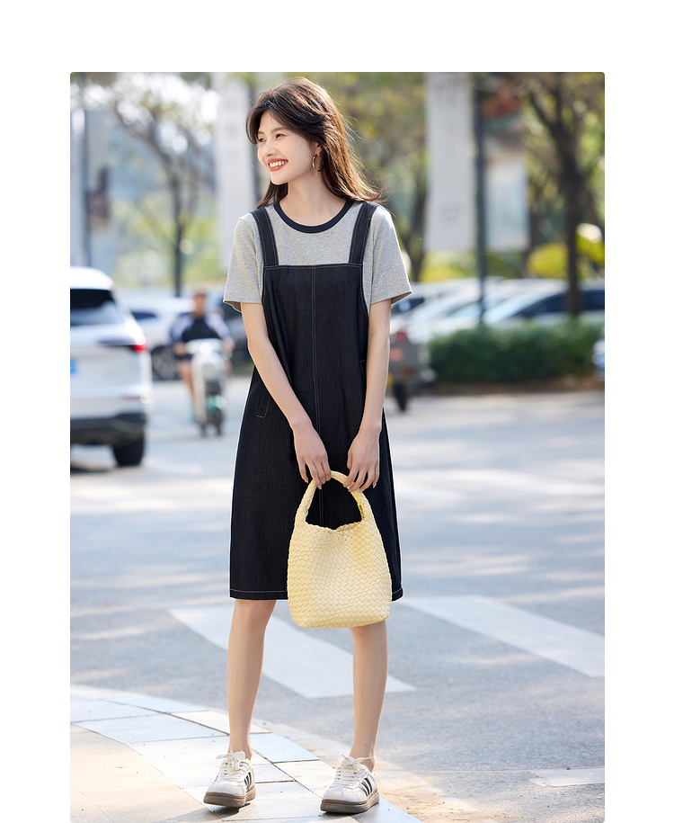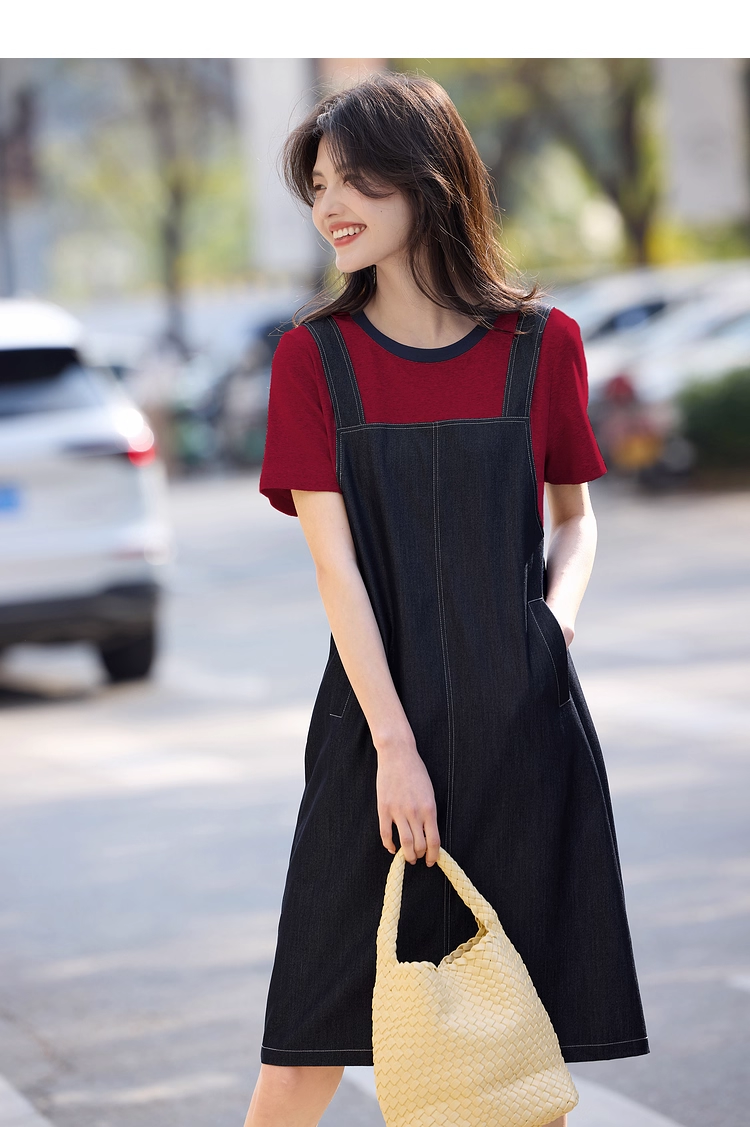 【周四狂欢价】熙世界仿天丝牛仔拼接短袖连衣裙女设计感假两件裙子2025夏季新款