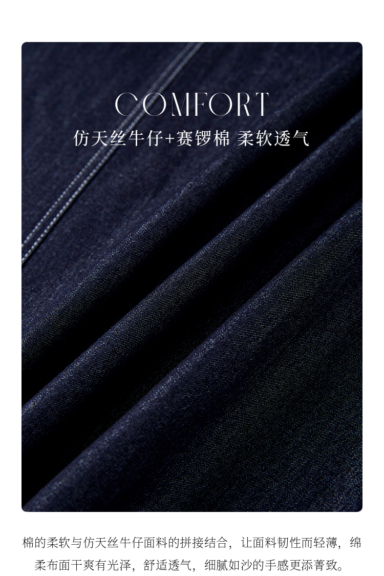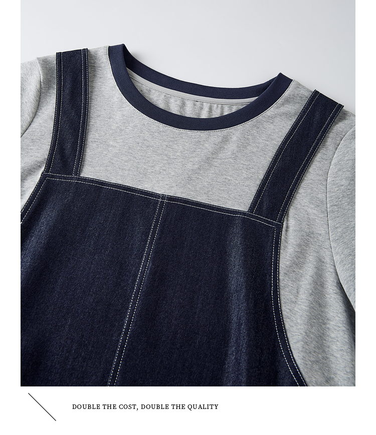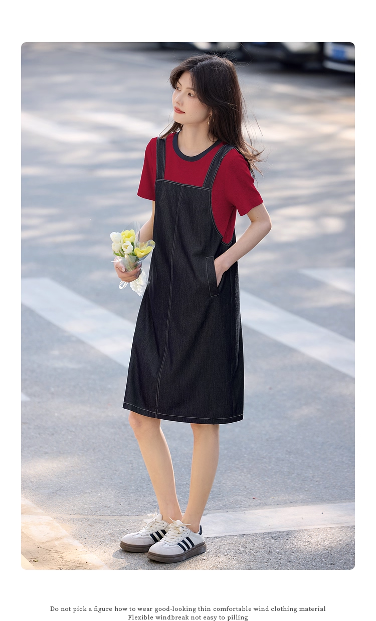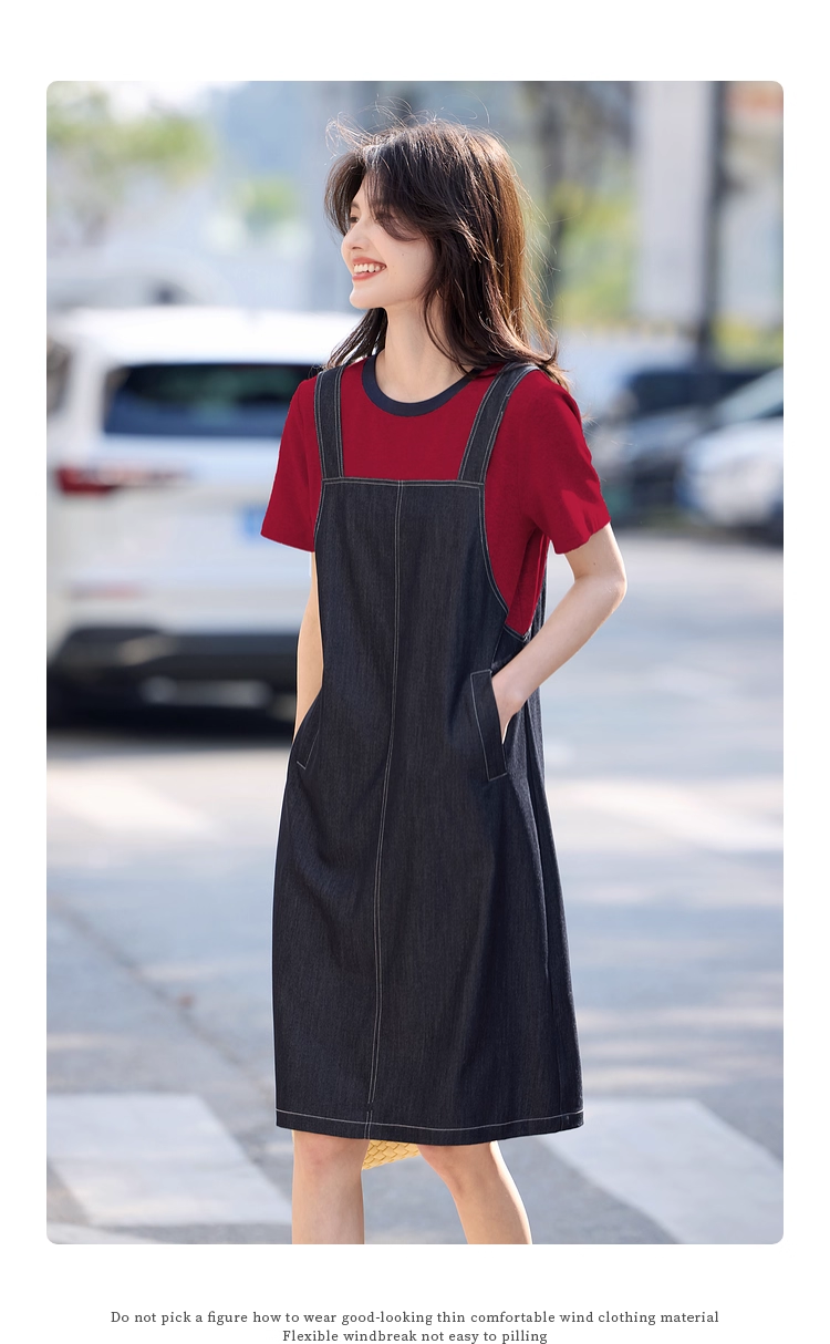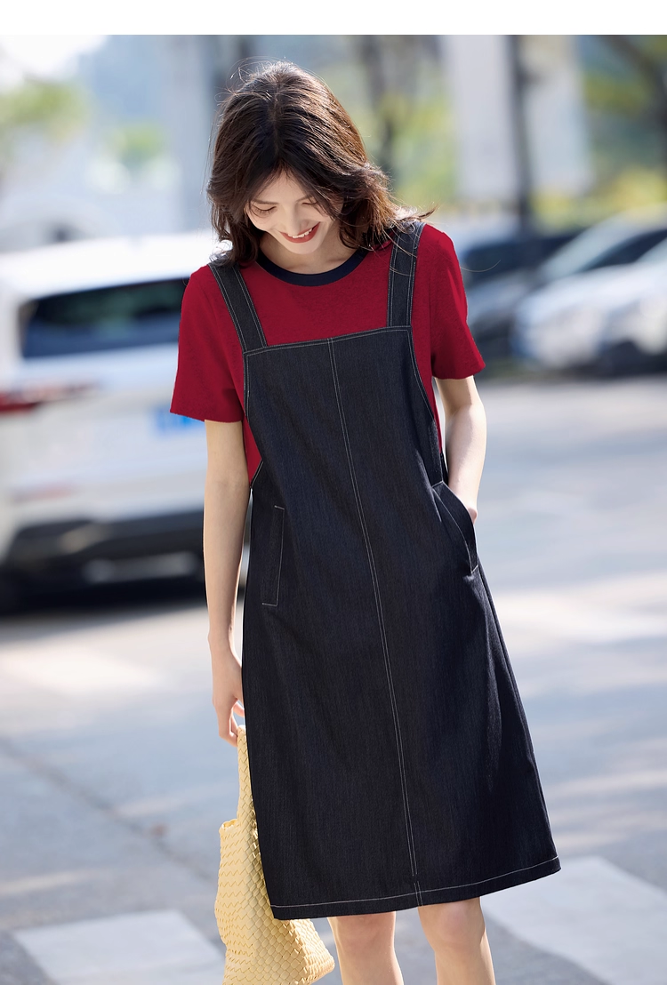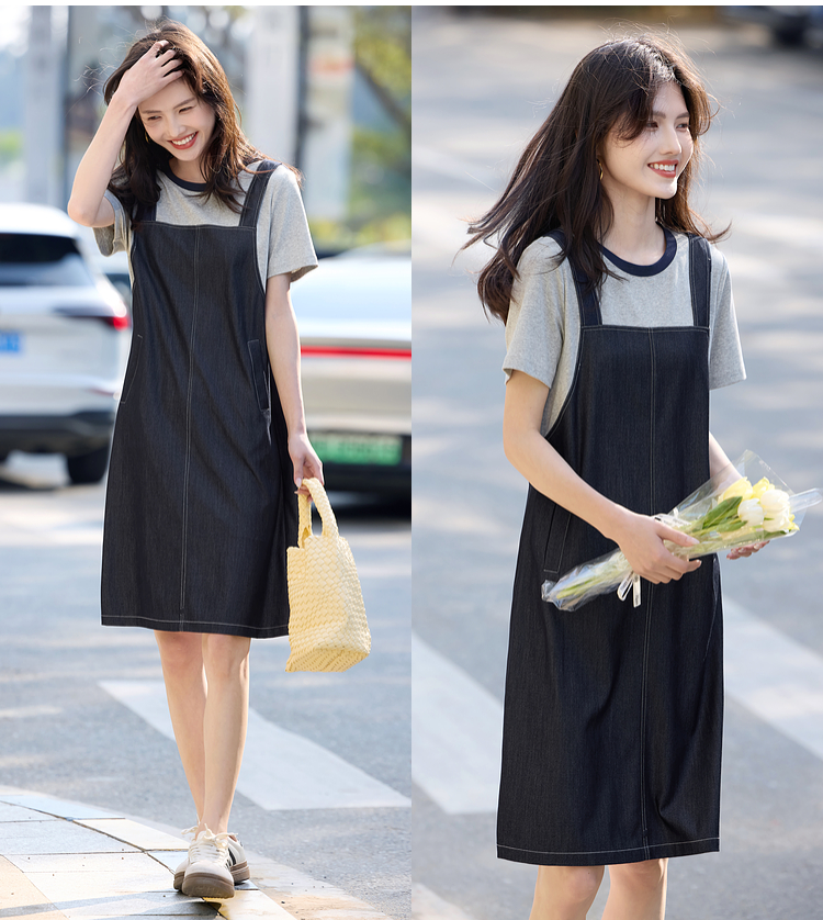【周四狂欢价】熙世界仿天丝牛仔拼接短袖连衣裙女设计感假两件裙子2025夏季新款