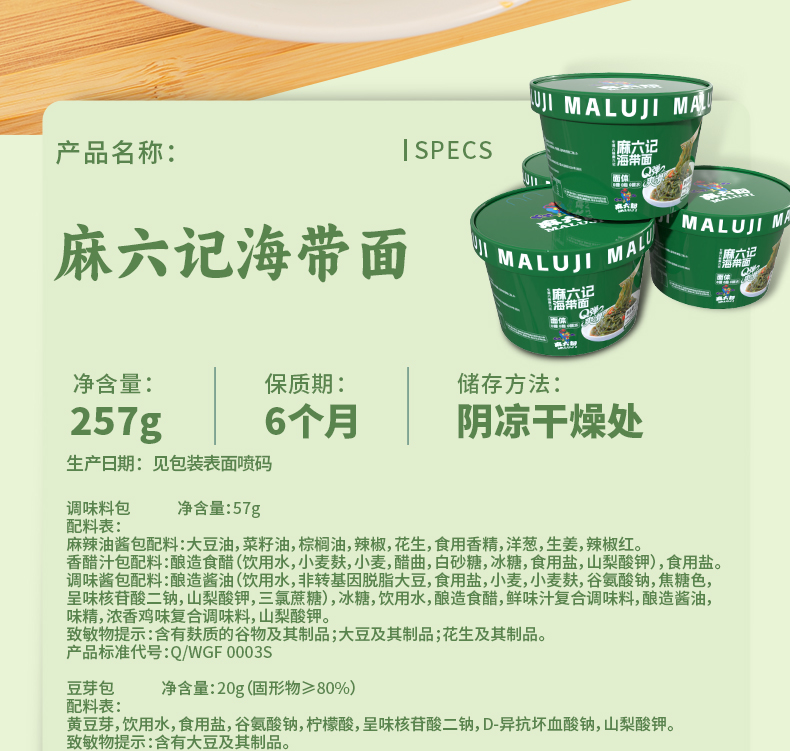麻六记 海带面257g*4桶/6桶 解馋饱腹 Q弹爽滑 72小时发货