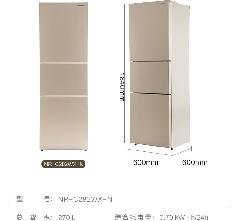 8月内购松下冰箱NR-C282WX-N 270升三门 3D立体风冷无霜 600mm超薄设计 宽幅变温 银离子除菌 磨砂金 NR-C282WX-N 三门冰箱 270升
