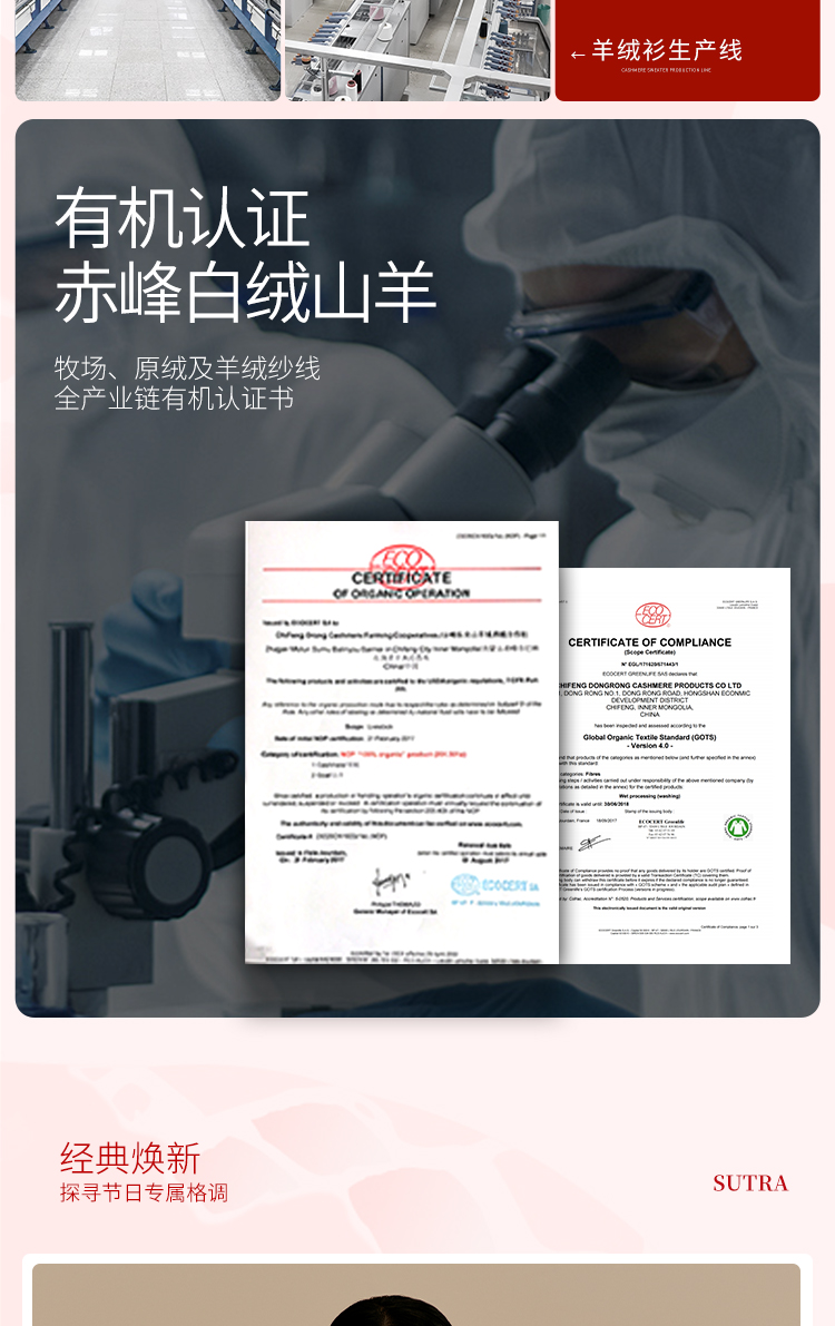 东黎羊绒是赤峰东荣集团自主品牌,自有牧场/羊绒制品全产业链优势,实现了羊绒从“牧场”到“商场”的华丽转变。