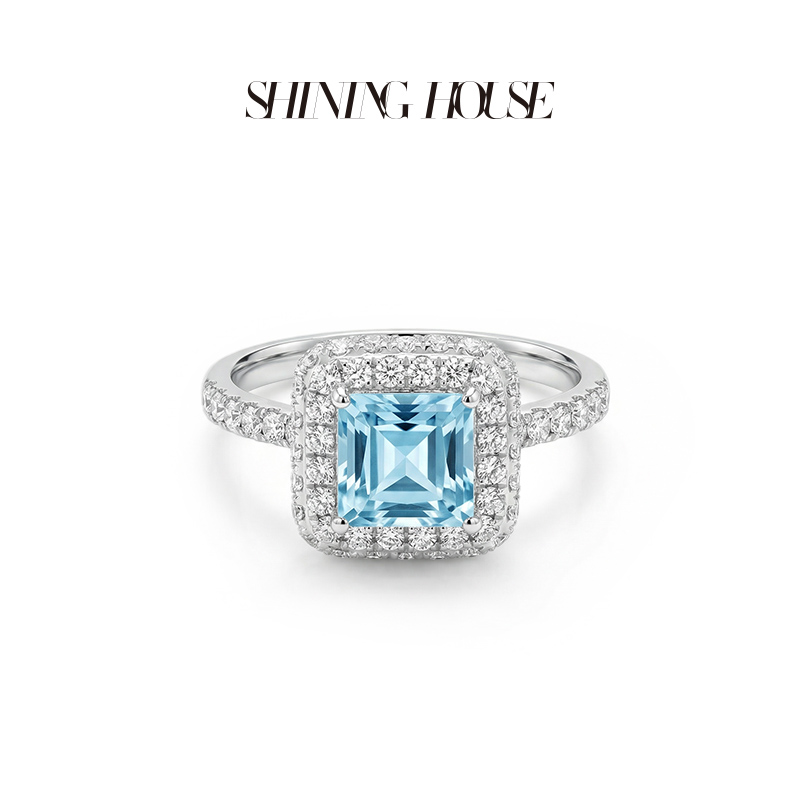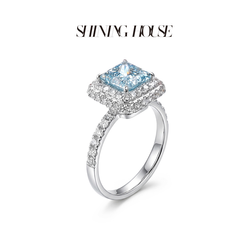 ShiningHouse[培育] 彩钻系列 18k金钻石戒指 蓝钻公主方形1克拉钻人工真钻人造钻石K金戒指时尚钻石戒指卓越匠心奢耀臻献【此商品不支持7天无理由退货退款】