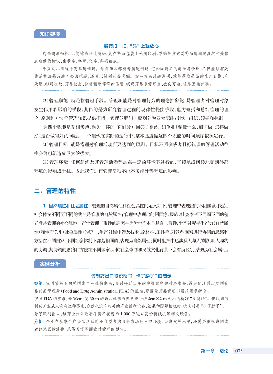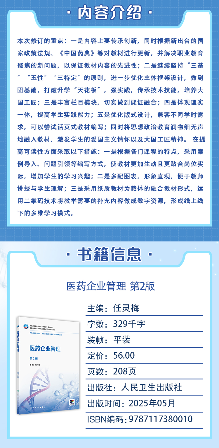 本次修订的重点:一是内容上要传承创新,同时根据新出台的国家政策法规、《中国药典》等对教材进行更新,并解决职业教育聚焦的新问题,以保证教材内容的先进性;二是继续坚持“三基”“五性”“三特定”的原则,进一步优化主体框架设计,做到固基础,打破升学“天花板”,强实践,传承技术技能,培养大国工匠;三是丰富栏目模块,切实做到课证融合;四是体现理实一体,提高学生实践能力;五是优化版式设计,兼容不同学时需求,可以尝试活页式教材编写;同时将思想政治教育润物细无声地融入教材,激发学生的爱国主义情怀以及大国工匠精神。 在提高可读性方面采取以下措施:一是根据各门课程的特点,采用案例导入、问题引领等编写方式,使教材更加生动且更贴合岗位实际,增加学生的学习兴趣;二是多配图表,形象直观,便于教师讲授与学生理解;三是采用纸质教材为载体的融合教材形式,运用二维码技术将教学需要的补充内容做成数字资源,形成线上线下的多维学习模式。