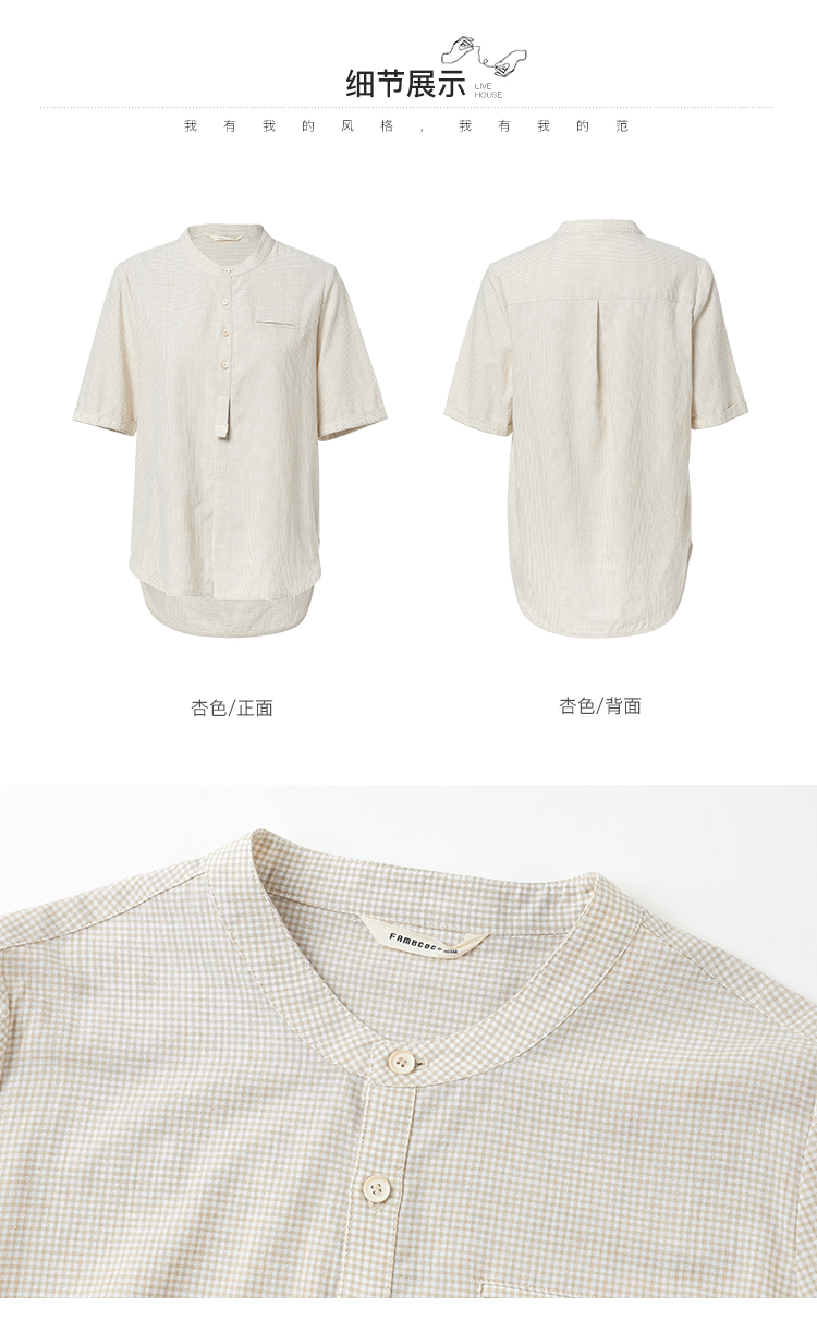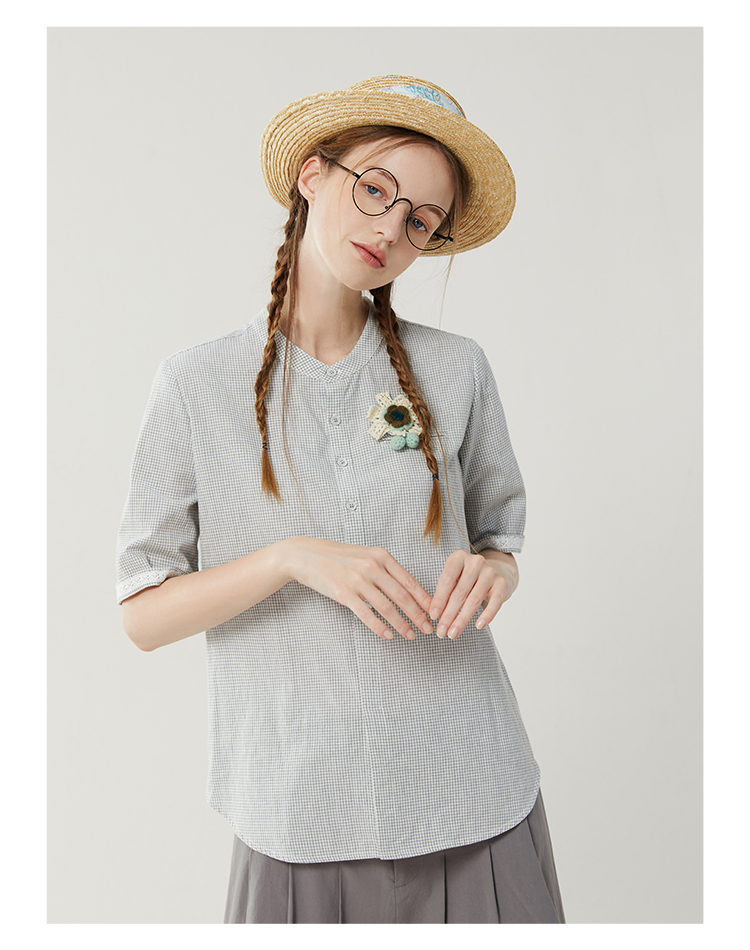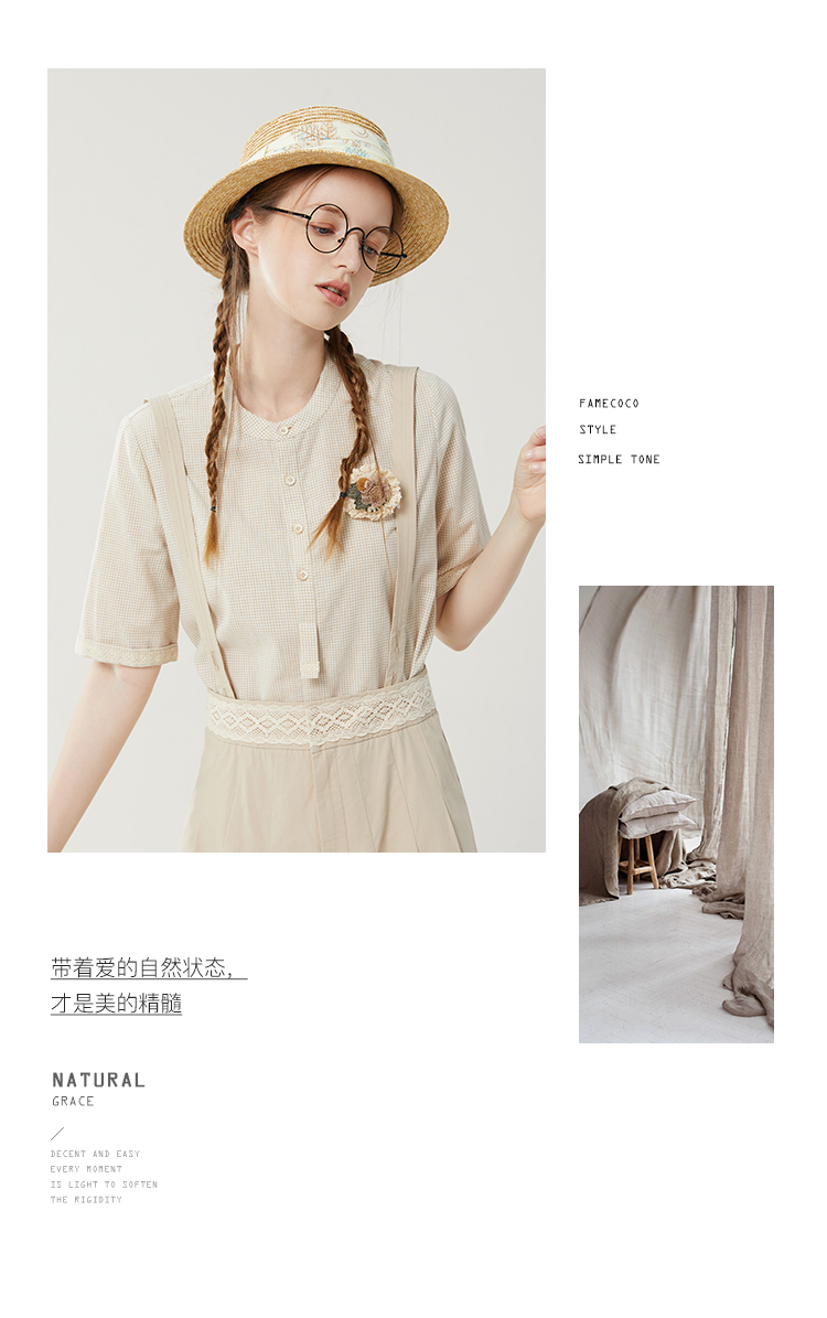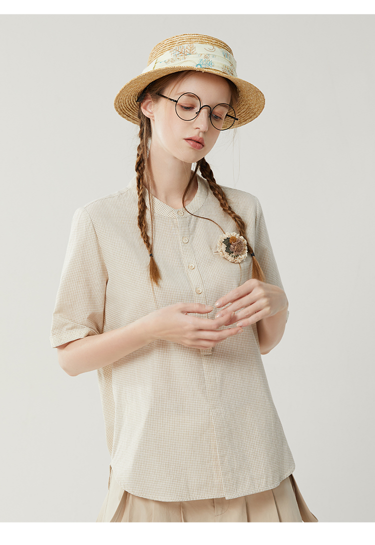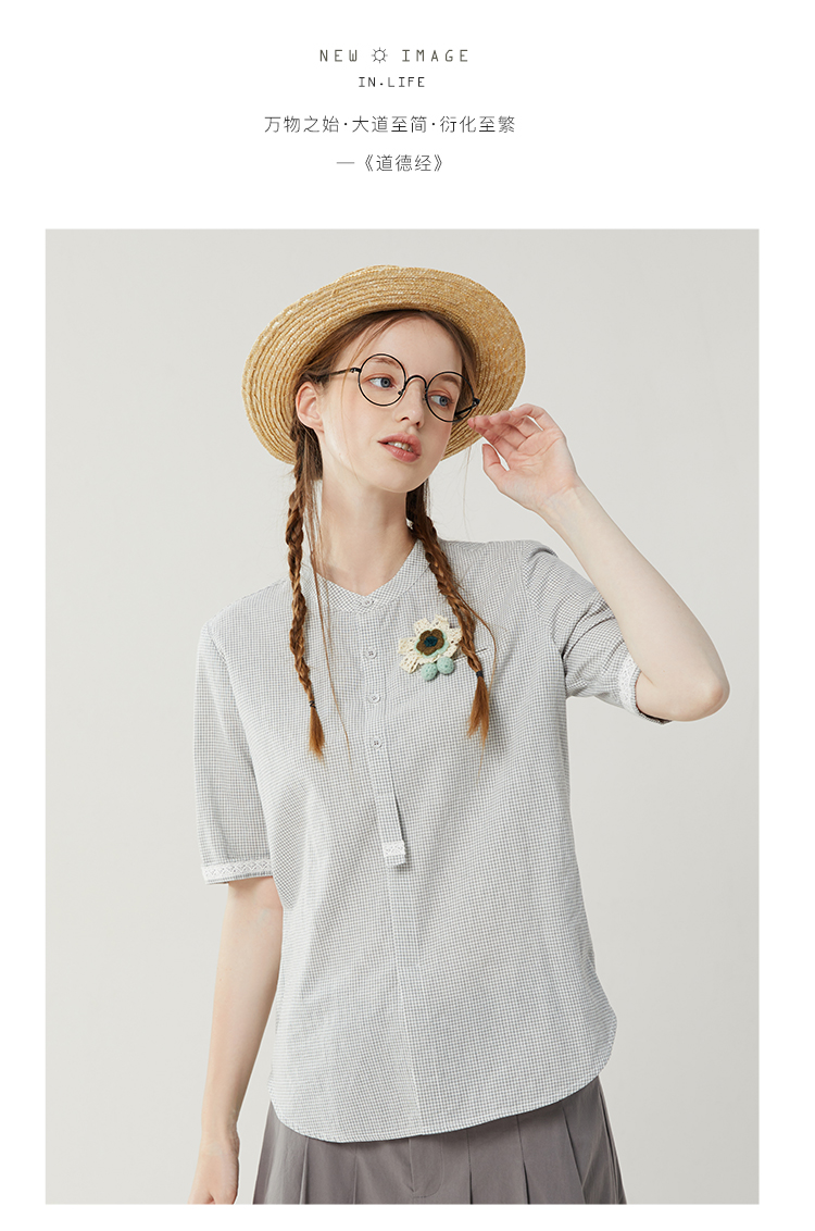 famecoco范可儿纯棉格子衬衫女夏款文艺绣花半袖套头衫FAB3BD015