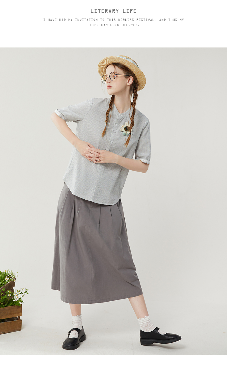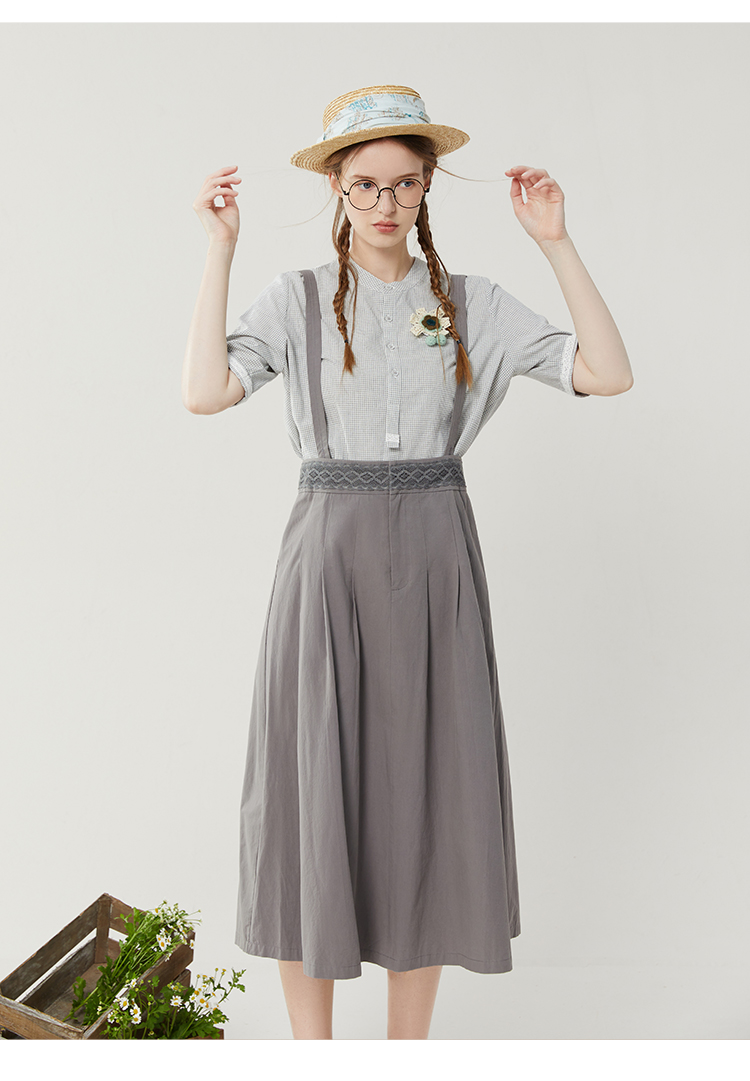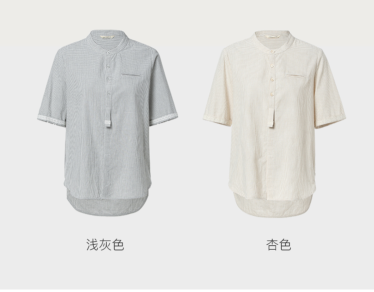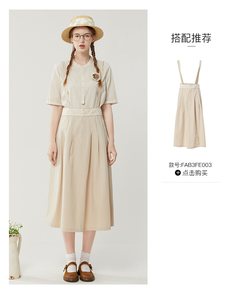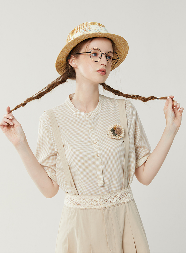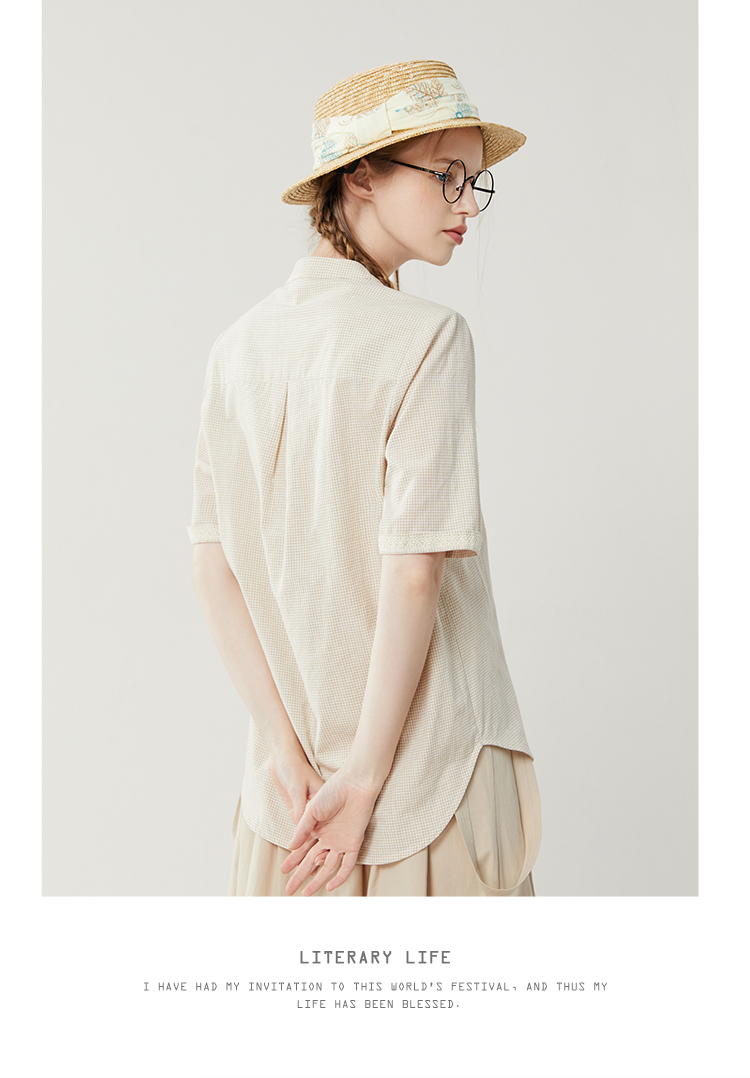famecoco范可儿纯棉格子衬衫女夏款文艺绣花半袖套头衫FAB3BD015