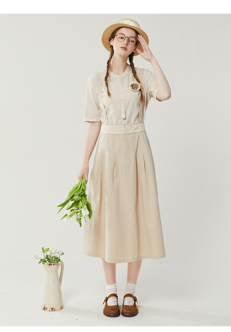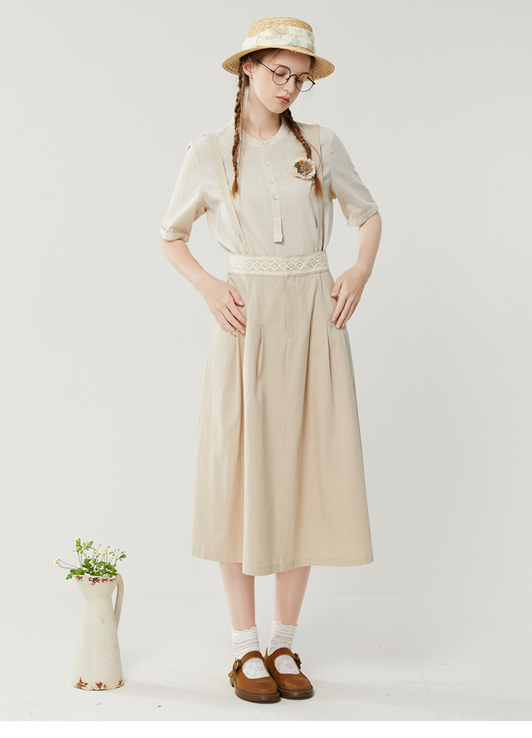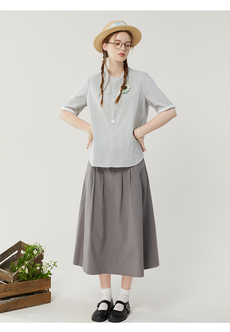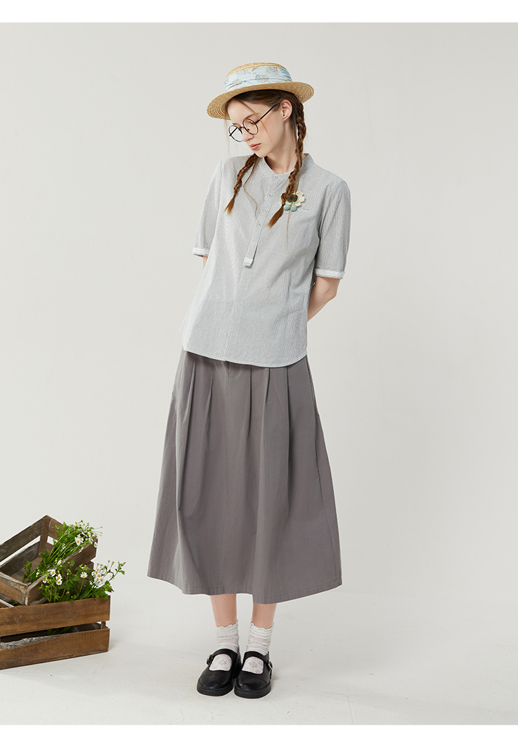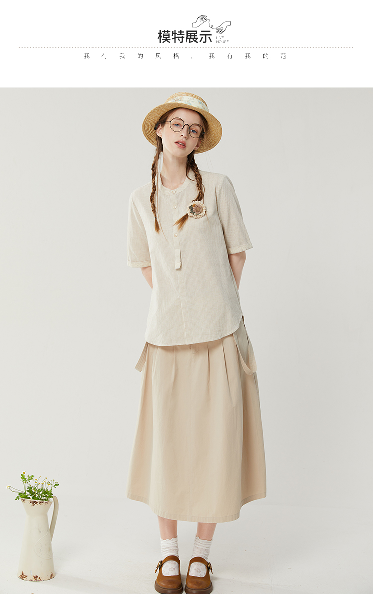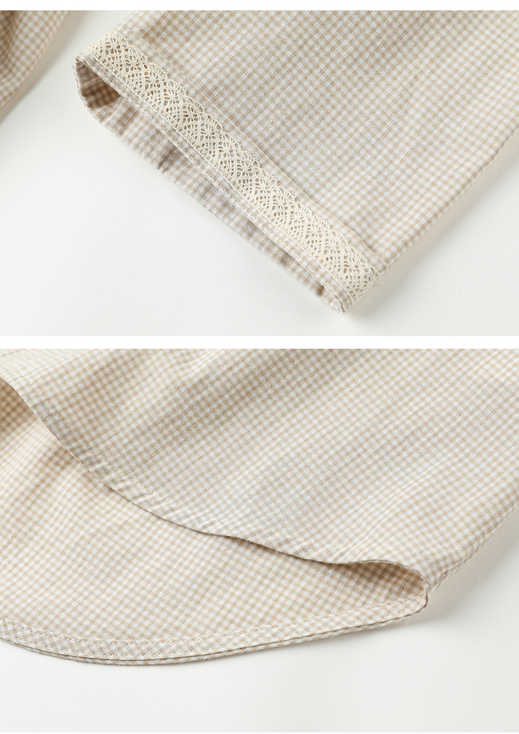 famecoco范可儿纯棉格子衬衫女夏款文艺绣花半袖套头衫FAB3BD015
