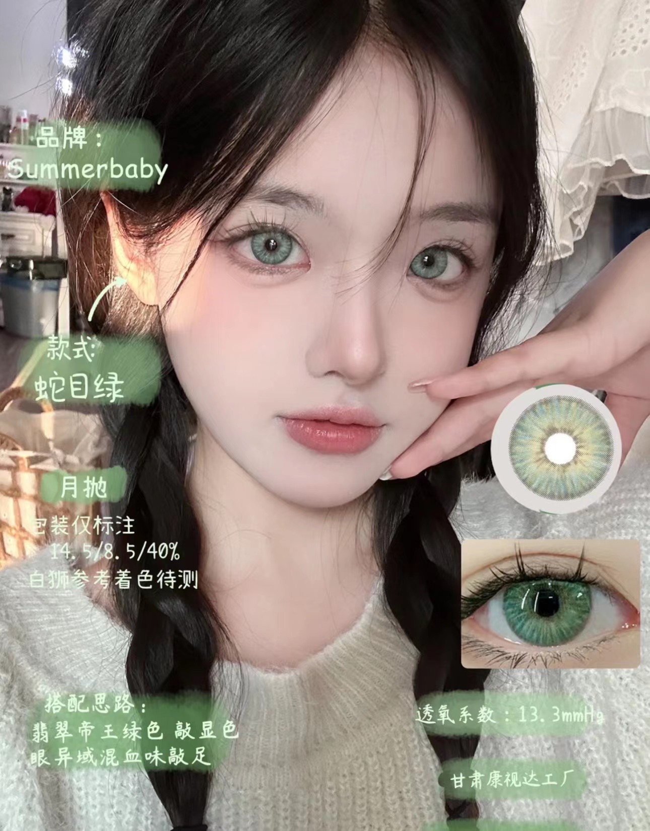 蛇目绿 直径14.5 染色14.1 基弧8.5 含水量40%