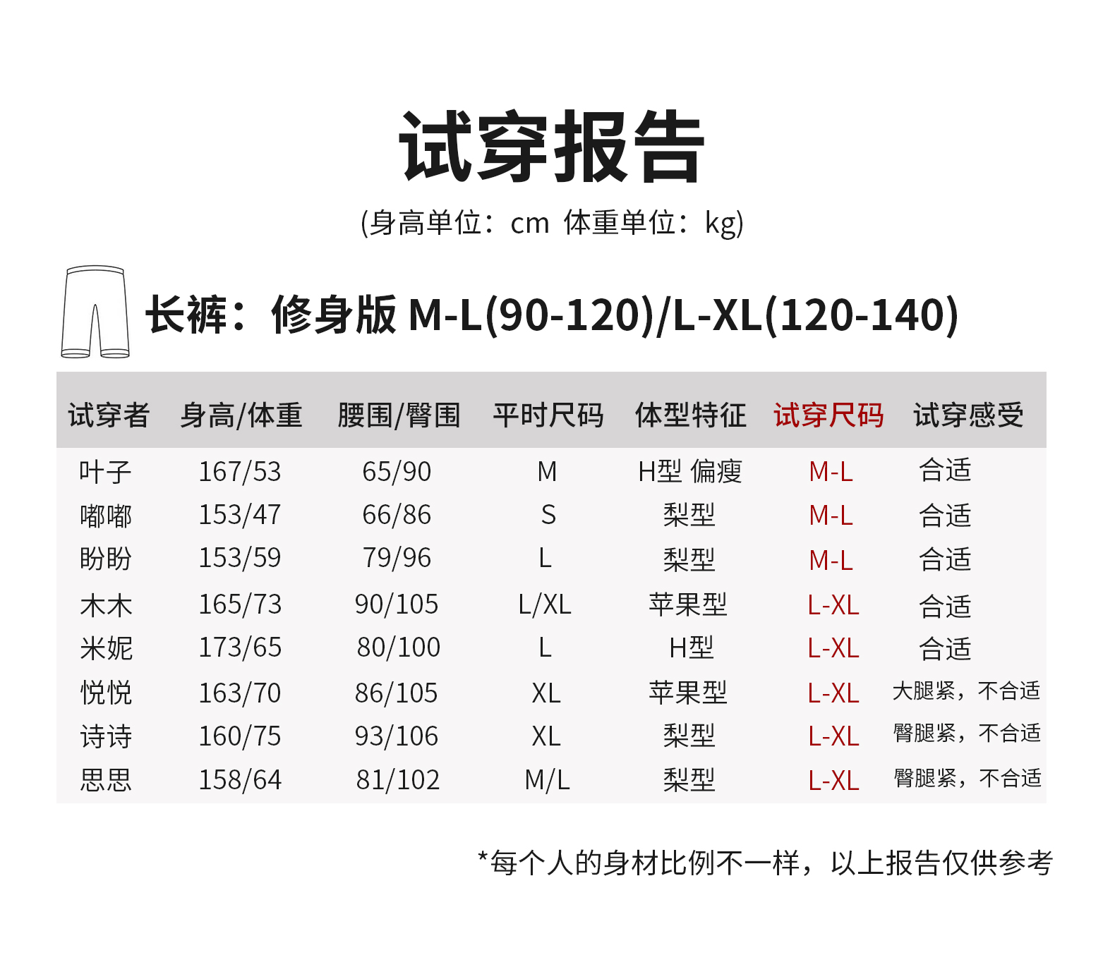 【尺码】 M-L:适合90~120斤 臀围95cm以下 L-XL :适合120~140斤 臀围95cm~105cm