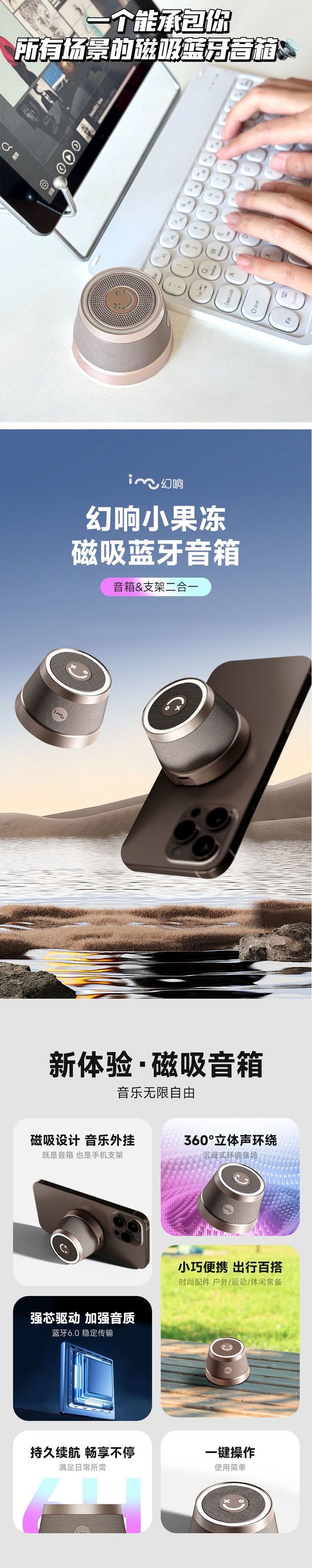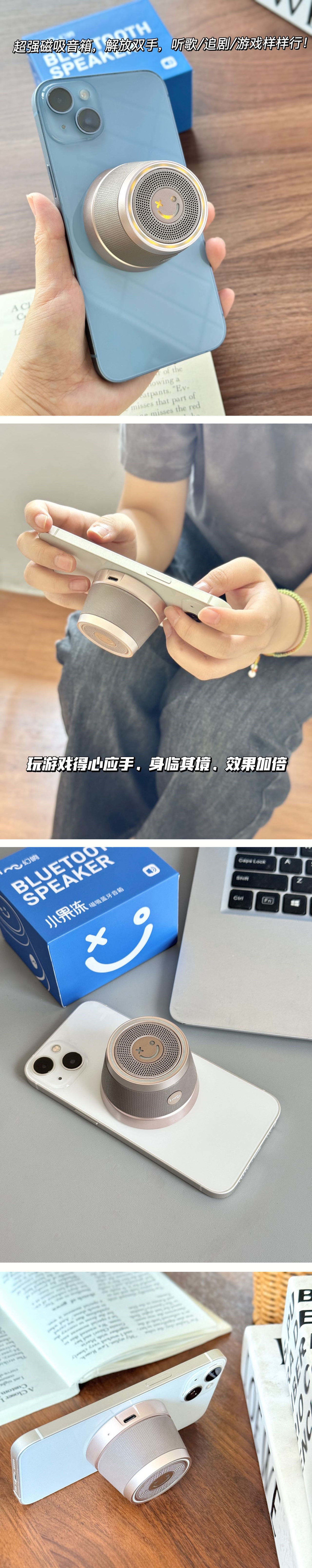 mini蓝牙音箱|已经卷到这种地步了吗❗❗ 幻响小果冻这尺寸,比掌心还小一圈 平时出行带着超级方便 追剧时吸在手机背面,既是音箱又是支架,双手直接解放 就连出门散步,往包侧一塞,走哪都能带着“移动BGM” 关键是还有强磁吸附功能,随便往金属物件上一靠就稳稳吸住❗❗ 续航也够久,足够撑个大半天,这实用性真的没话说