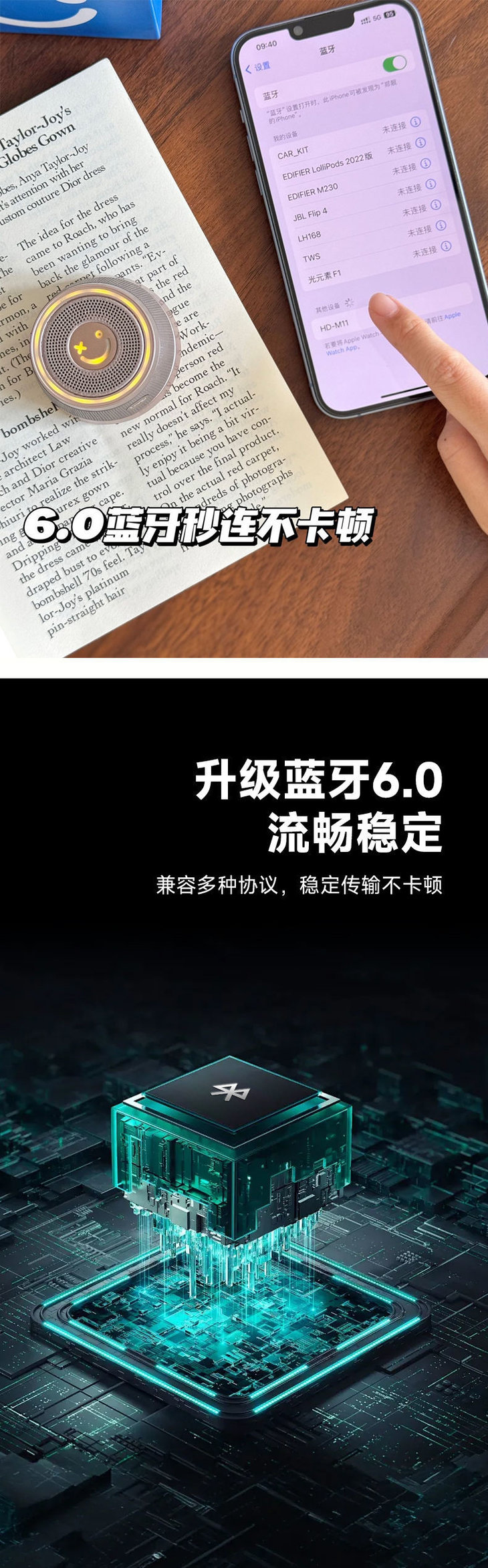 ✅蓝牙6.0连接稳定,适配多数使用场景 它用的是最新蓝牙6.0版本,连接又稳又快,听歌看剧声音清楚还立体,简直没谁了 第一次配对时,手机打开蓝牙后很快就能搜到设备,连接过程超简单,不用复杂操作 第二次使用时,打开音箱会自动和上次连接的设备配对,不用重复设置,超省心 连接稳定性也不错,在无障碍的环境下,10米范围内基本不会断连,在家走动时拿着手机,声音不会突然卡顿❗❗ 看视频、打游戏时,音画同步比较好,不会有明显的延迟,对日常使用来说,这种连接表现足够可靠