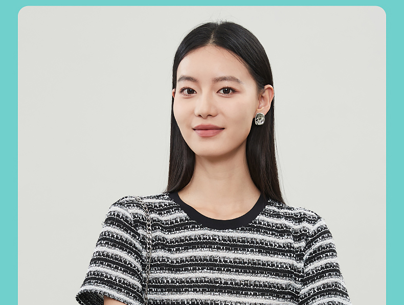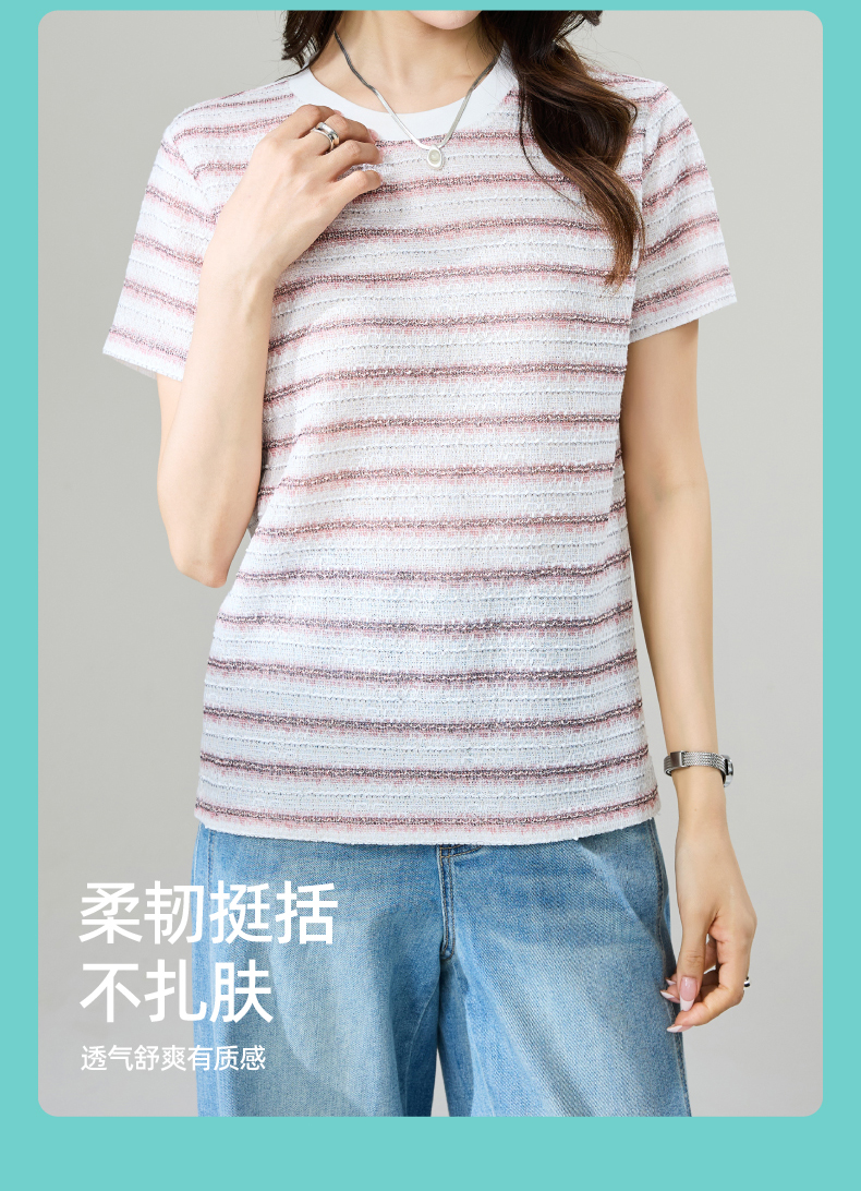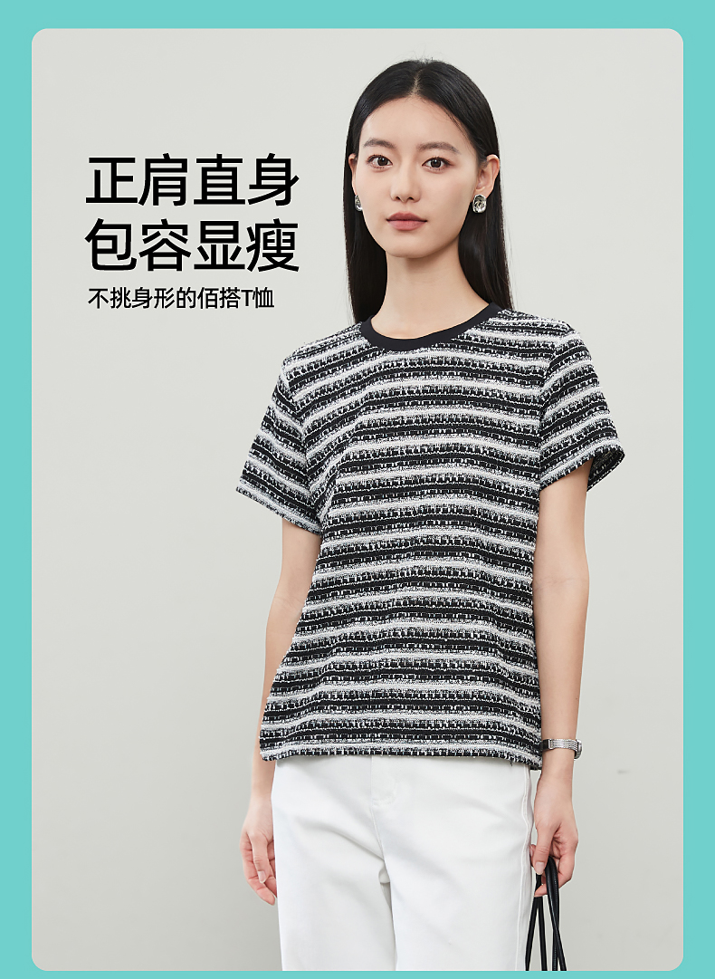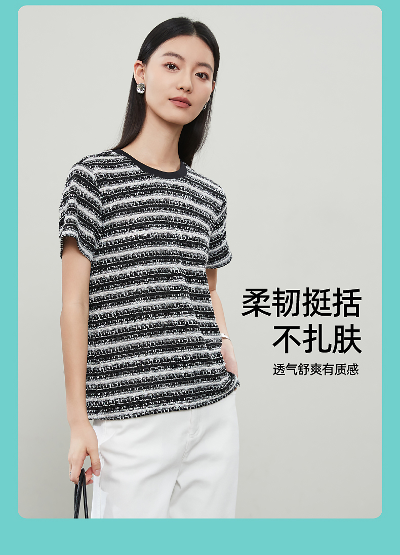 【最后库存、小香风-条纹T恤】逸阳夏新款黑白条纹正肩圆领气质上衣5135