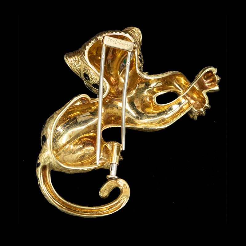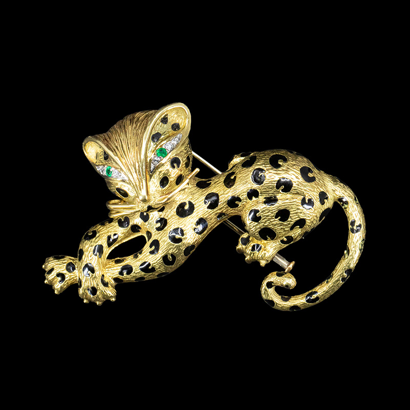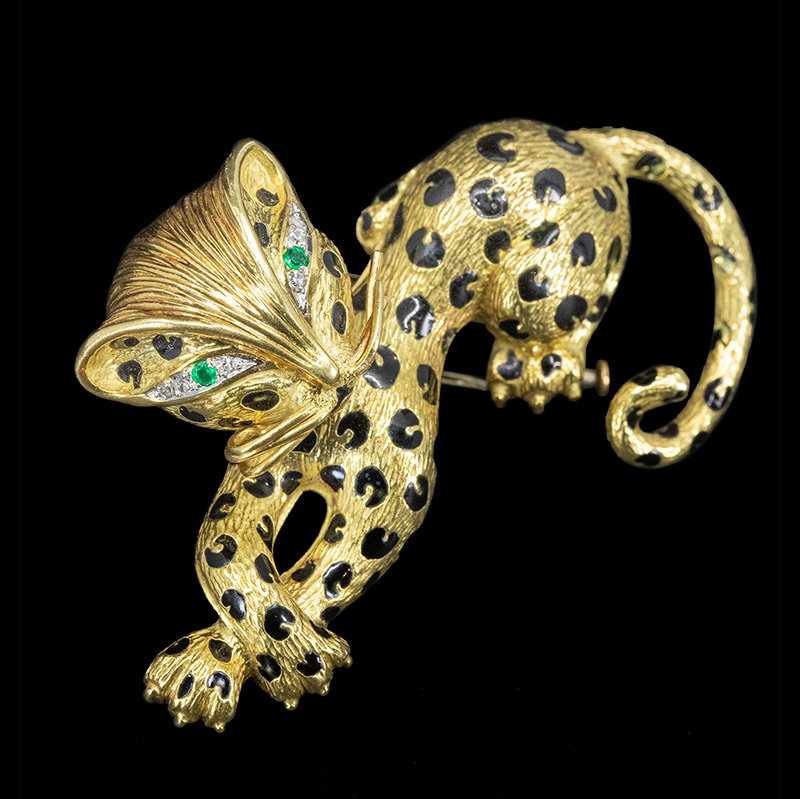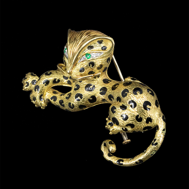 1980年代法国出品18K黄金镶嵌祖母绿钻石及珐琅猎豹造型胸针