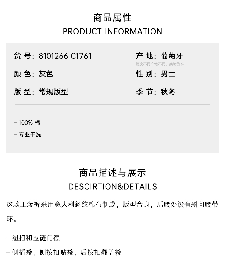 BURBERRY 巴宝莉 男士棉质华达呢工装裤 灰色 8101266 C1761