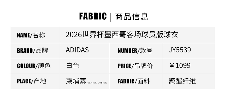 SFS阿迪达斯Adidas2026世界杯墨西哥客场球员版球衣足球服 JY5539