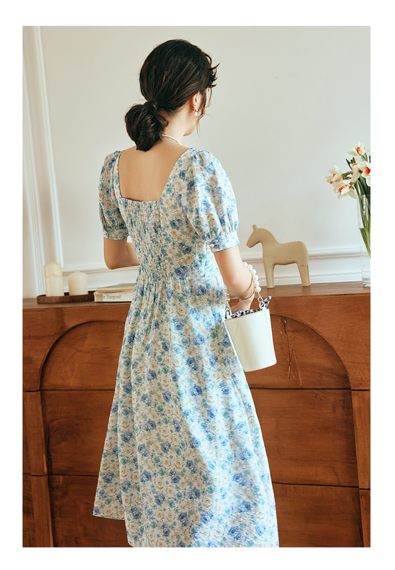 OLrain欧芮儿法式方领碎花连衣裙女夏季2023年新款收腰轻薄茶歇裙