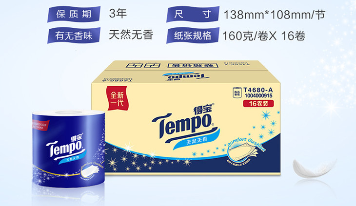 Tempo源自德国1929 得宝卷纸 4层160g 有芯卷筒纸巾 天然无香 德宝 整箱销售 柔韧升级 新包装随机发货