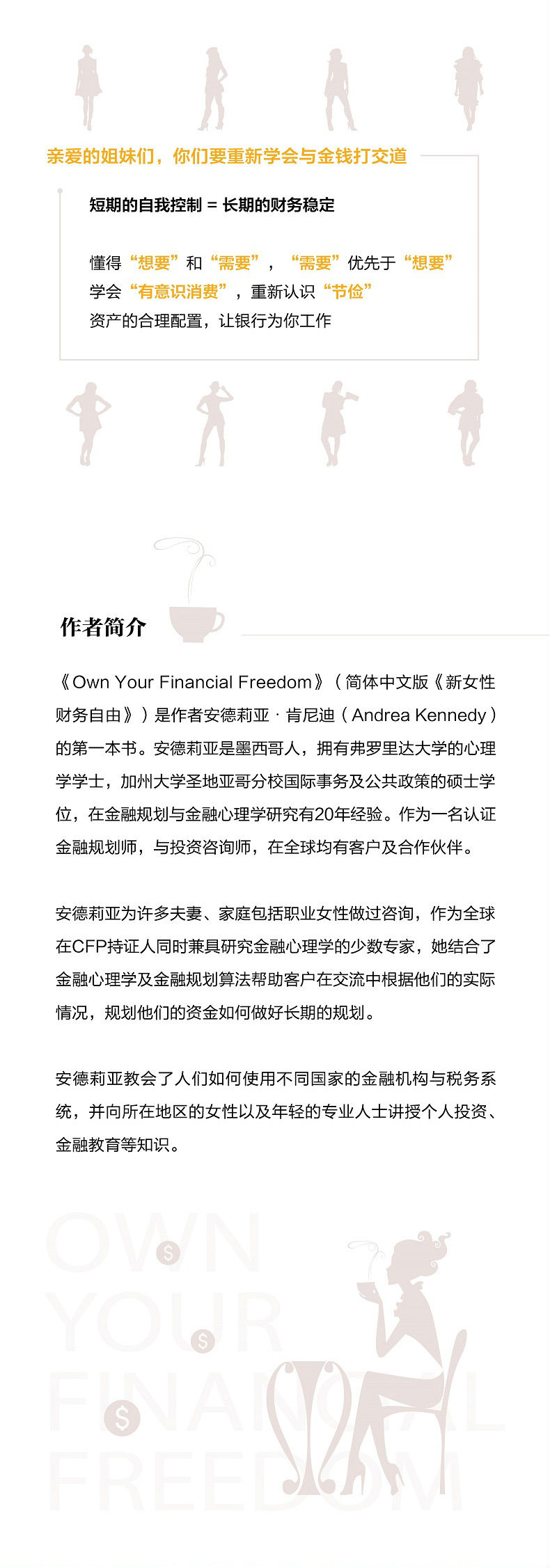 本书给女性朋友实用的理财方法,无论是职场女性还是家庭主妇,无论是进入婚姻状态还是离开婚姻状态,都有适合女性朋友的理财方式。书中还有对女性朋友心理上的辅导,正确认识自己的价值,认真对待生活的每一天,让我们的生活越来越有规划,越来越有安全感。实现财务自由,什么角色的女人都有机会办得到。