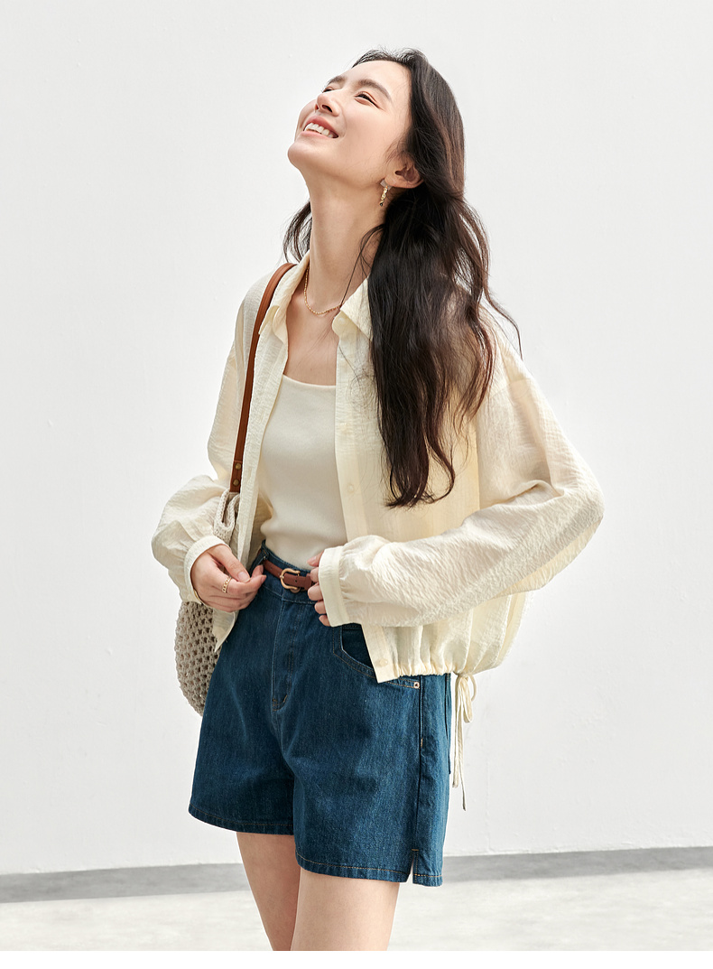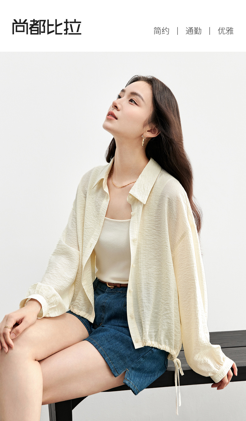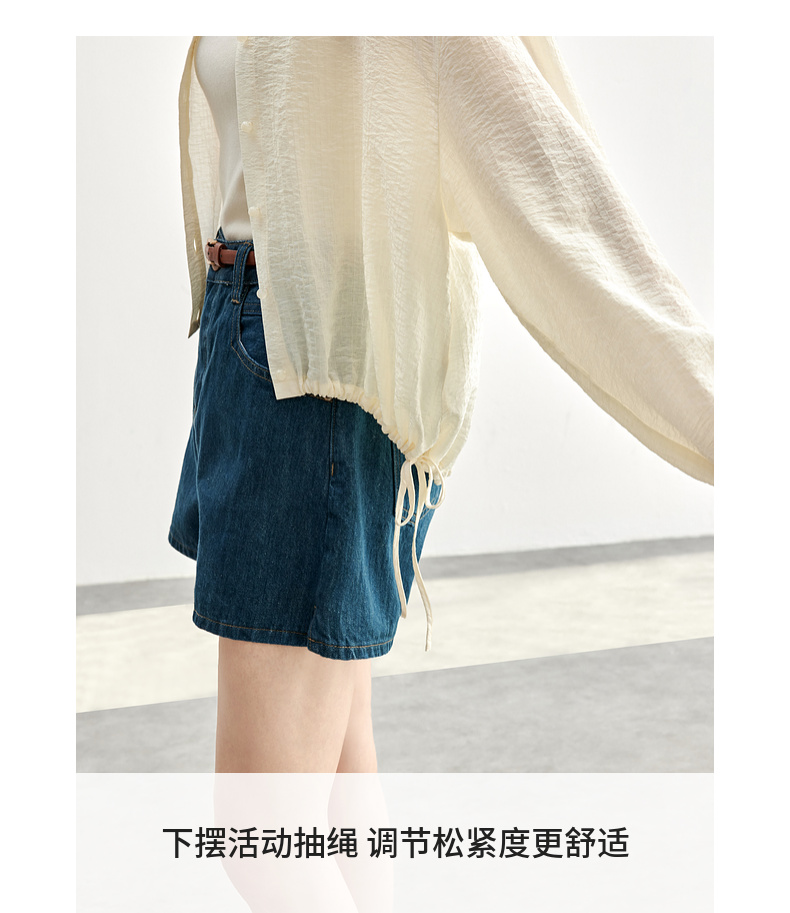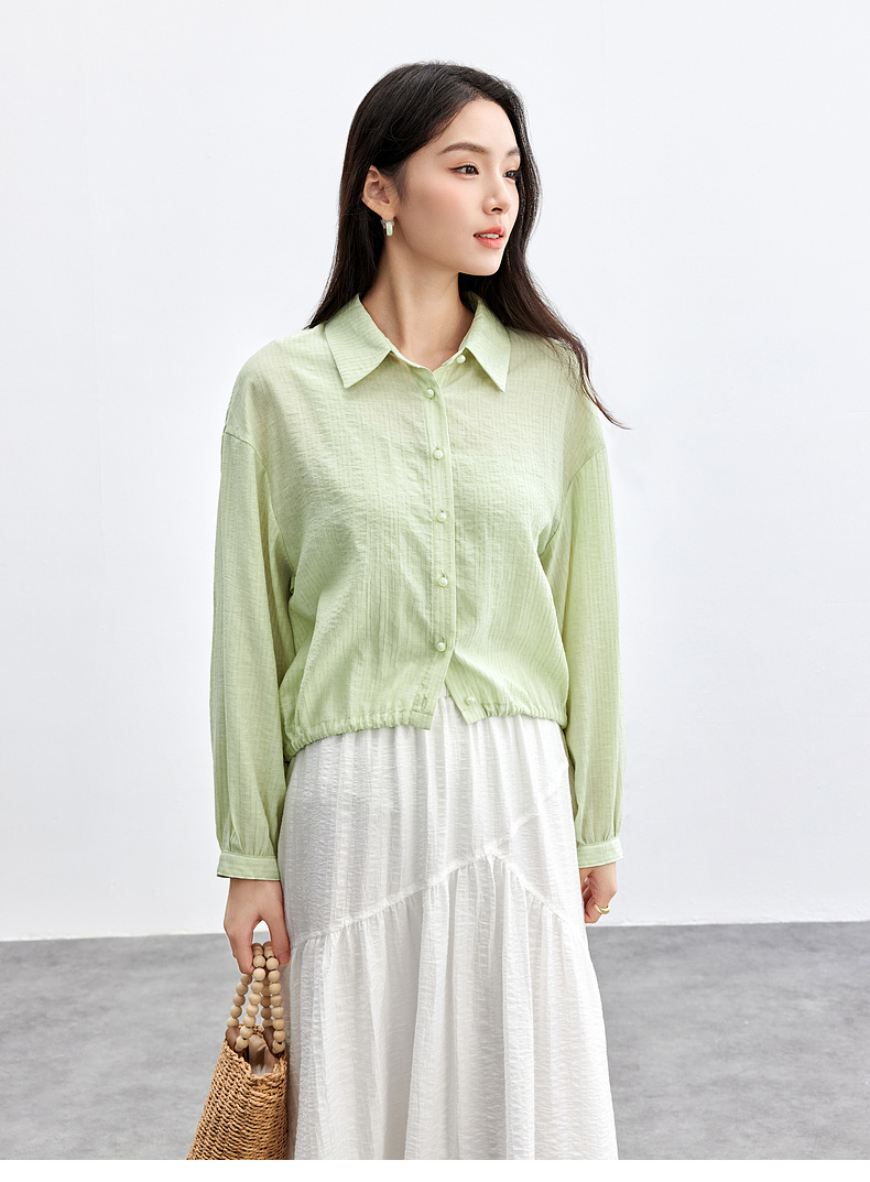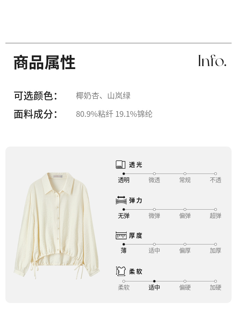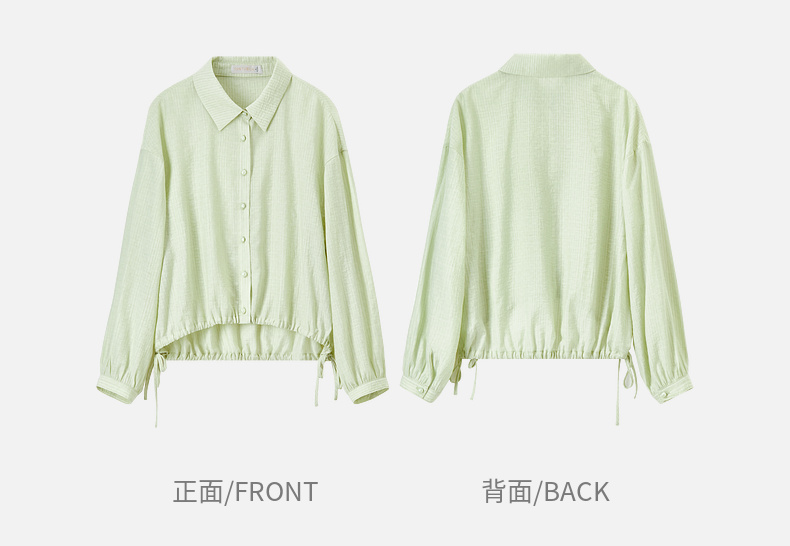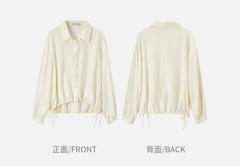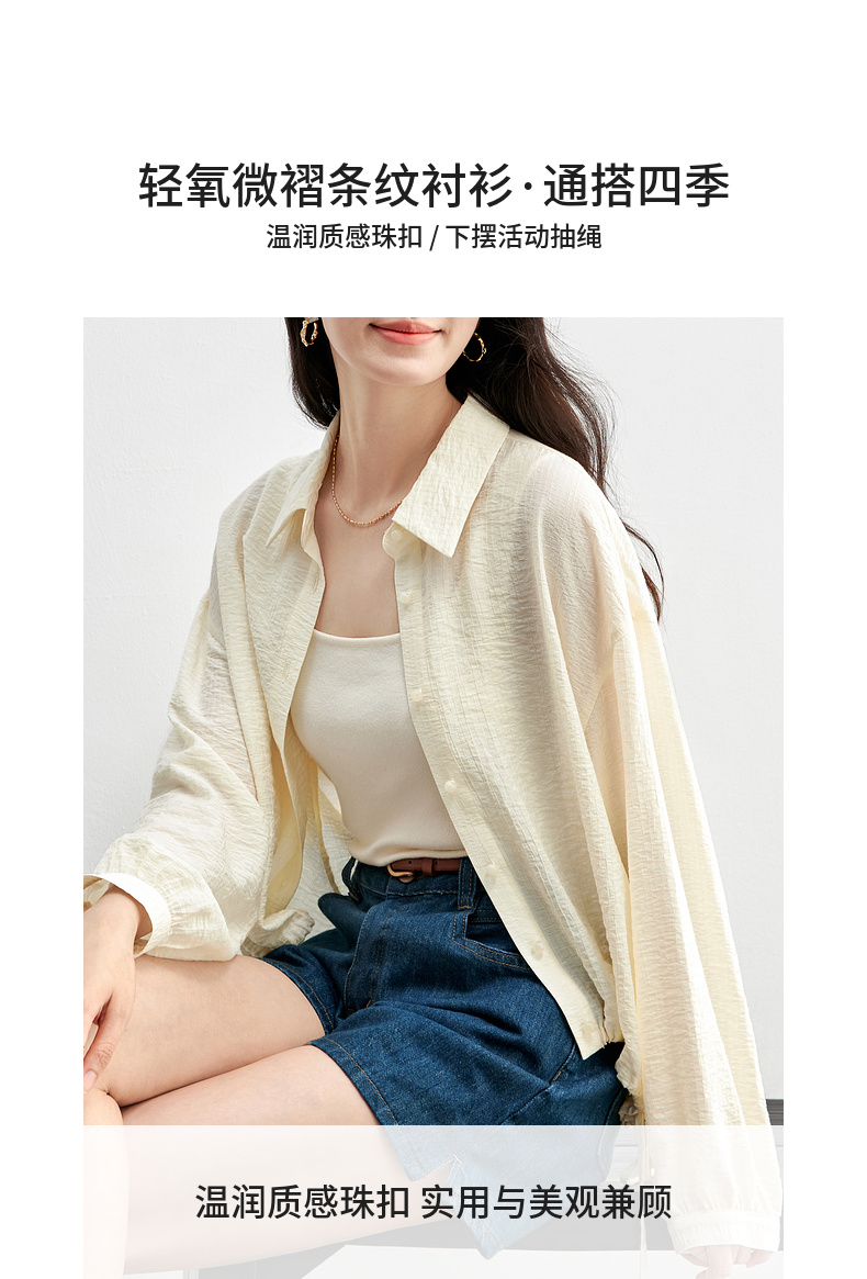 【内购】翻领珠扣下摆抽绳宽松落肩长袖条纹肌理遮阳衬衫-151C57892