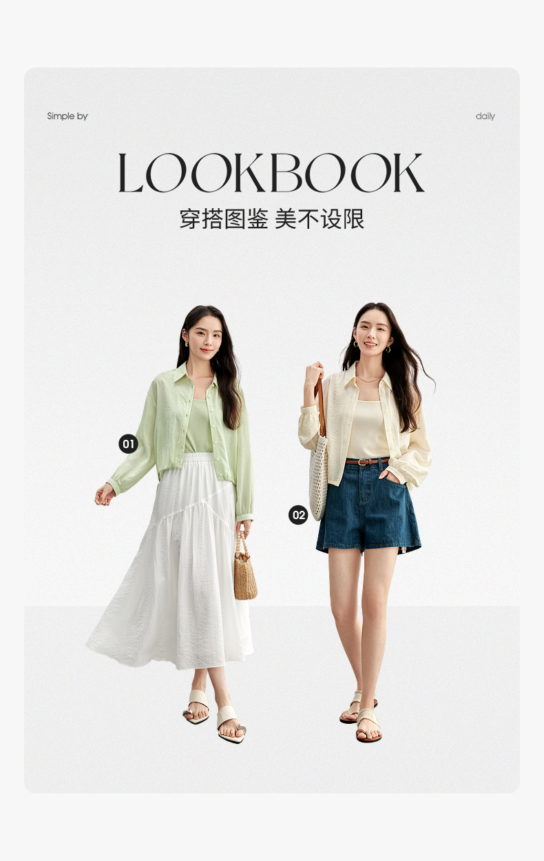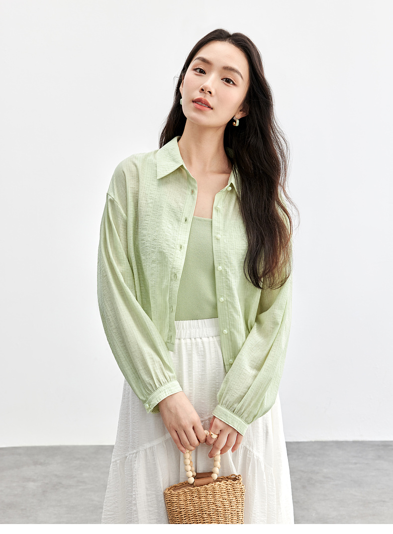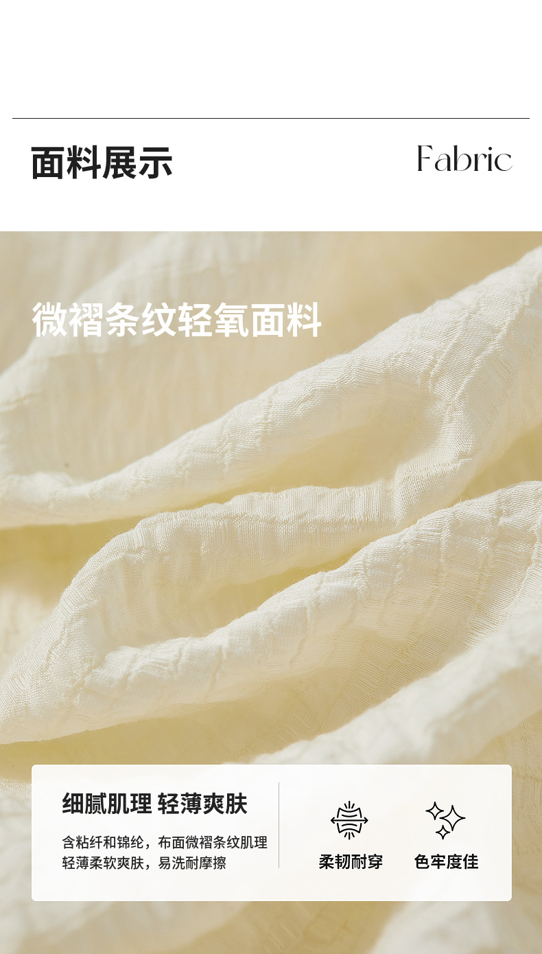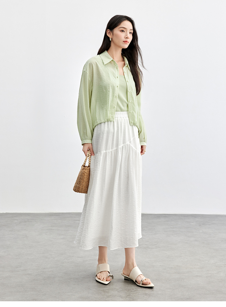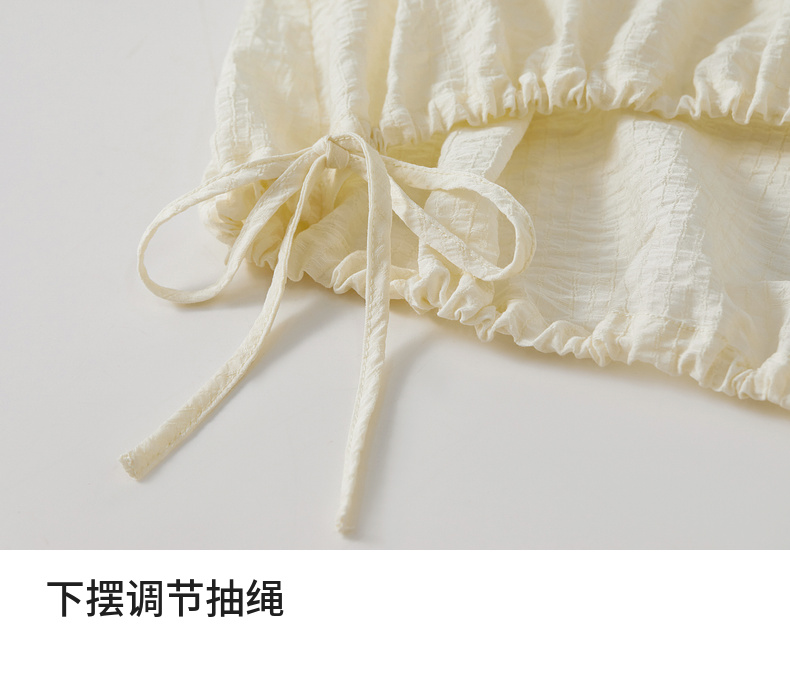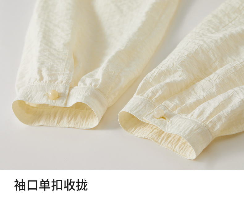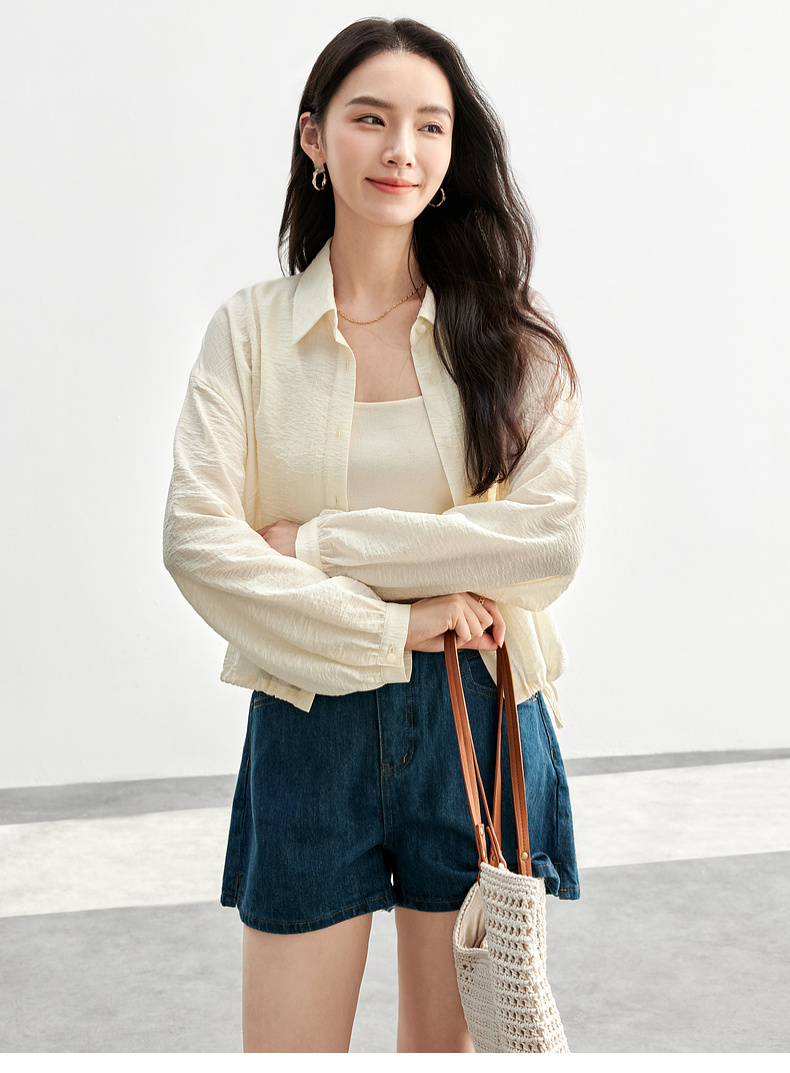 【内购】翻领珠扣下摆抽绳宽松落肩长袖条纹肌理遮阳衬衫-151C57892