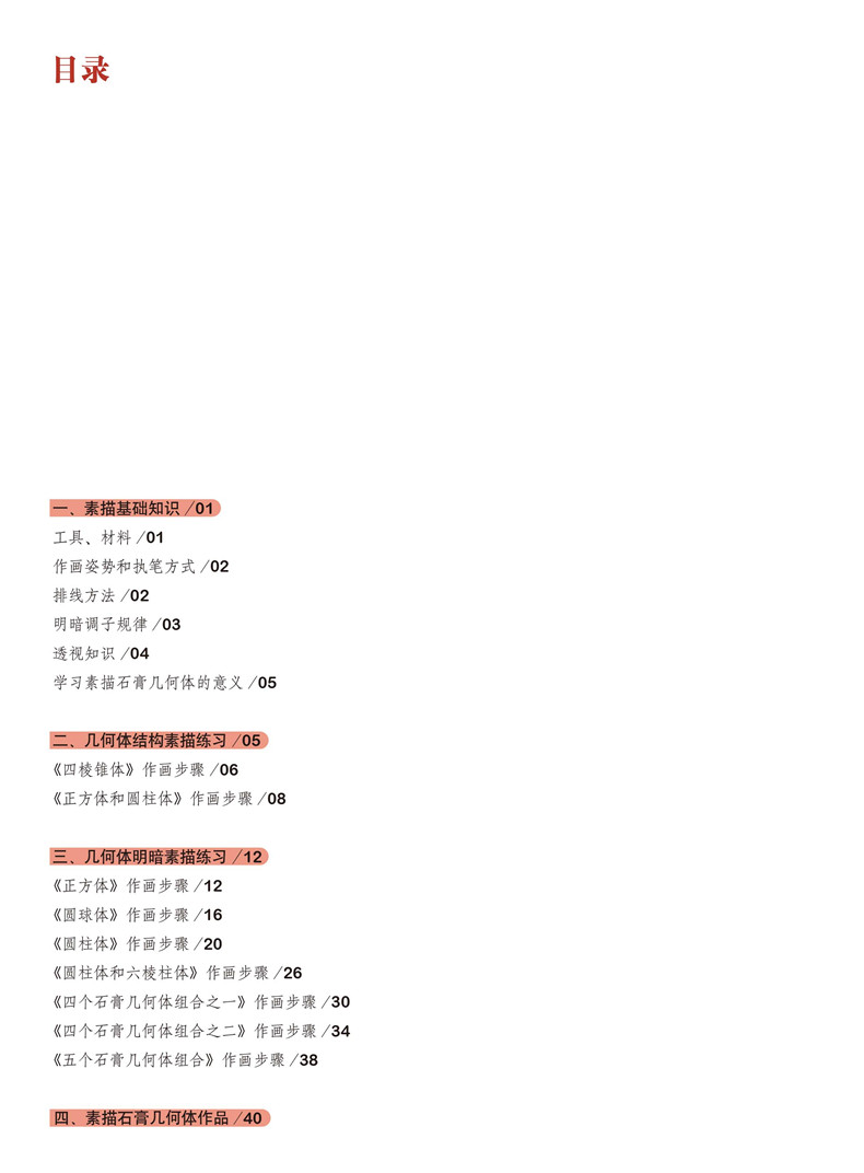 《起步教程:石膏几何体(升级版)》分四部分:*部分内容为绘画工具介绍;部分为作画前需了解的一些基础知识,括作画姿势和角度选择、用线要求、排线方法、理解几何体、常见透视、黑白灰面及五大调、结构造型起步;第三部分为不同石膏几何体的作画步骤详解;第四部分为石膏几何体范画临摹与欣赏。