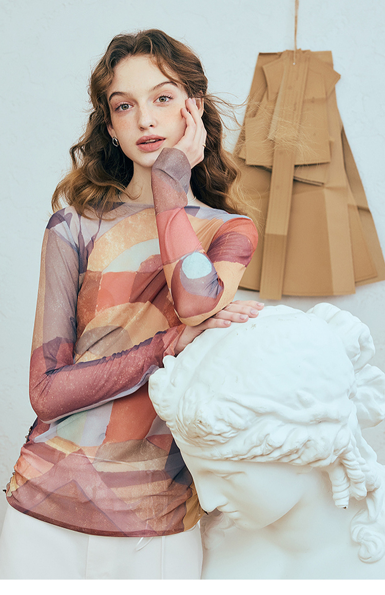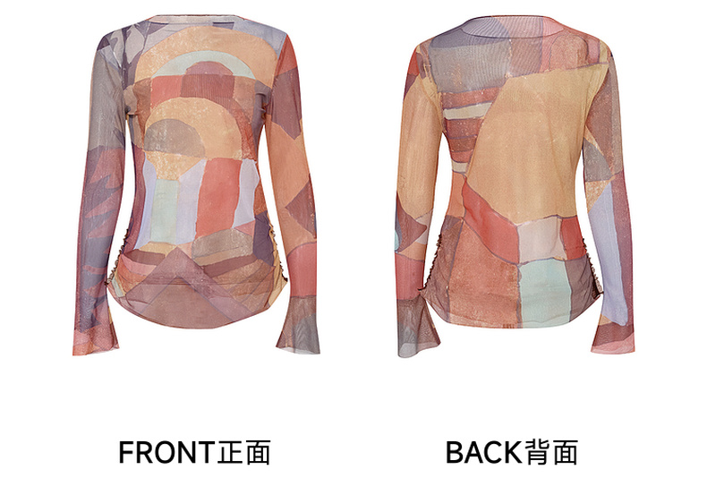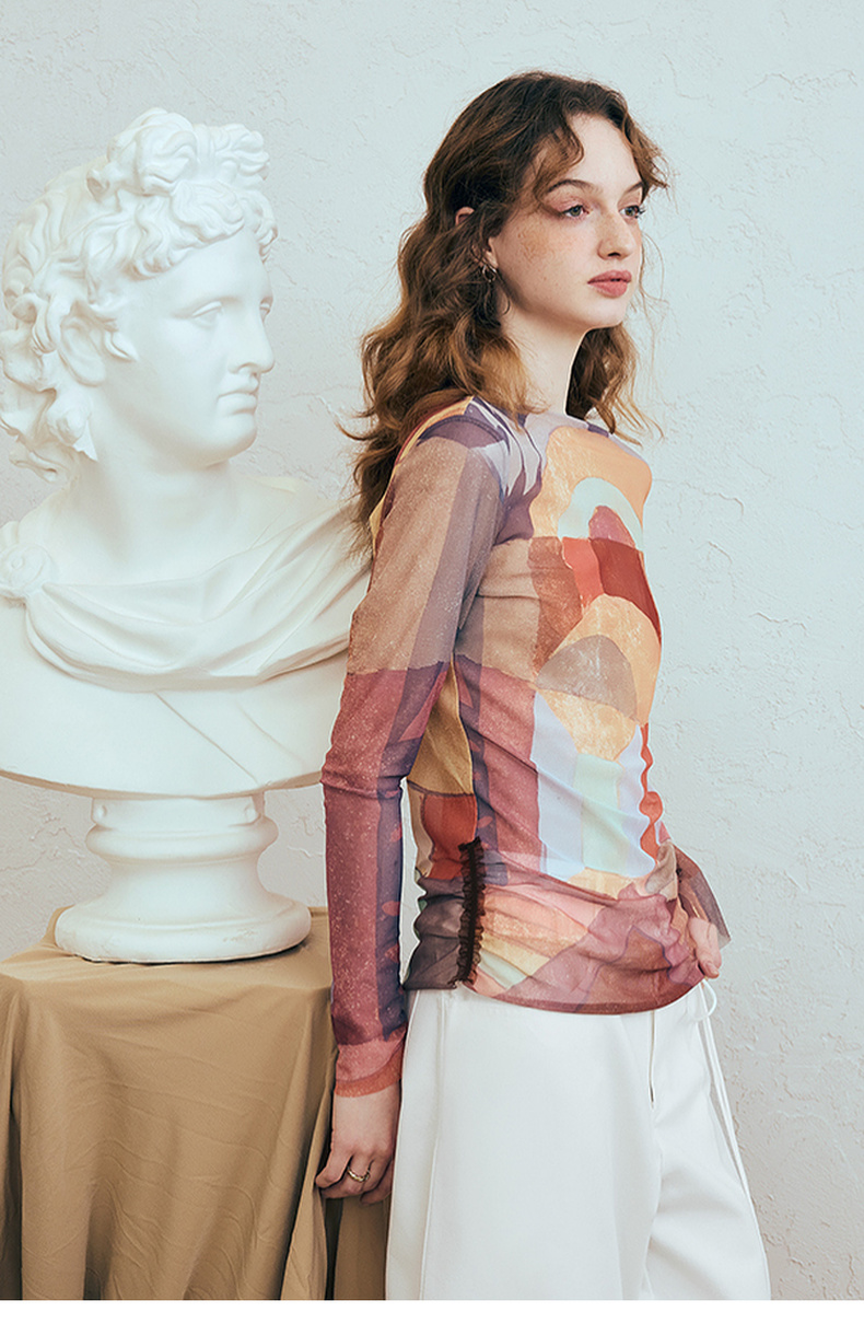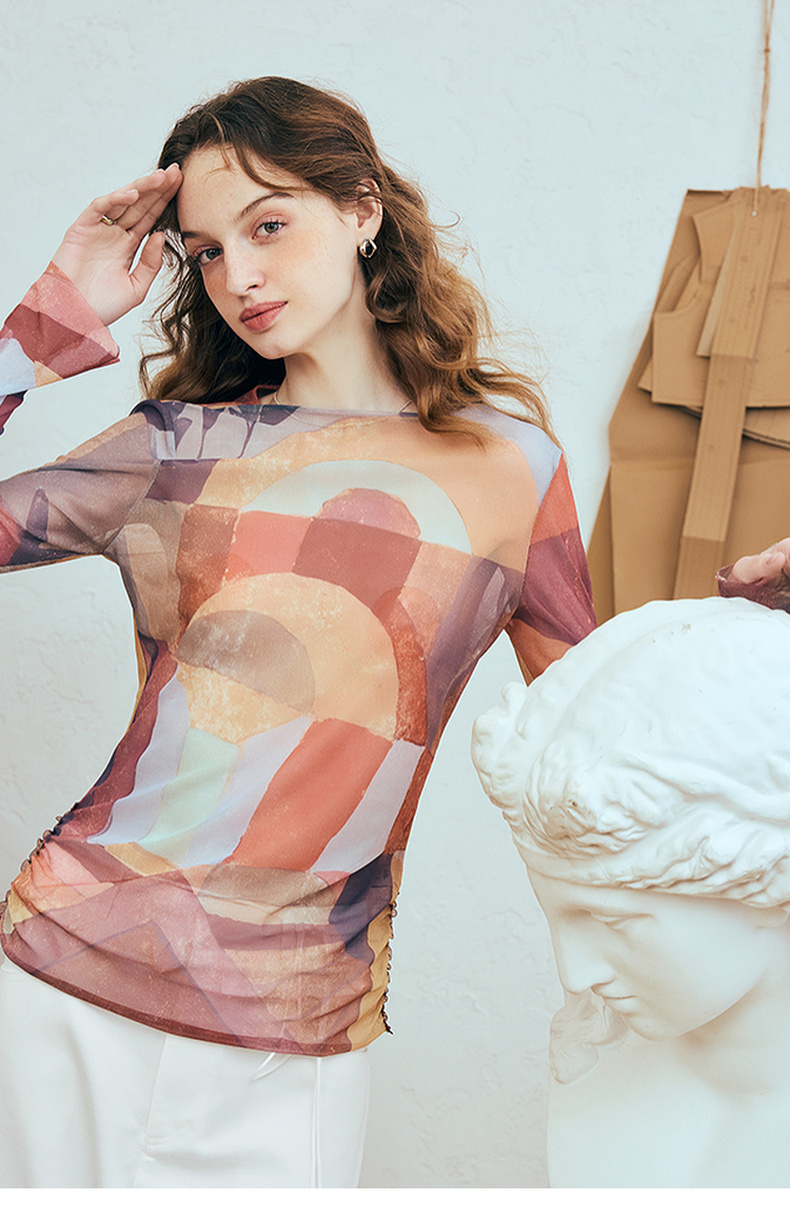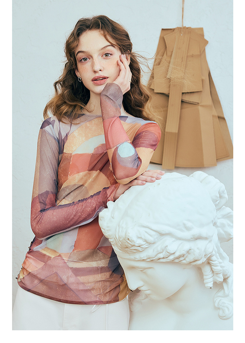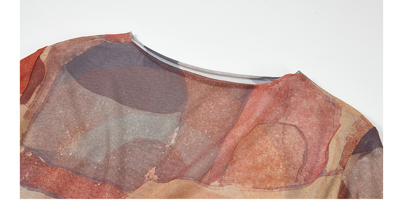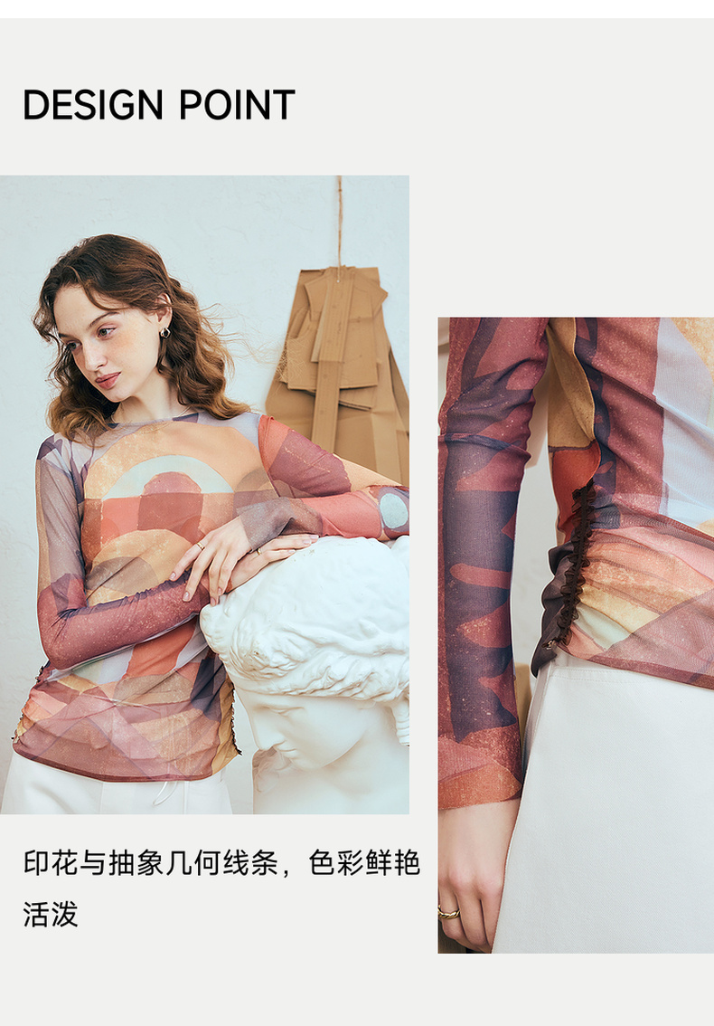 两三事 幻视空间 2025夏季新款时尚抽象印花网布透视打底衫女t恤