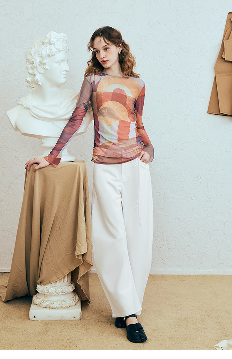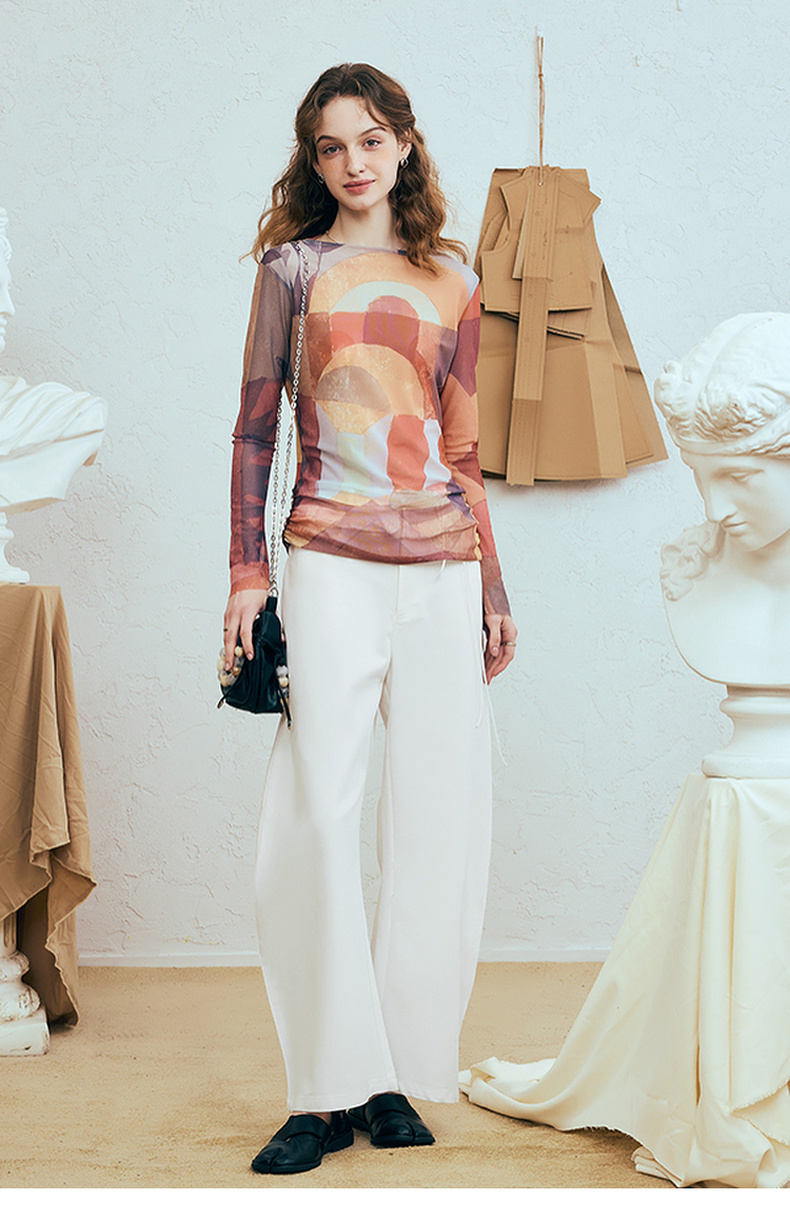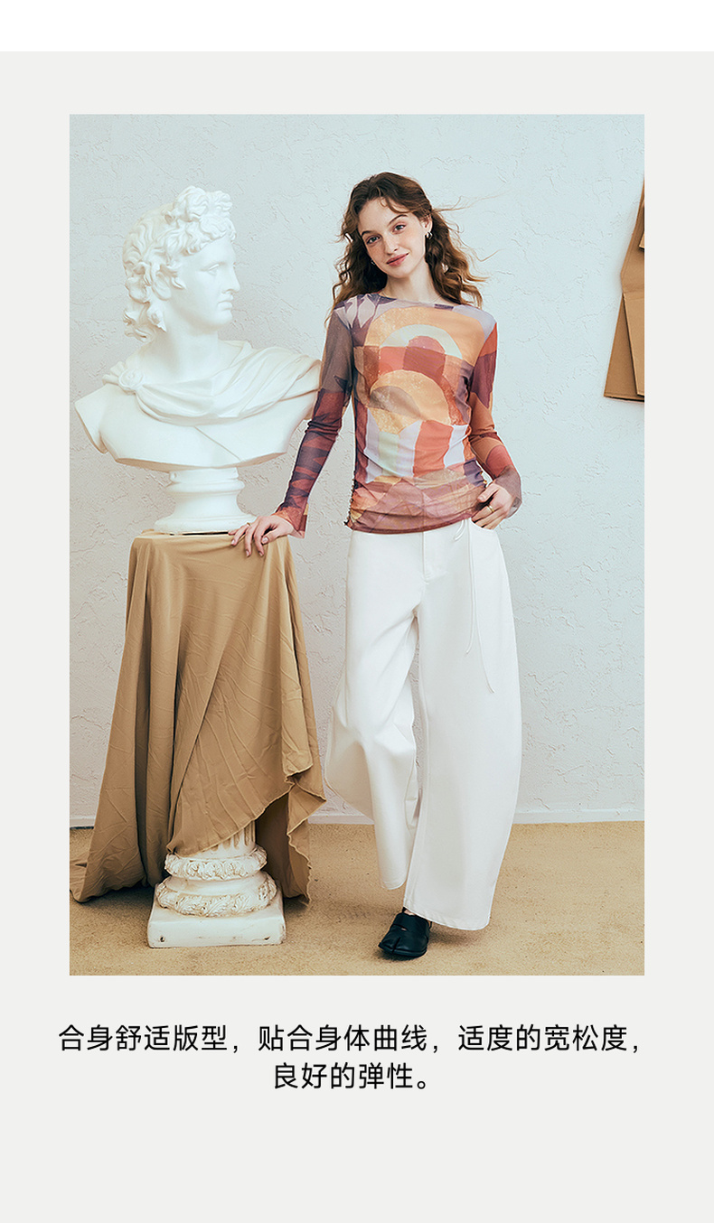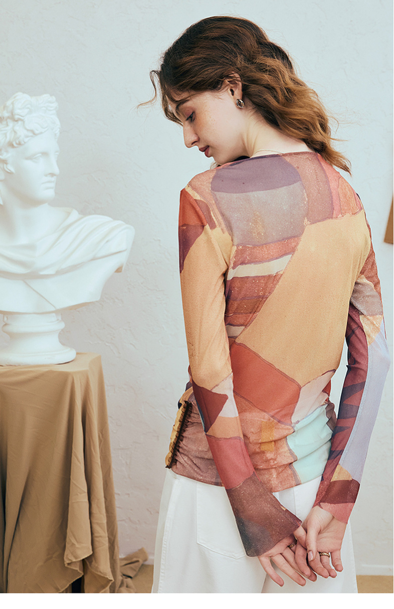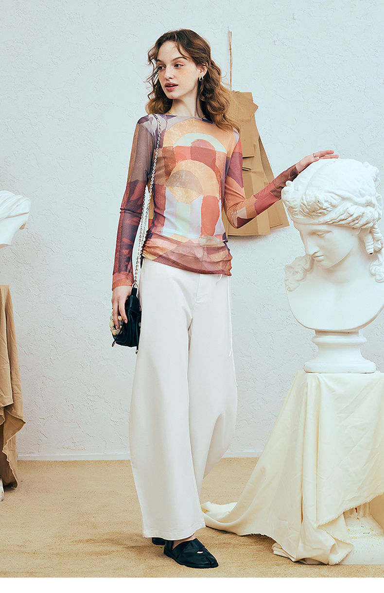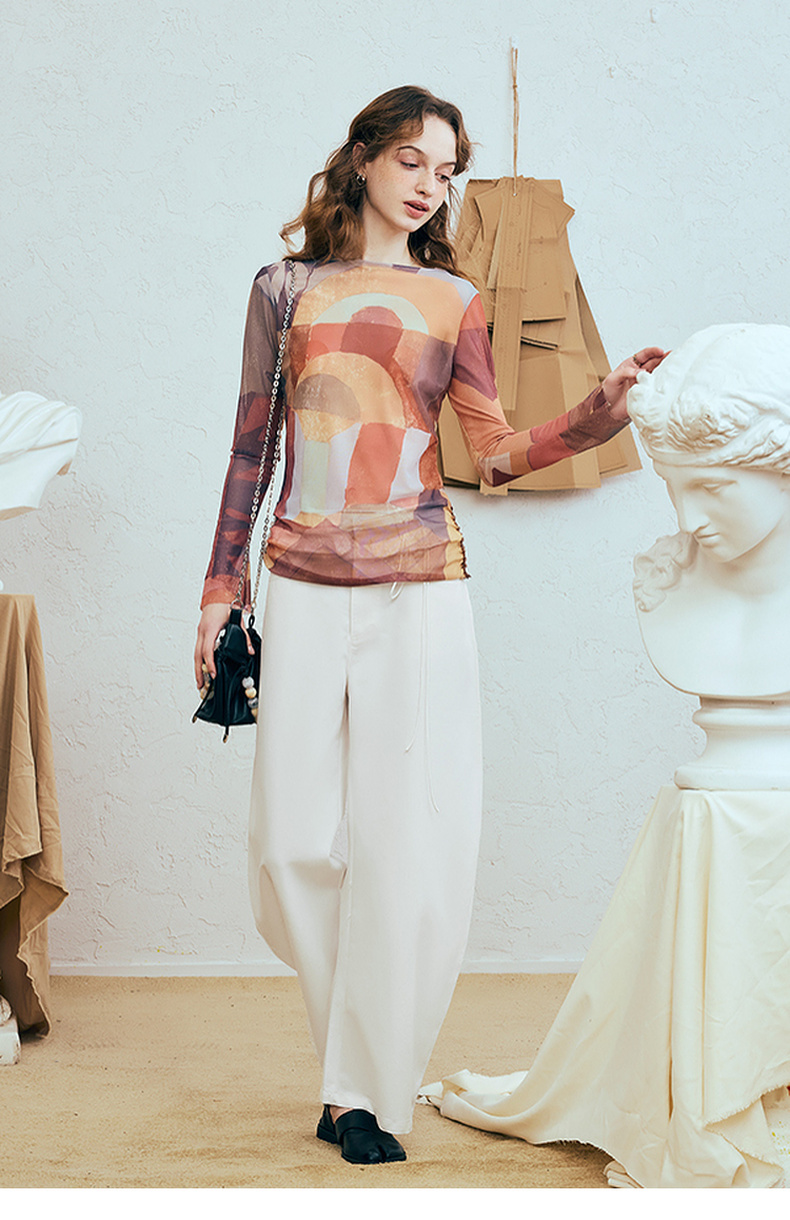 两三事 幻视空间 2025夏季新款时尚抽象印花网布透视打底衫女t恤
