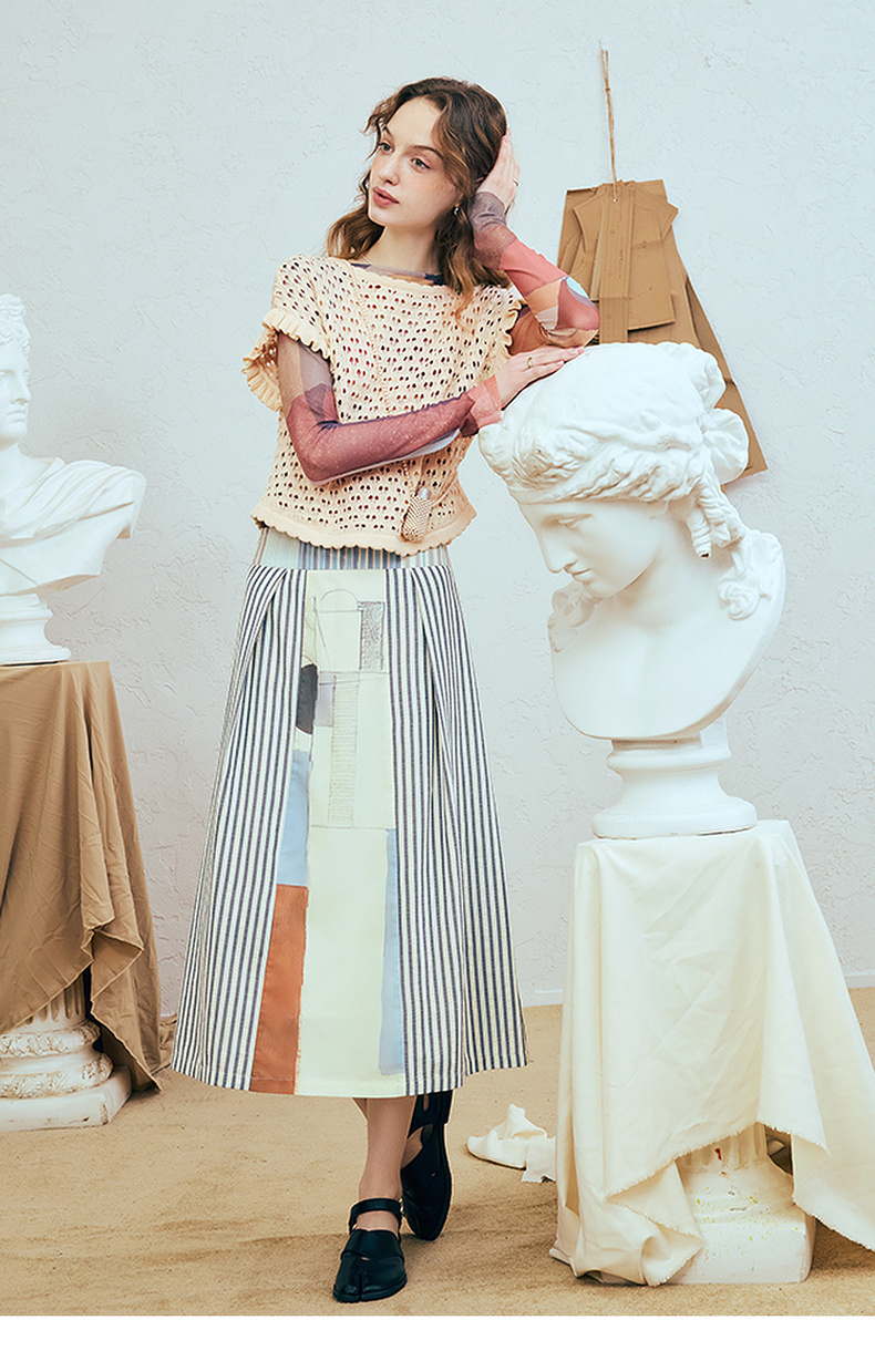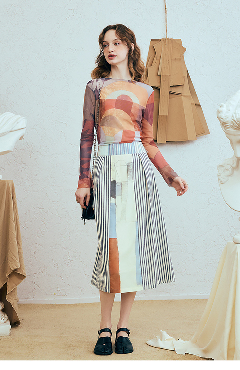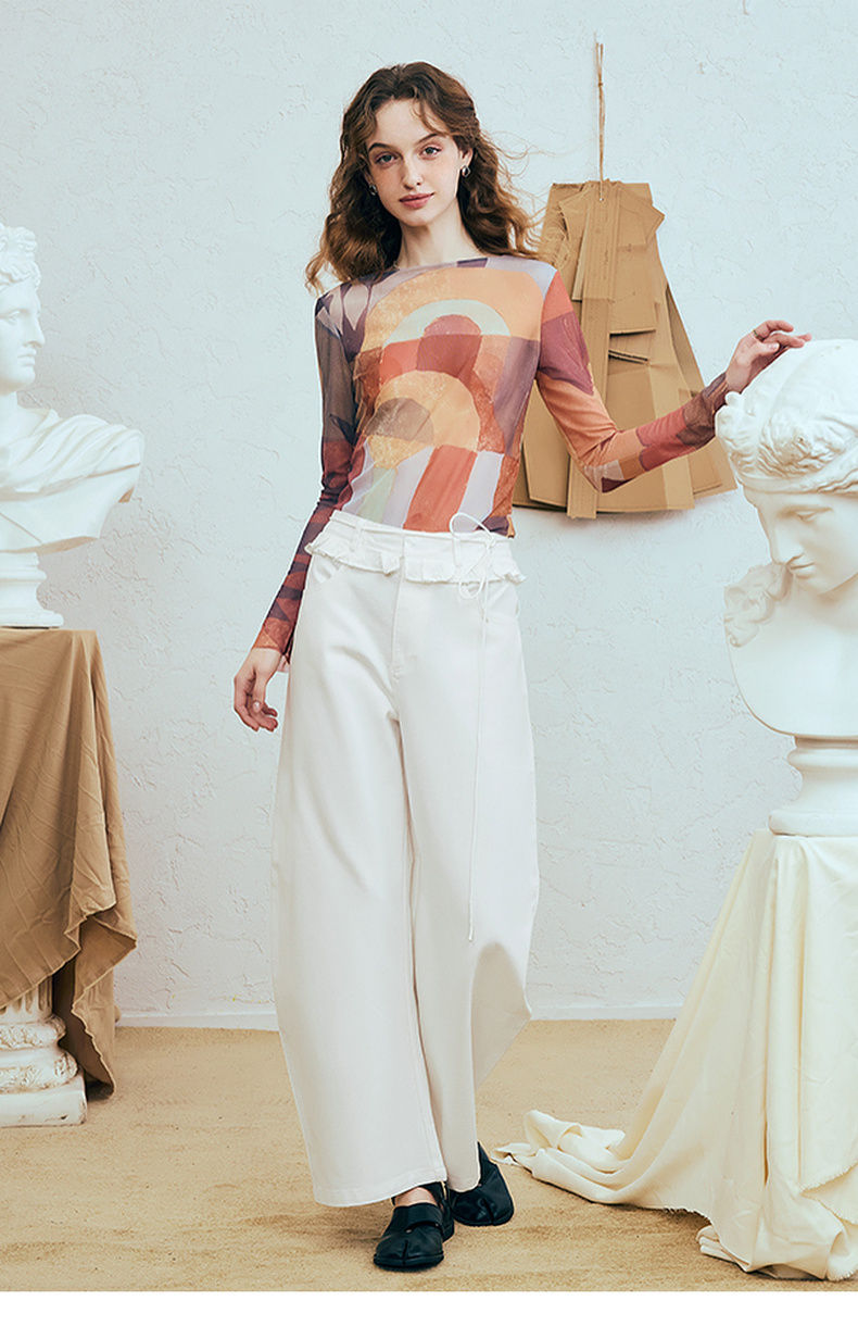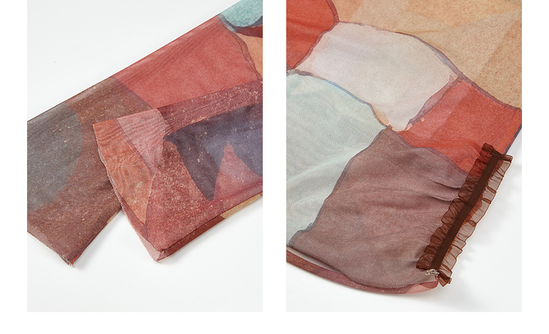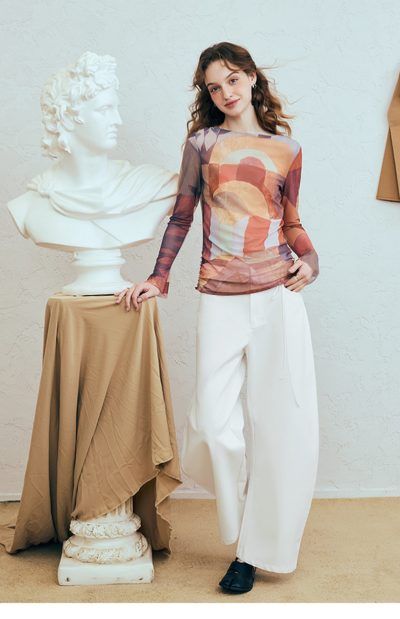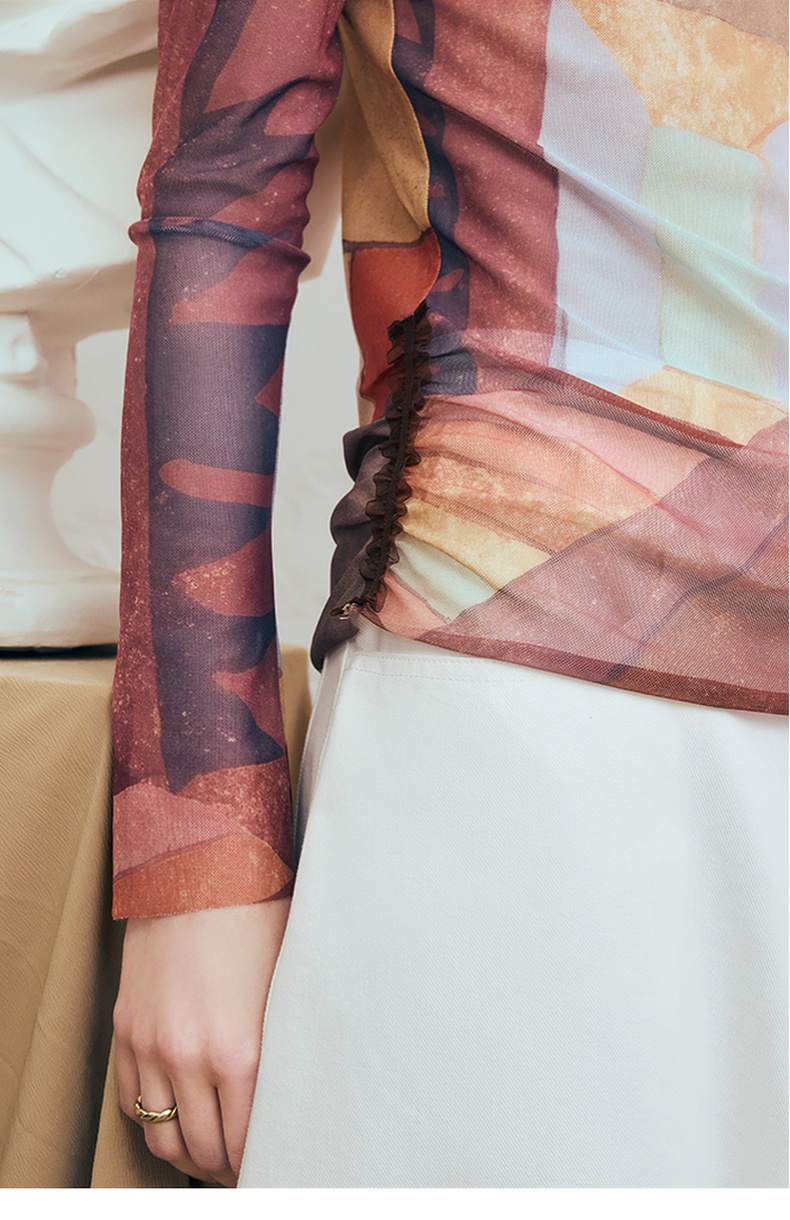 两三事 幻视空间 2025夏季新款时尚抽象印花网布透视打底衫女t恤