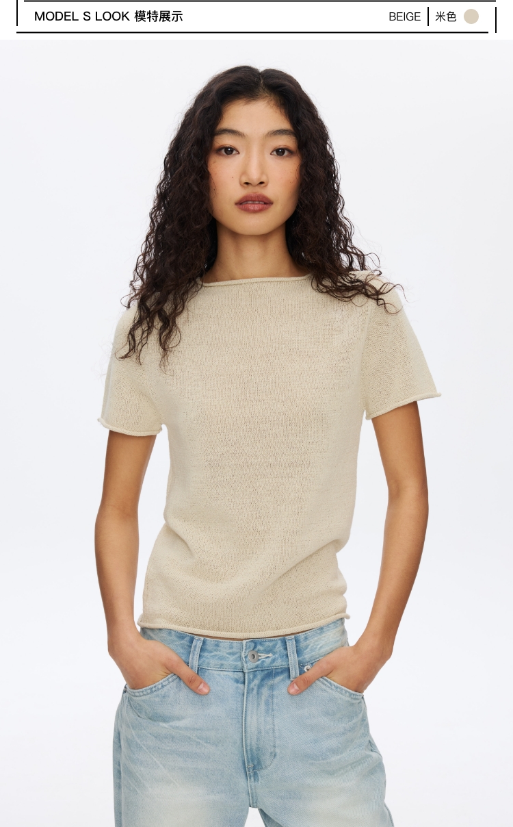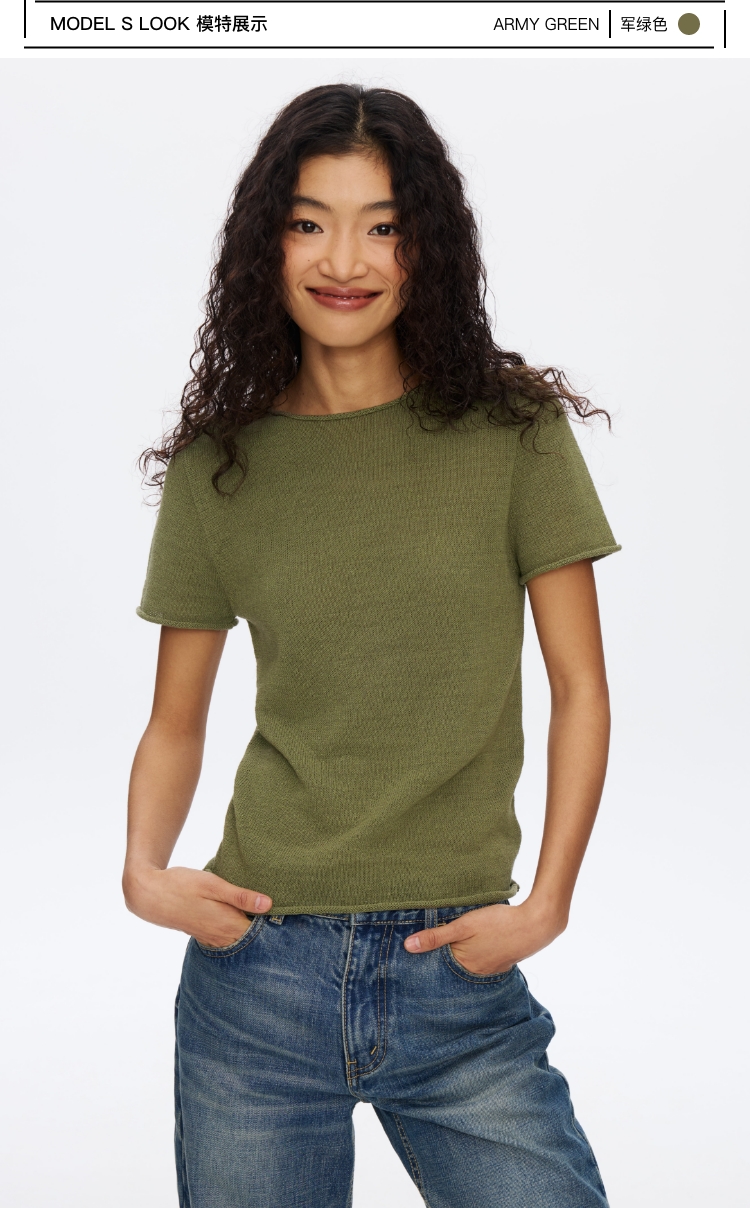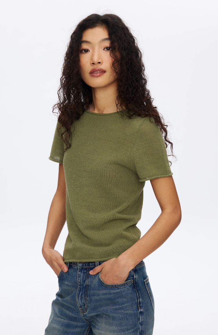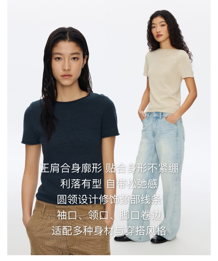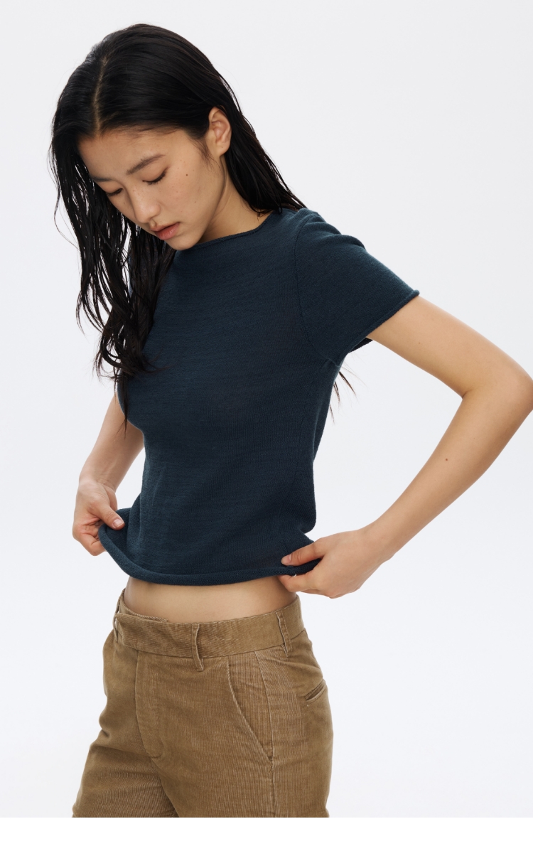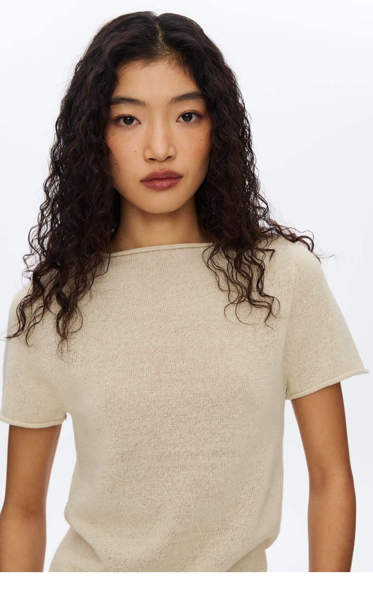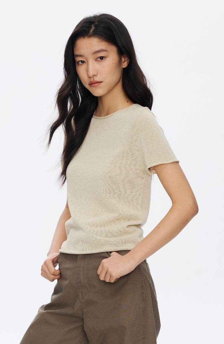Oneup亚麻卷边针织正肩短袖