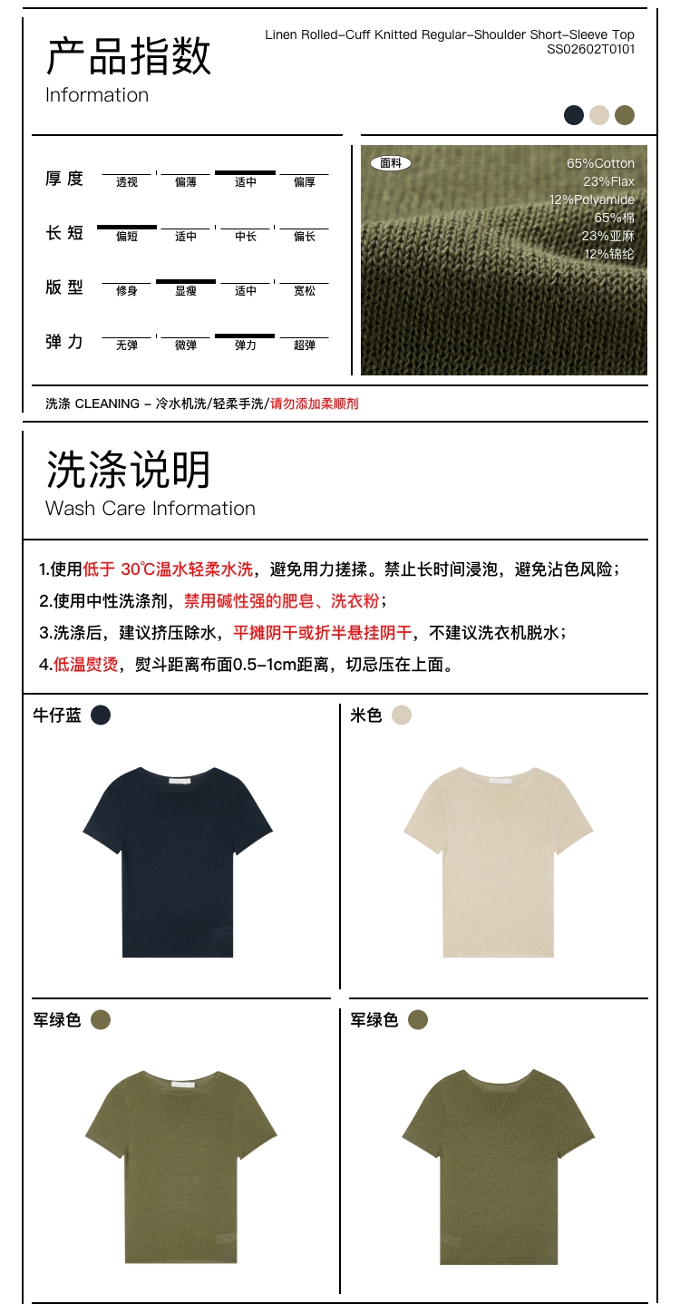 亚麻卷边针织正肩短�