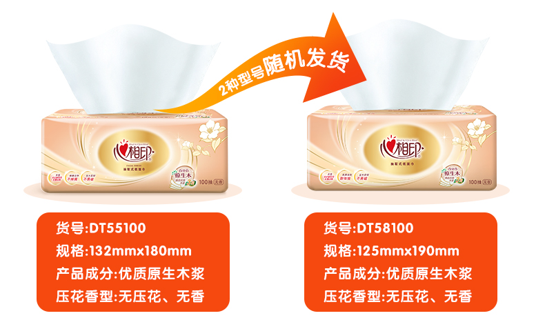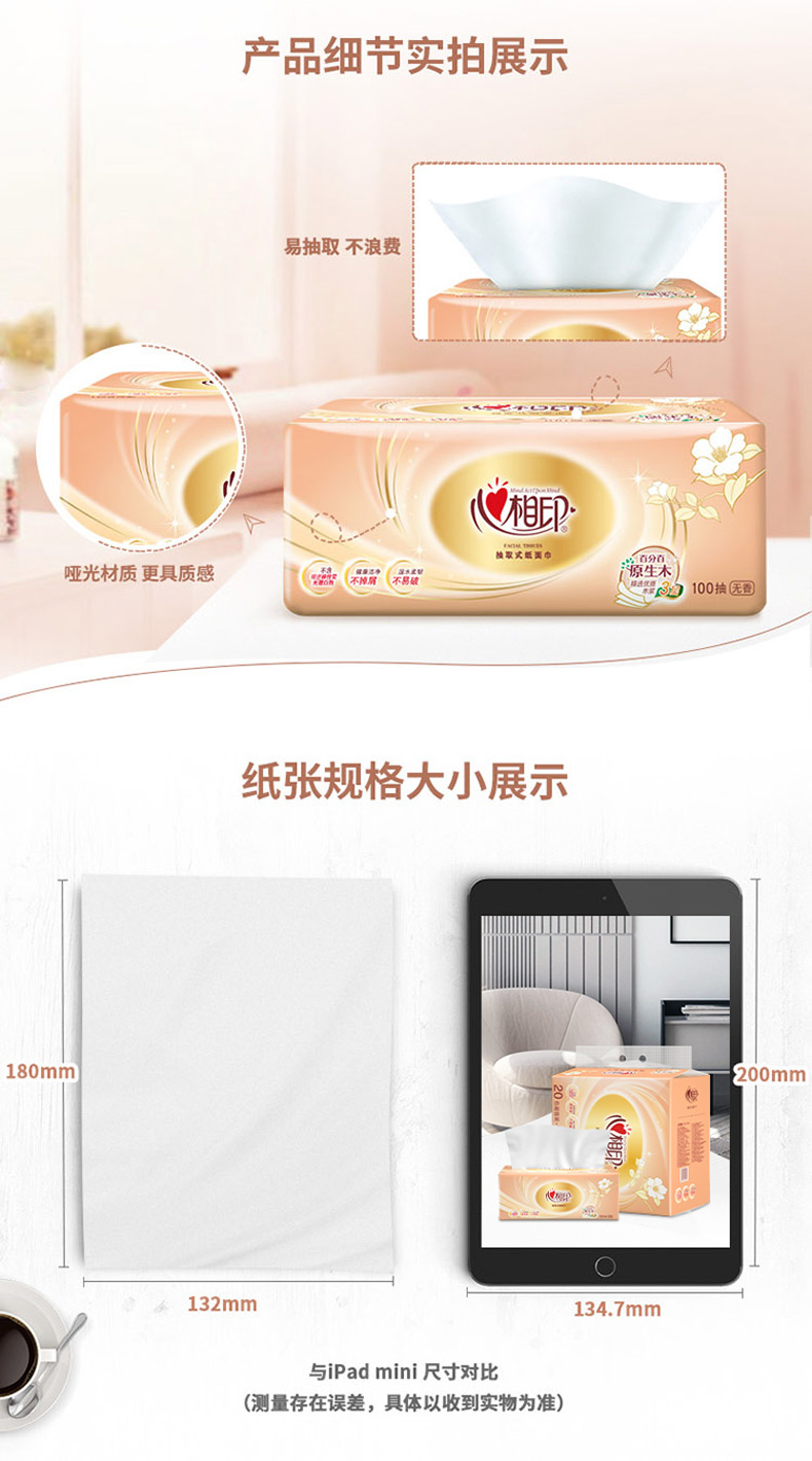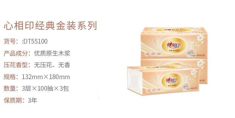 心相印金装经典100抽三层加厚纸面巾抽纸巾 优质原生木浆面巾纸 无香型卫生纸湿水不易破 经济环保 高温去菌