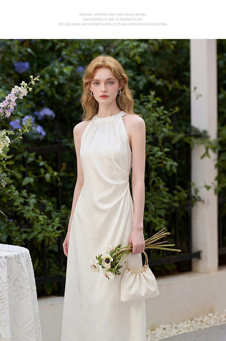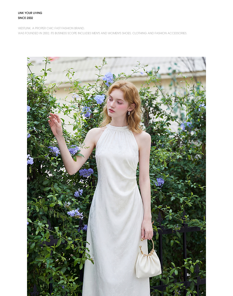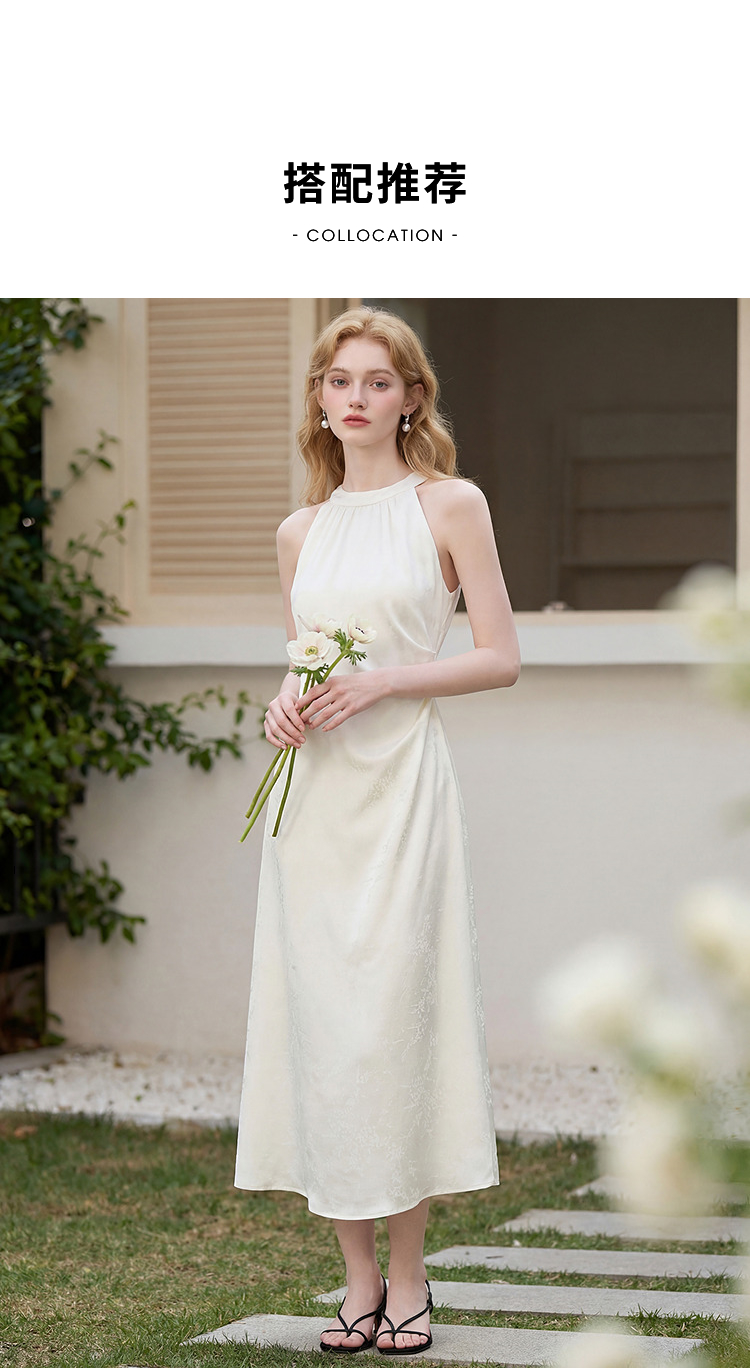 西遇新中式挂脖连衣裙女2026年夏季新款提花收腰显瘦国风茶歇长裙E0060275