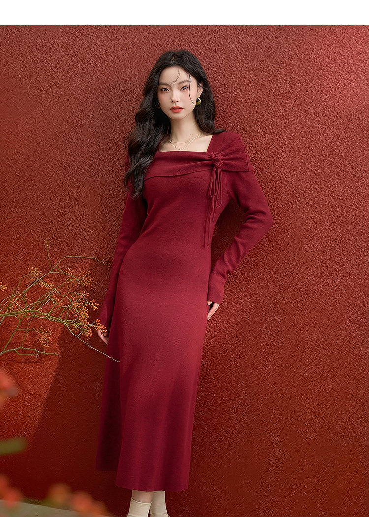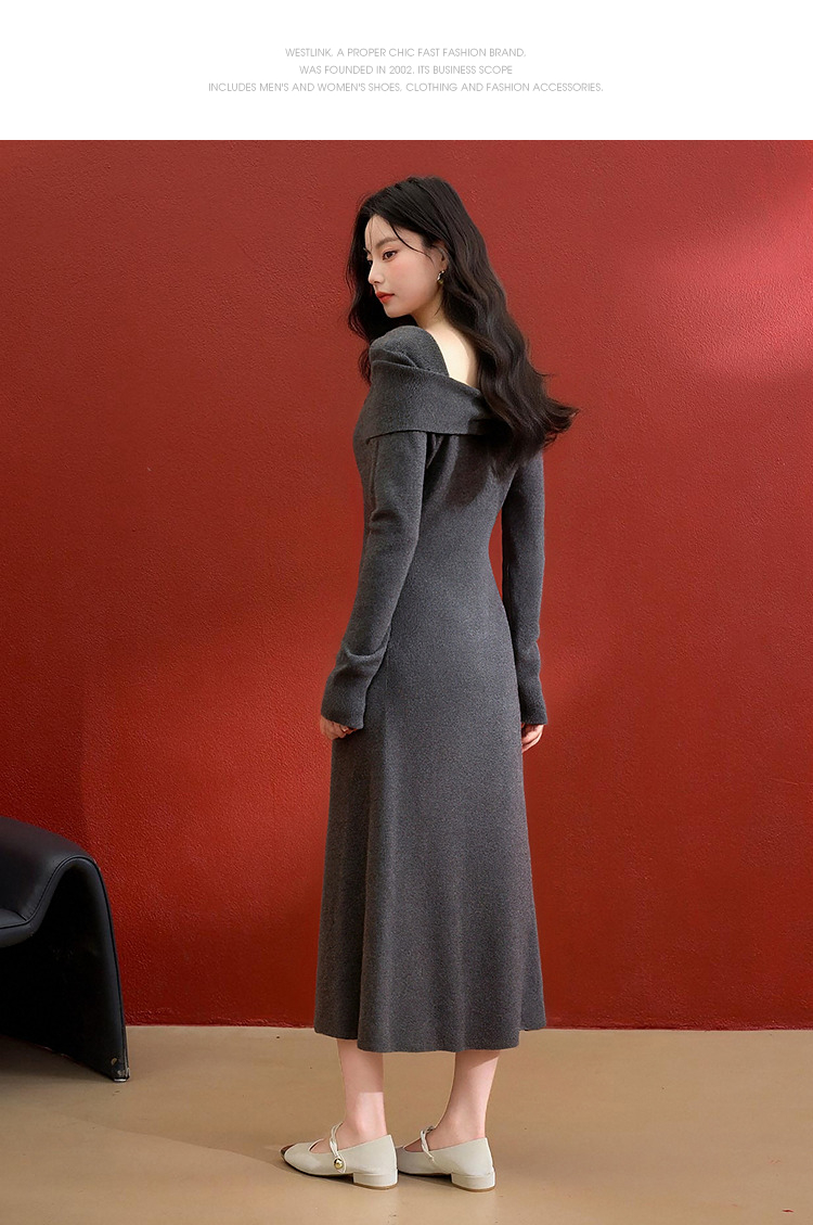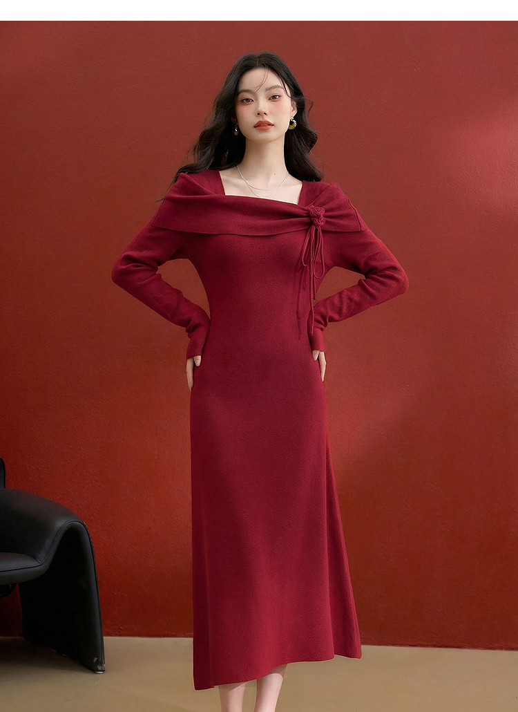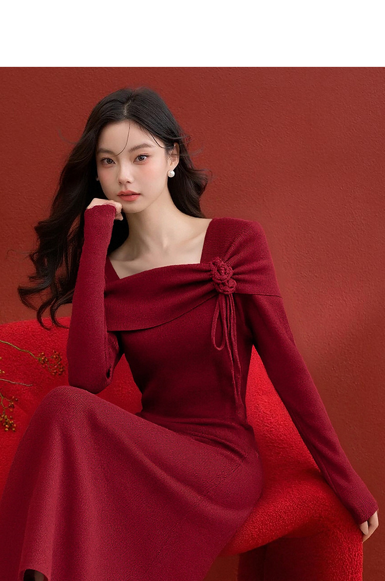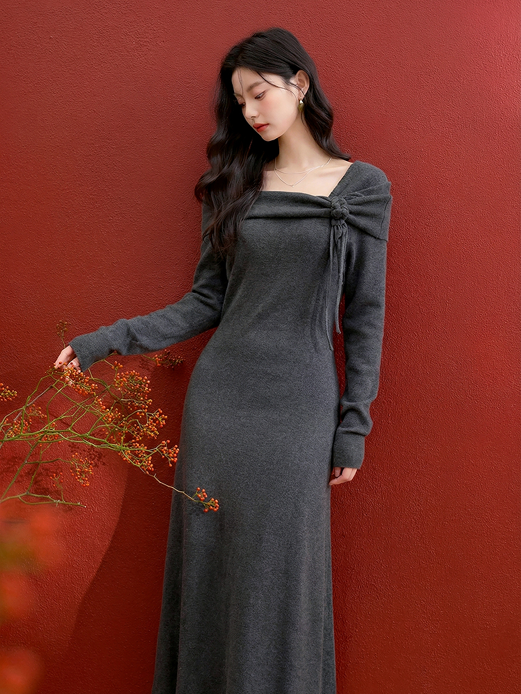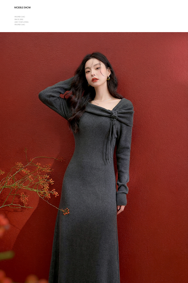 西遇法式长袖连衣裙女秋季新款名媛气质花朵针织收腰长裙V0055473