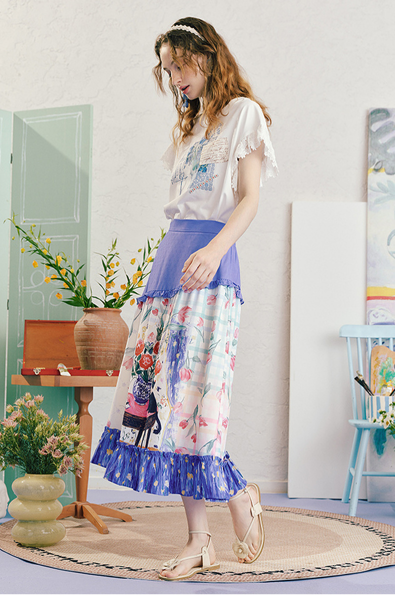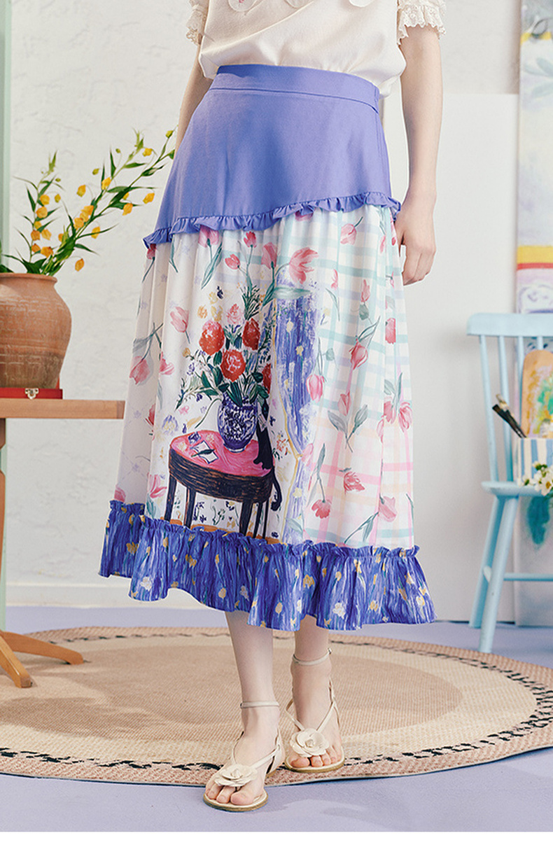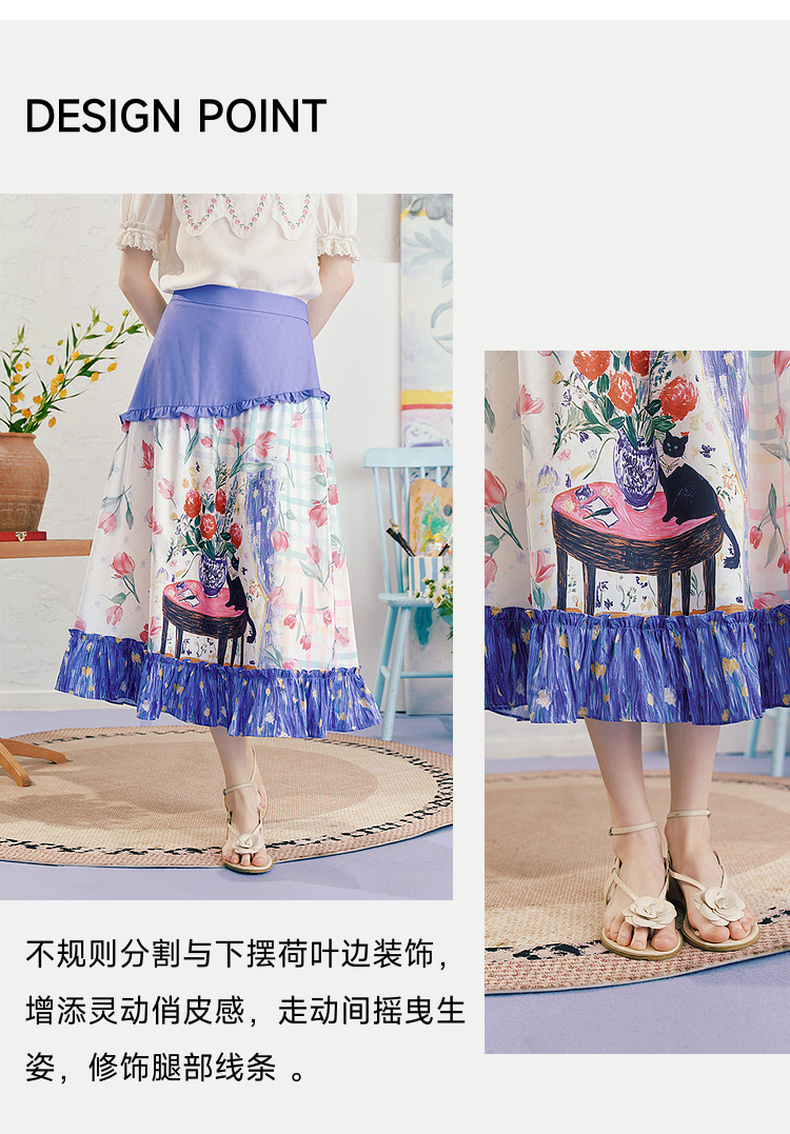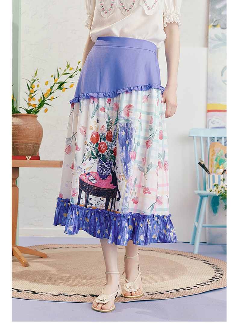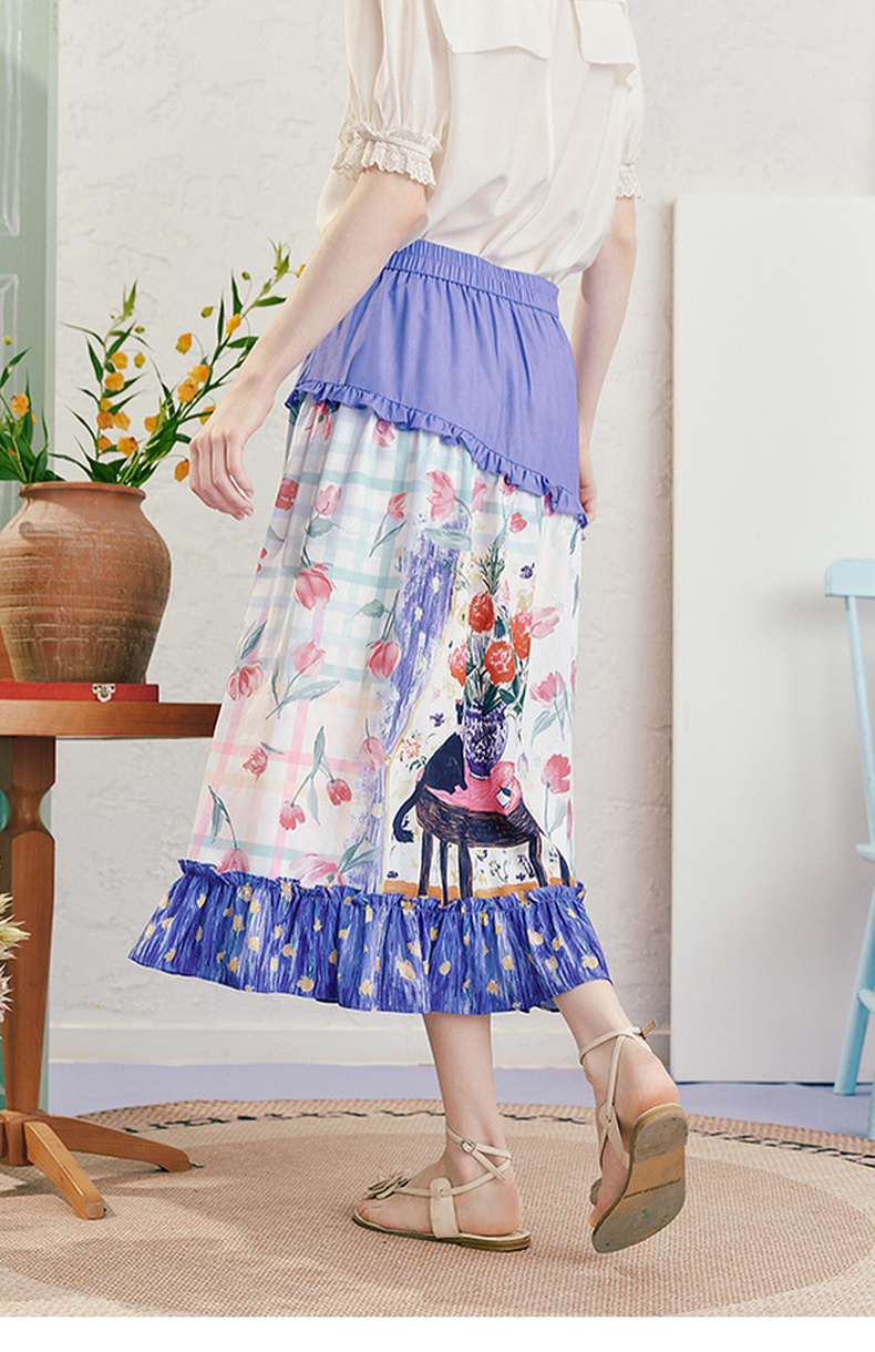 两三事浮香玫影2025夏季新款森女风荷叶边拼接印花a字半身裙长裙