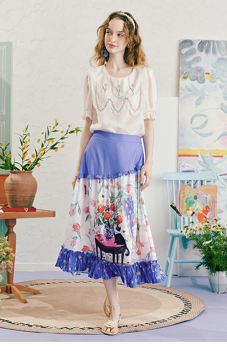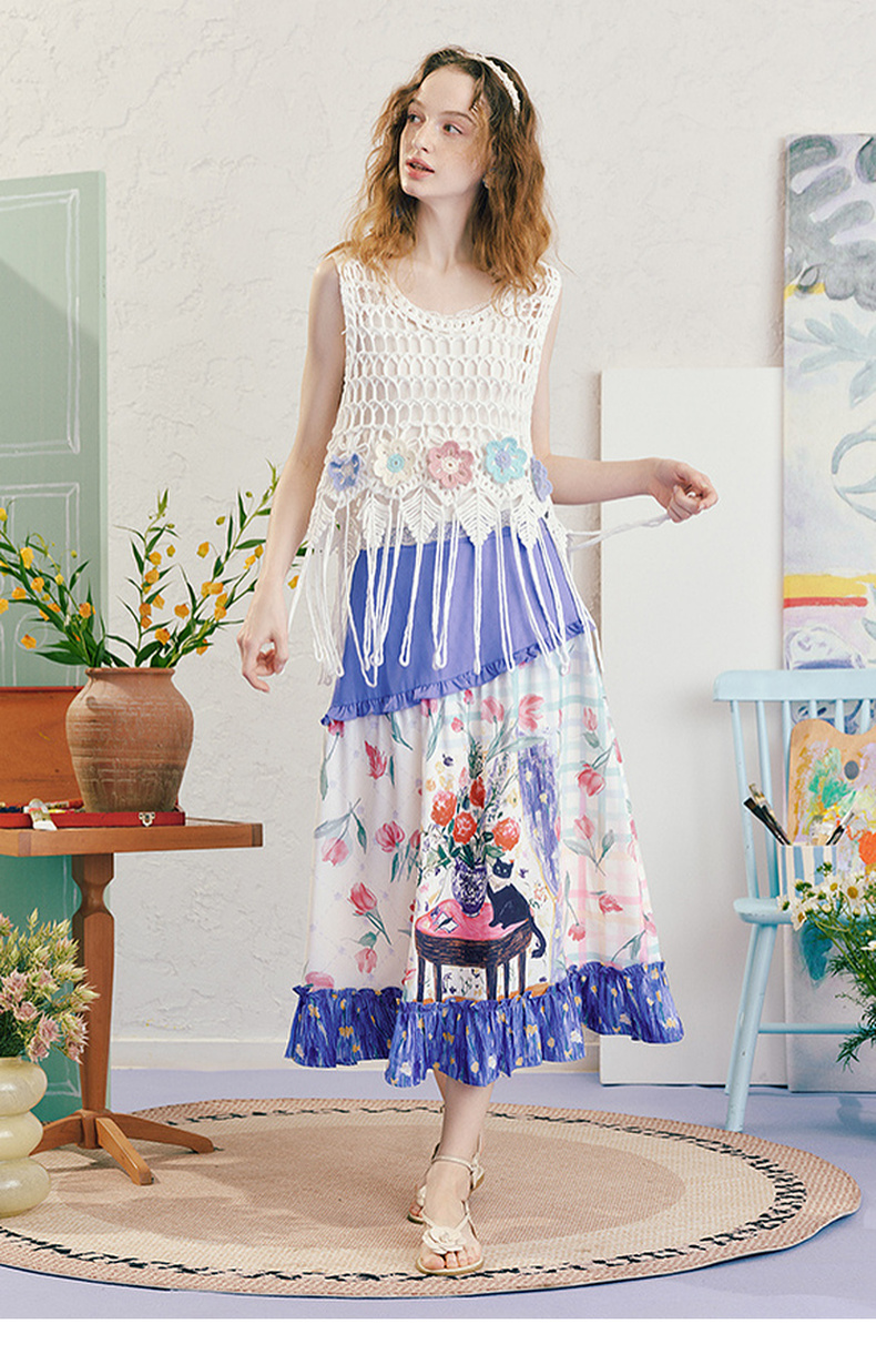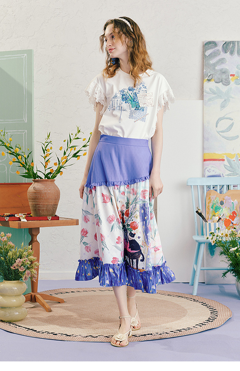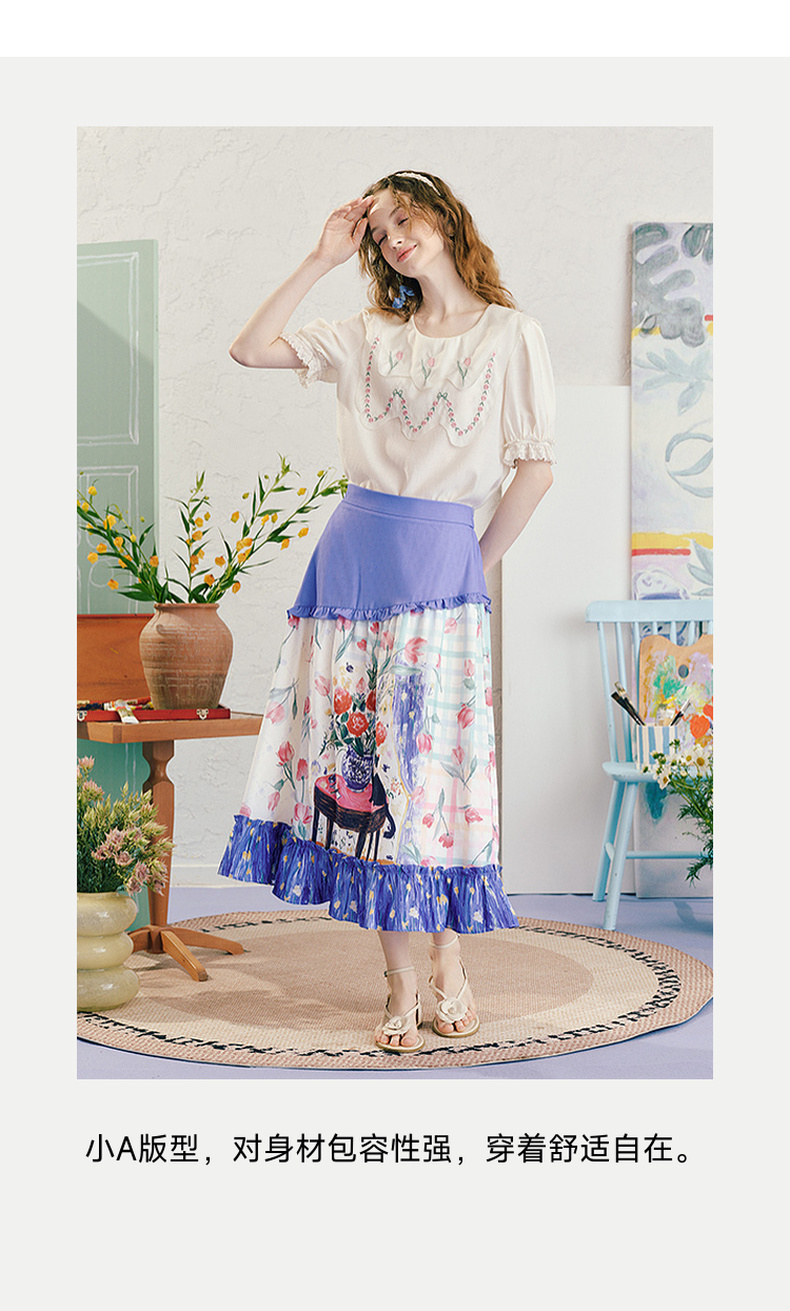 两三事浮香玫影2025夏季新款森女风荷叶边拼接印花a字半身裙长裙