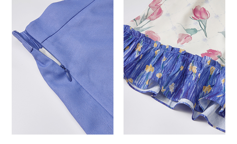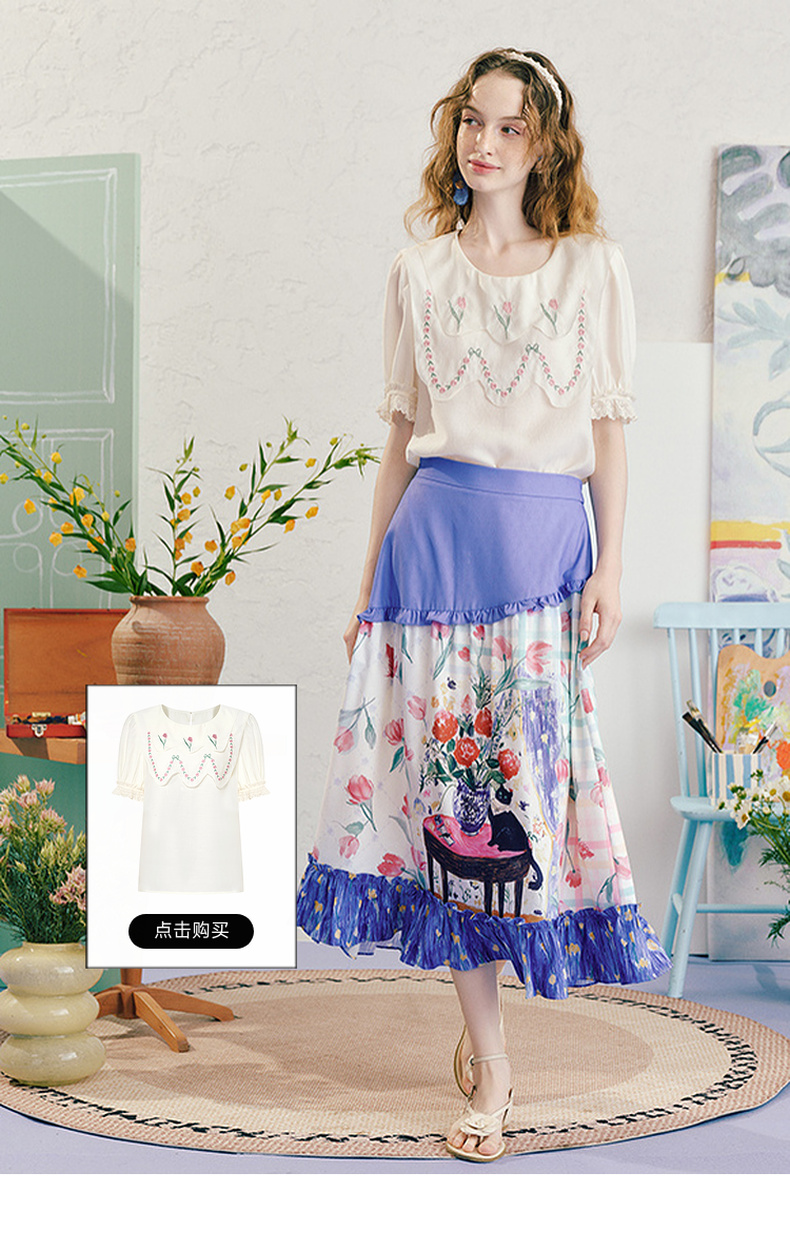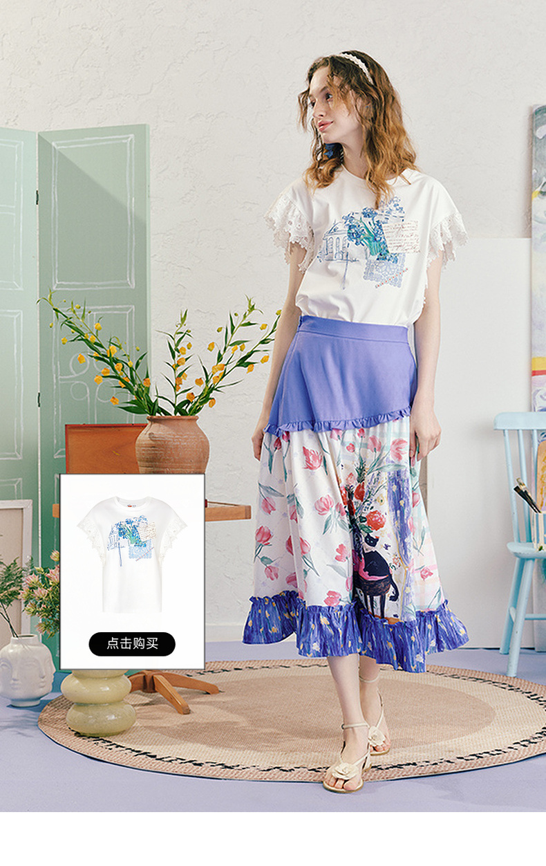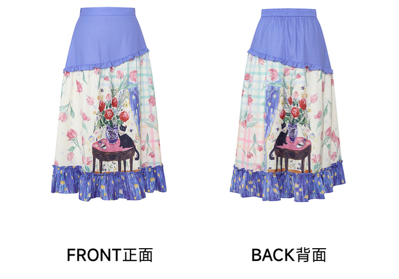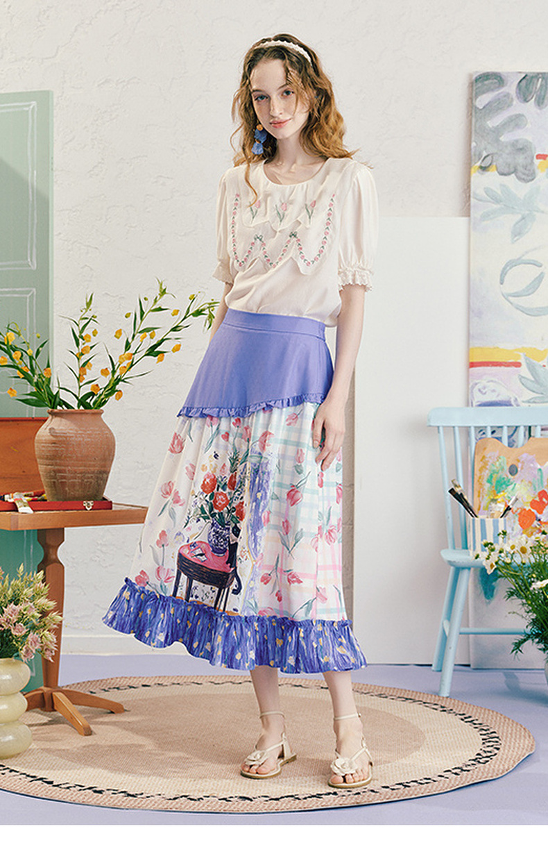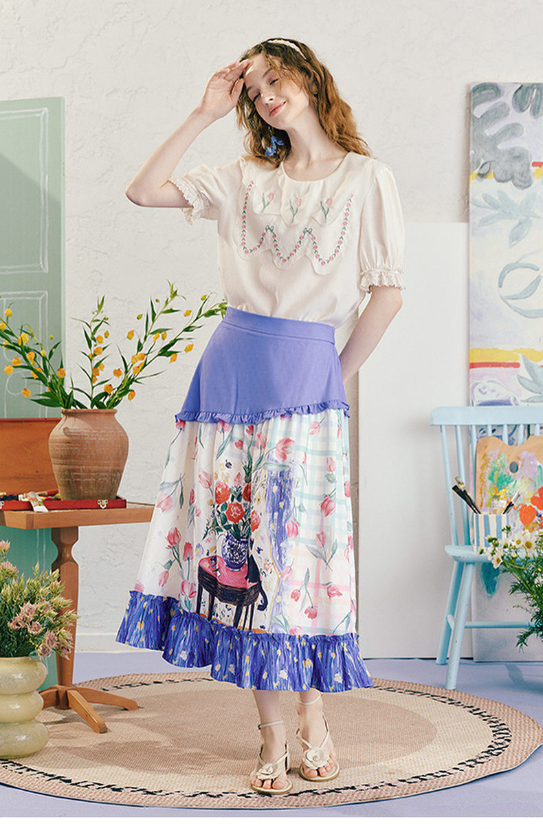 两三事浮香玫影2025夏季新款森女风荷叶边拼接印花a字半身裙长裙