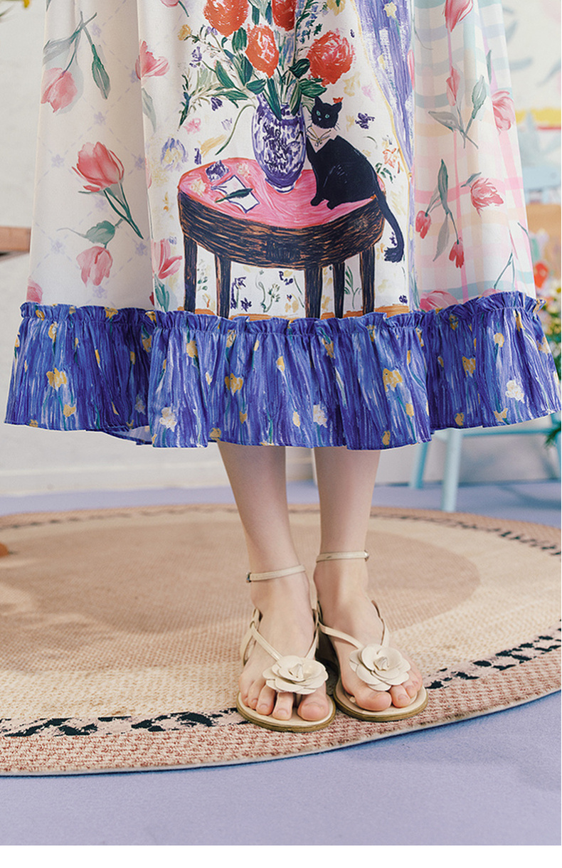 两三事软萌喵园2025春新款甜美荷叶边拼接印花无袖背心裙连衣裙