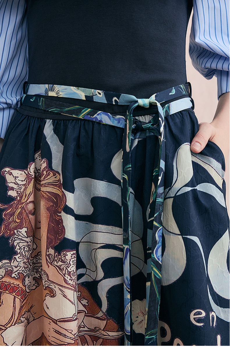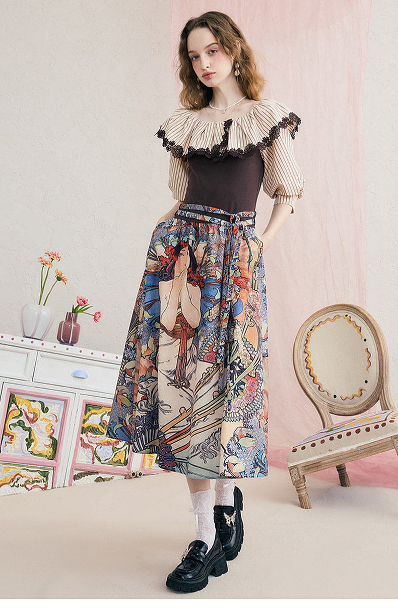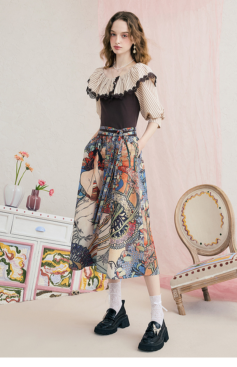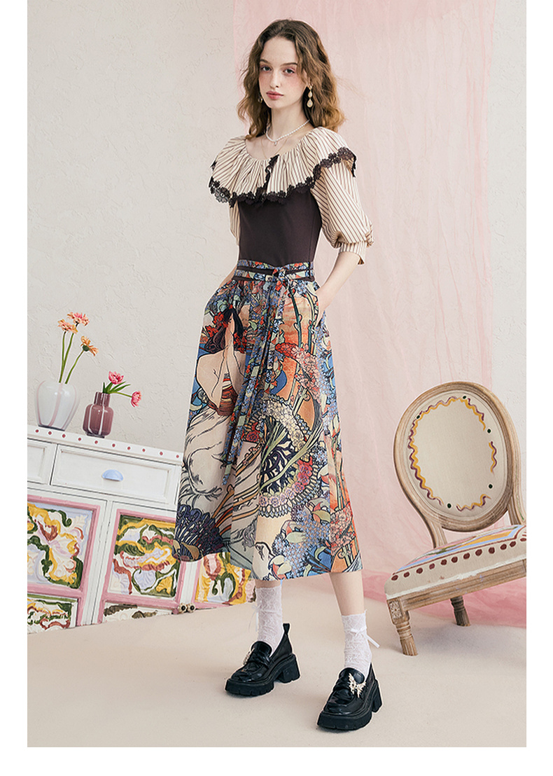两三事梵高文艺 弦外智音 2025夏季新款彩绳绑带领印花短袖t恤女