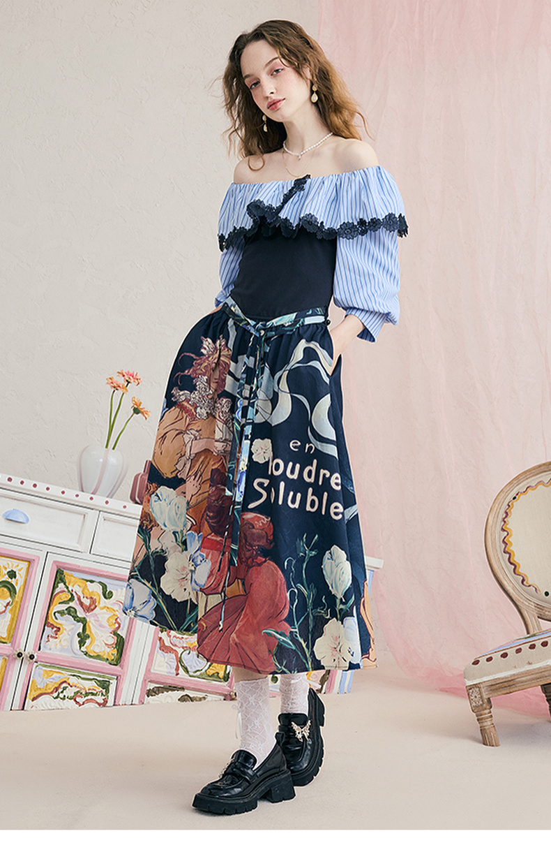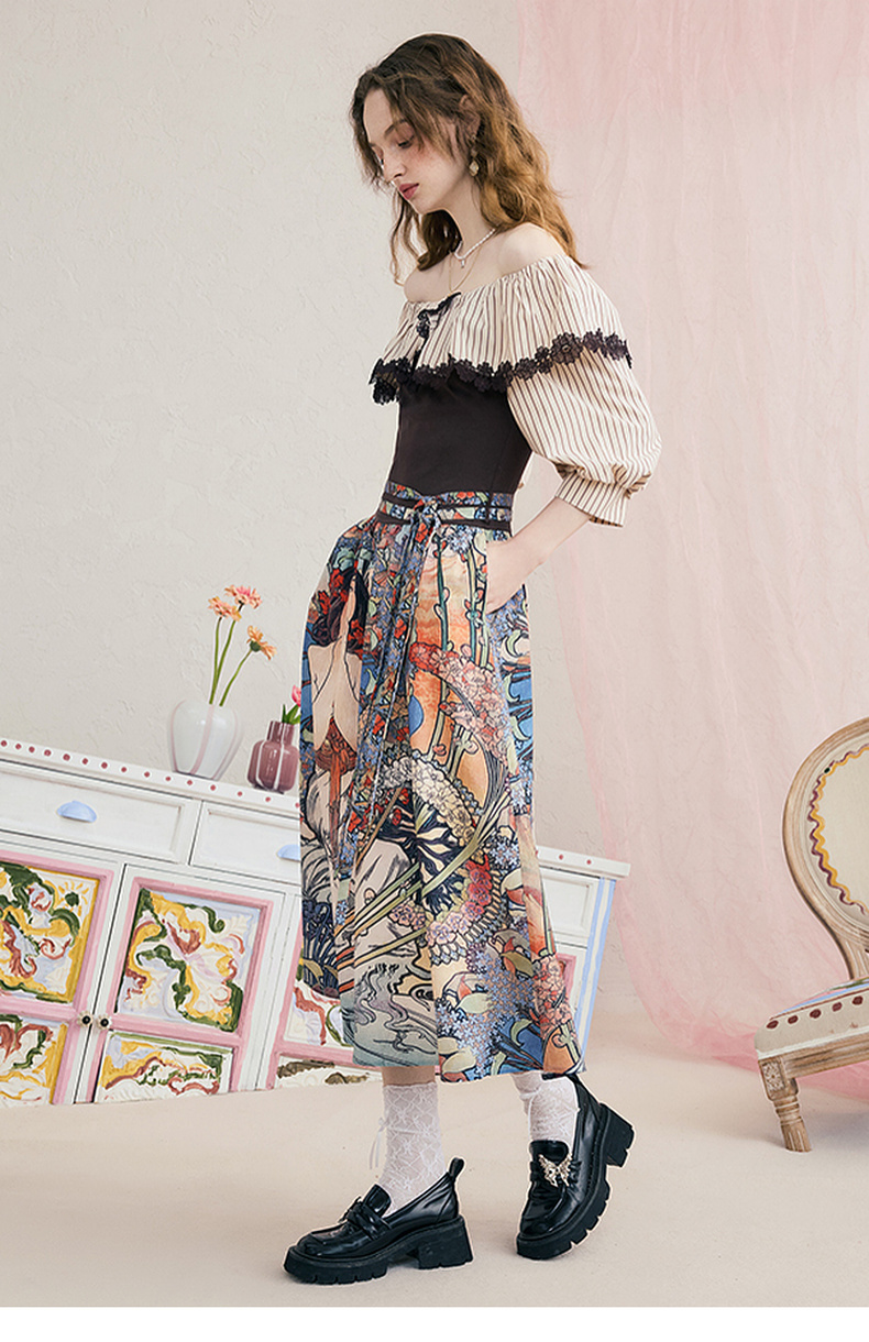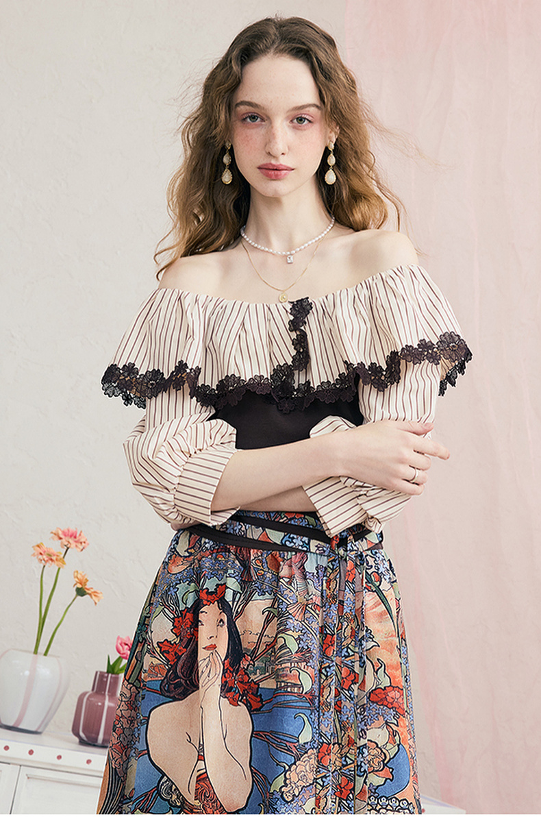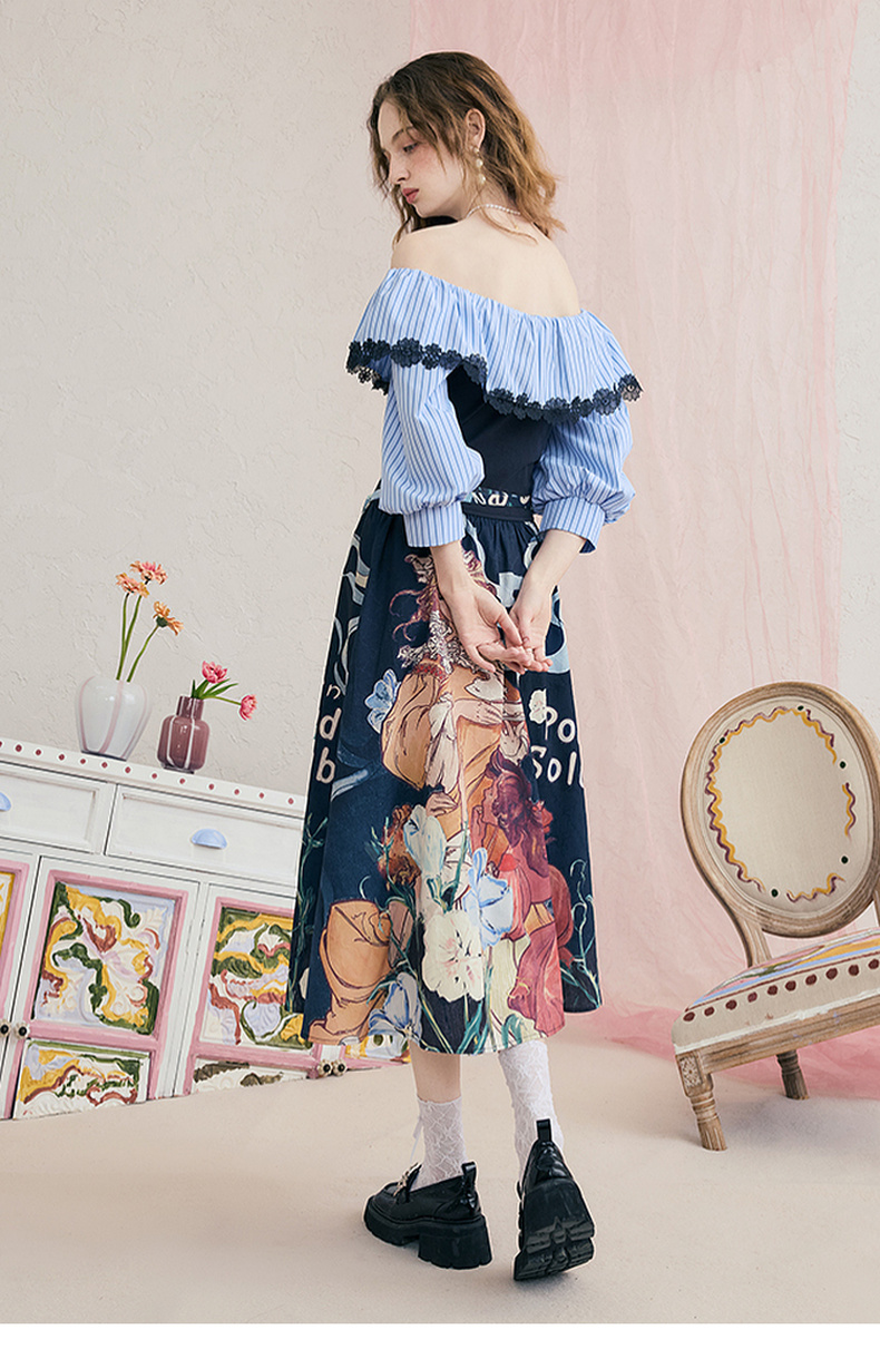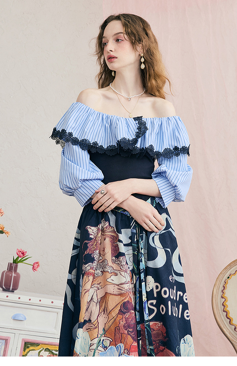两三事暮色诗行2025夏季新款复古一字肩露肩条纹印花泡泡袖连衣裙