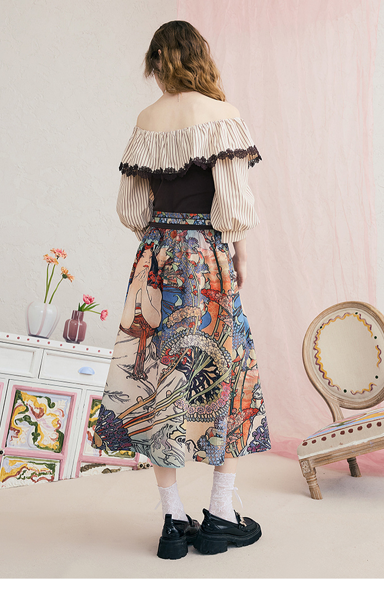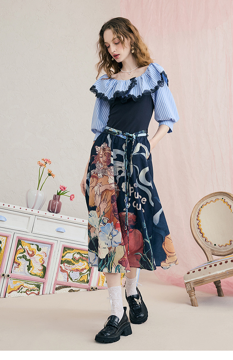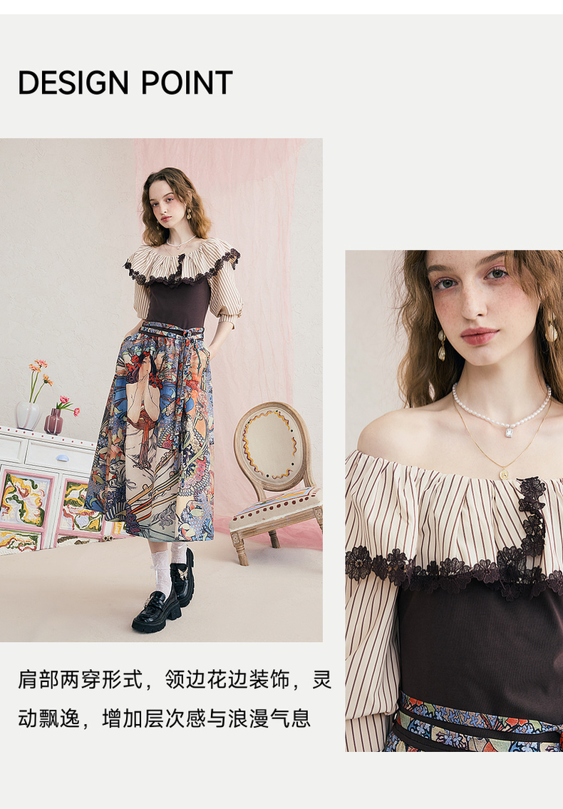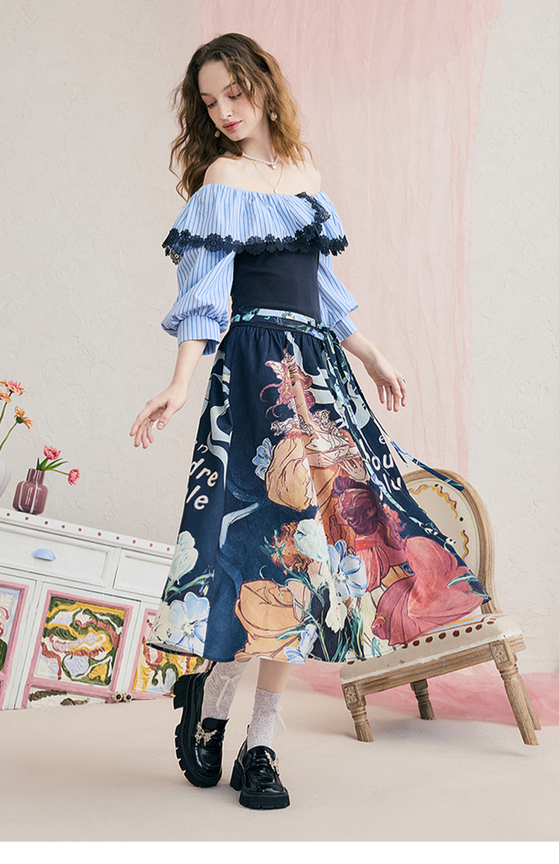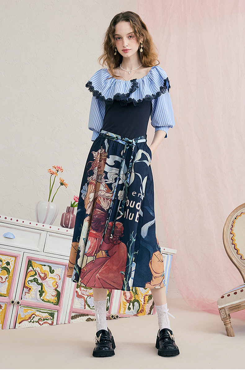 两三事暮色诗行2025夏季新款复古一字肩露肩条纹印花泡泡袖连衣裙
