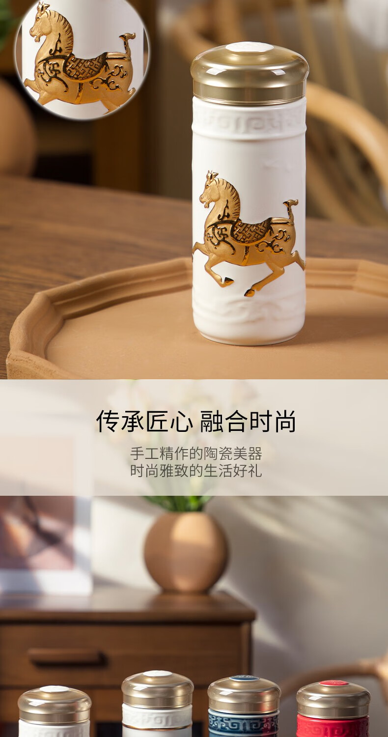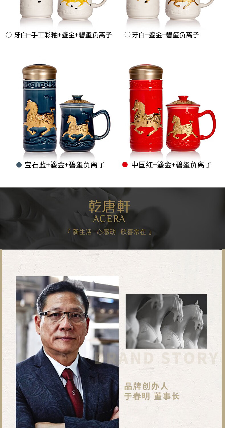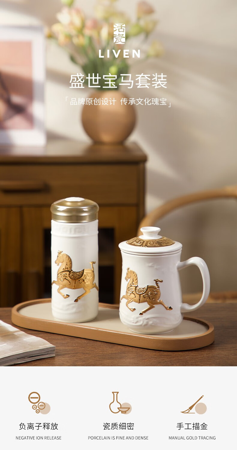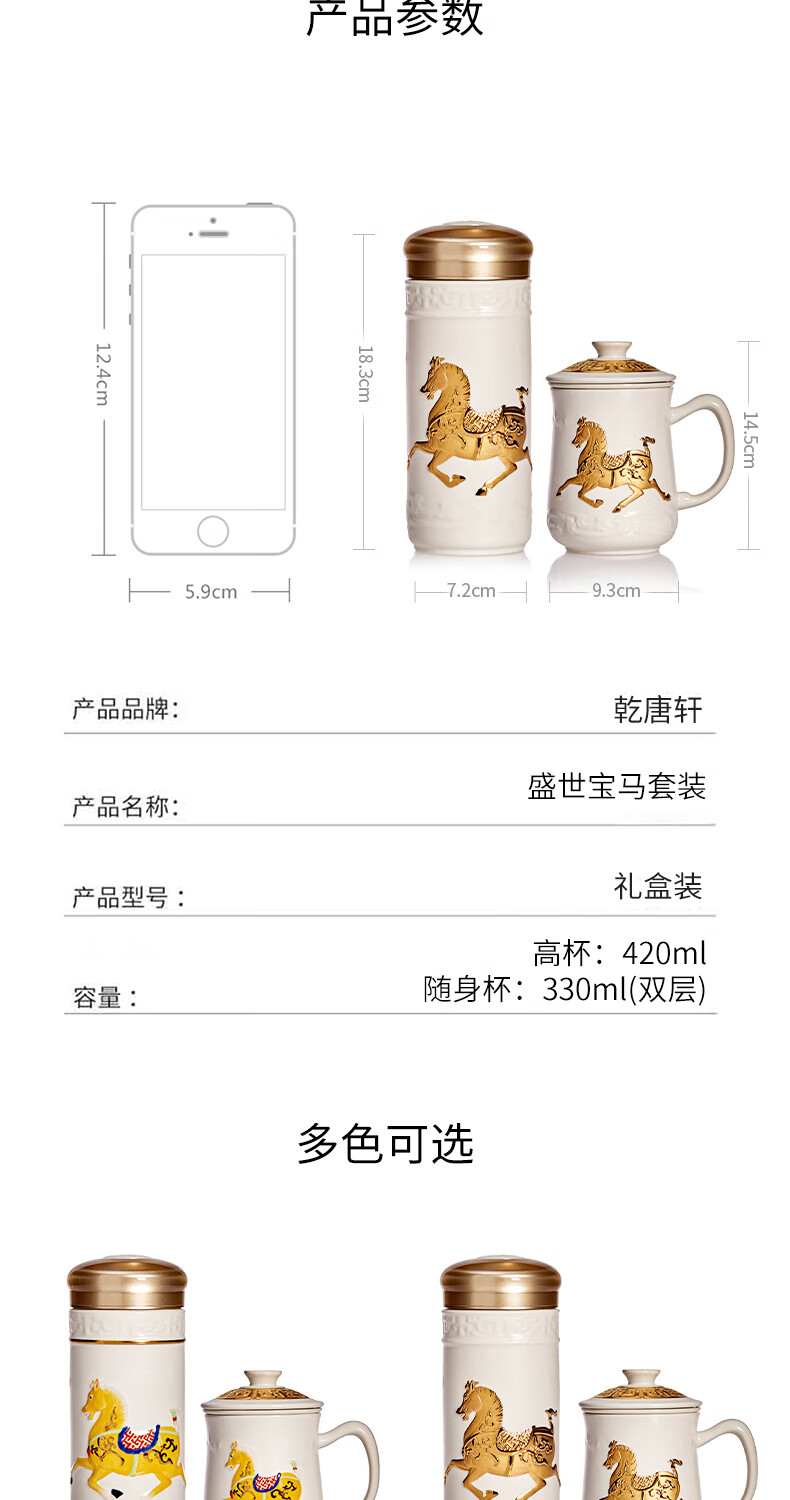【样品特惠6折,仅1套,无货退款】乾唐轩活瓷杯送礼佳品盛世宝马陶瓷杯套装随行杯和三件杯礼盒套装礼 宝石蓝+鎏金+碧玺负离子