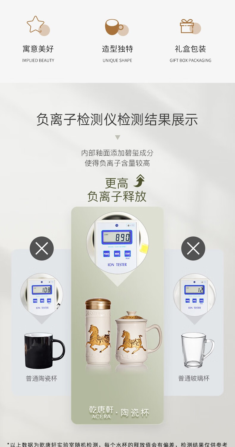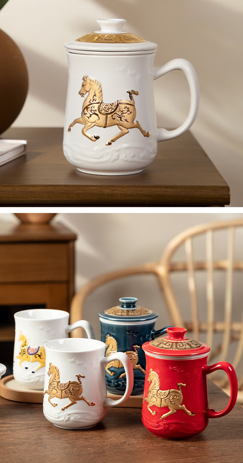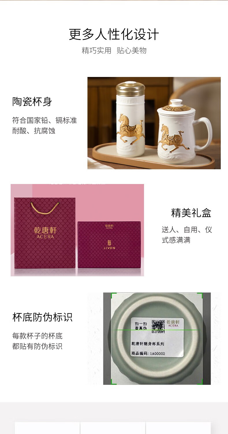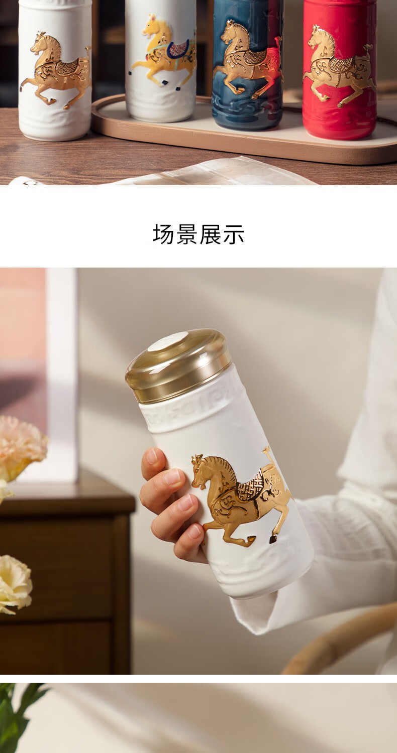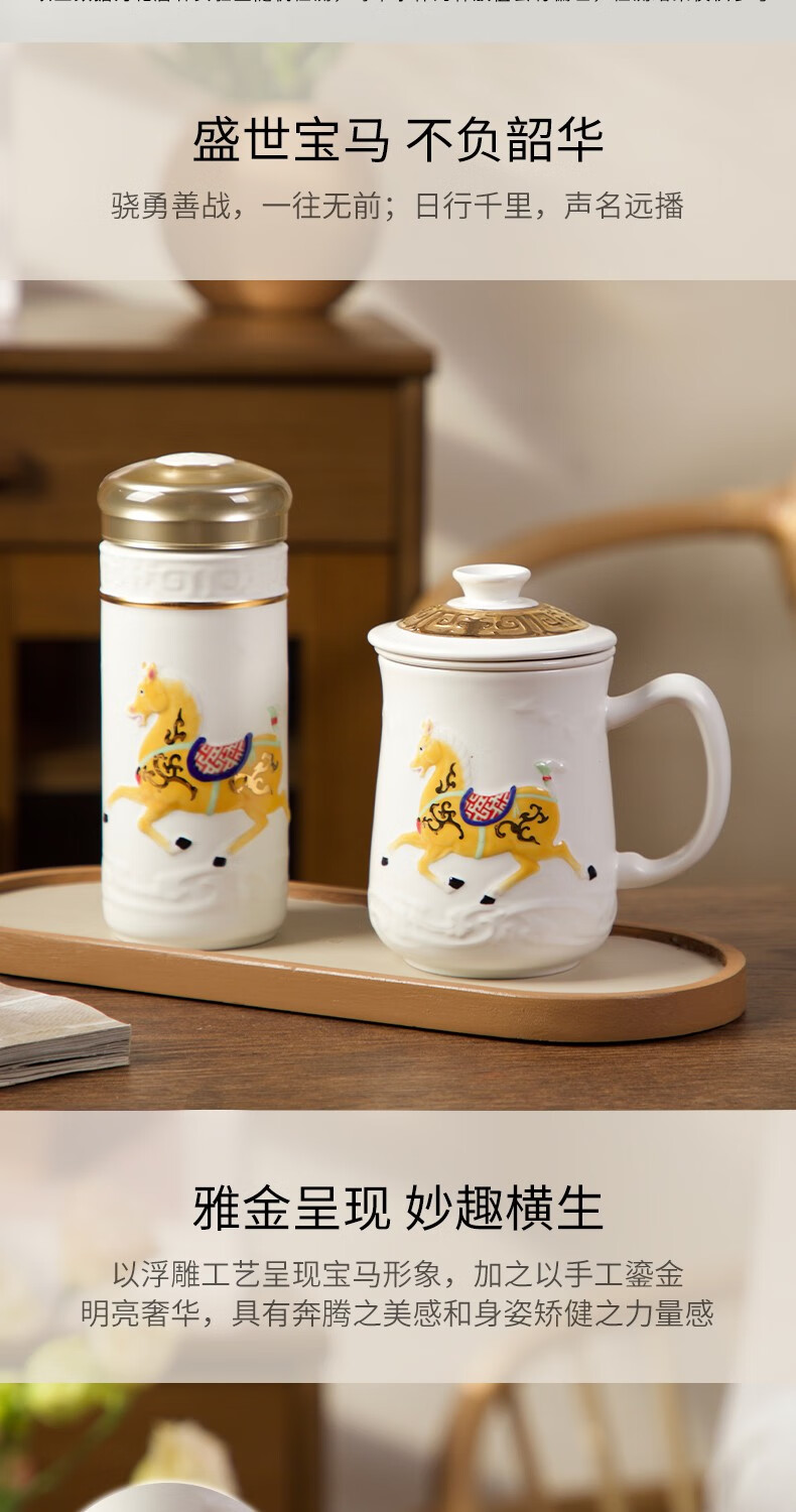 【样品特惠6折,仅1套,无货退款】乾唐轩活瓷杯送礼佳品盛世宝马陶瓷杯套装随行杯和三件杯礼盒套装礼 宝石蓝+鎏金+碧玺负离子