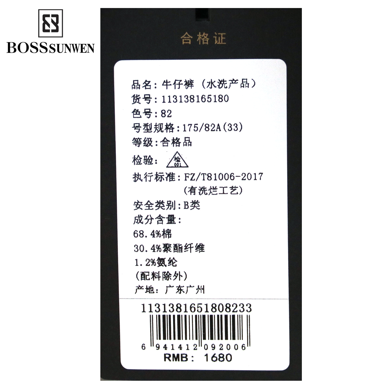 博斯绅威BOSS SUNWE牛仔裤113138165180