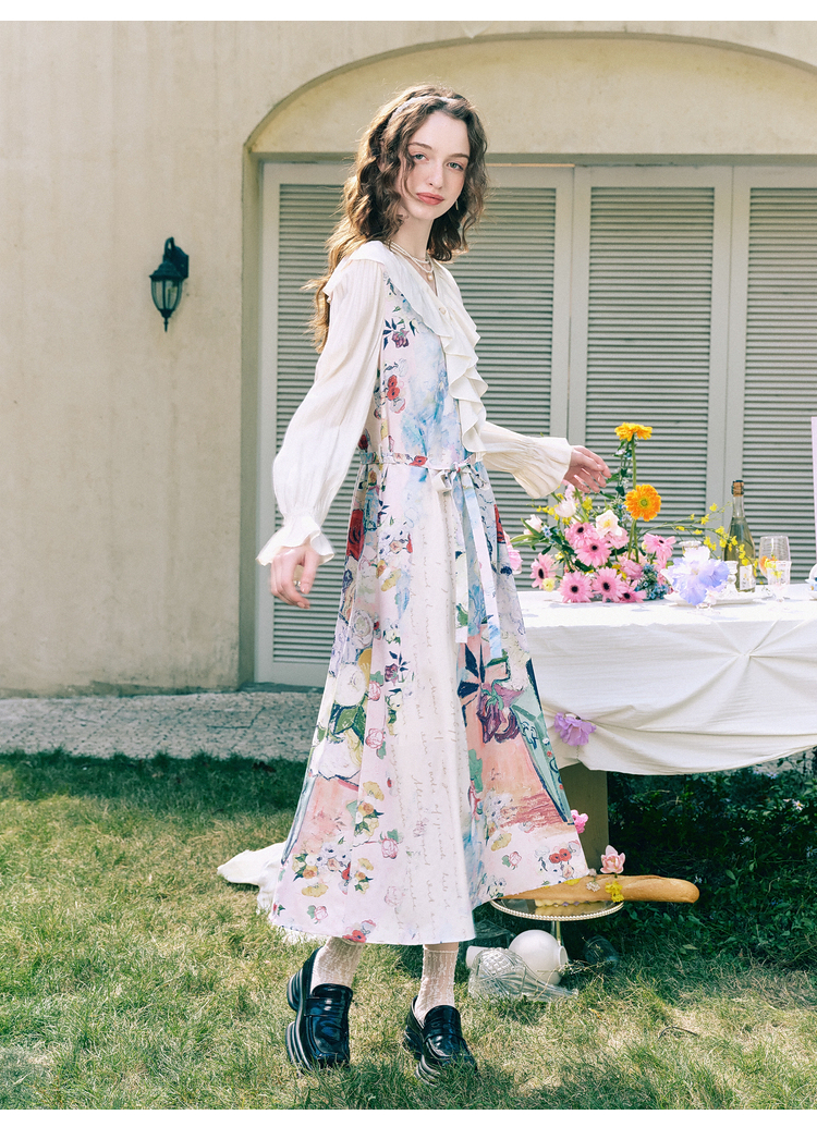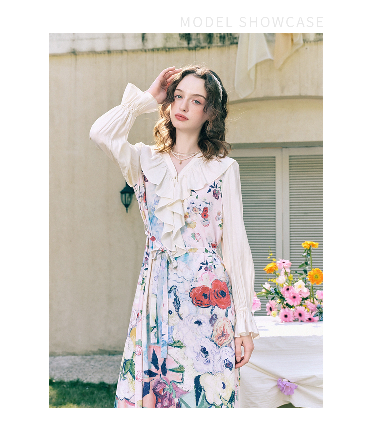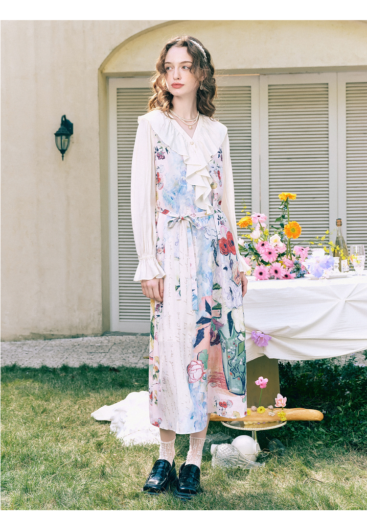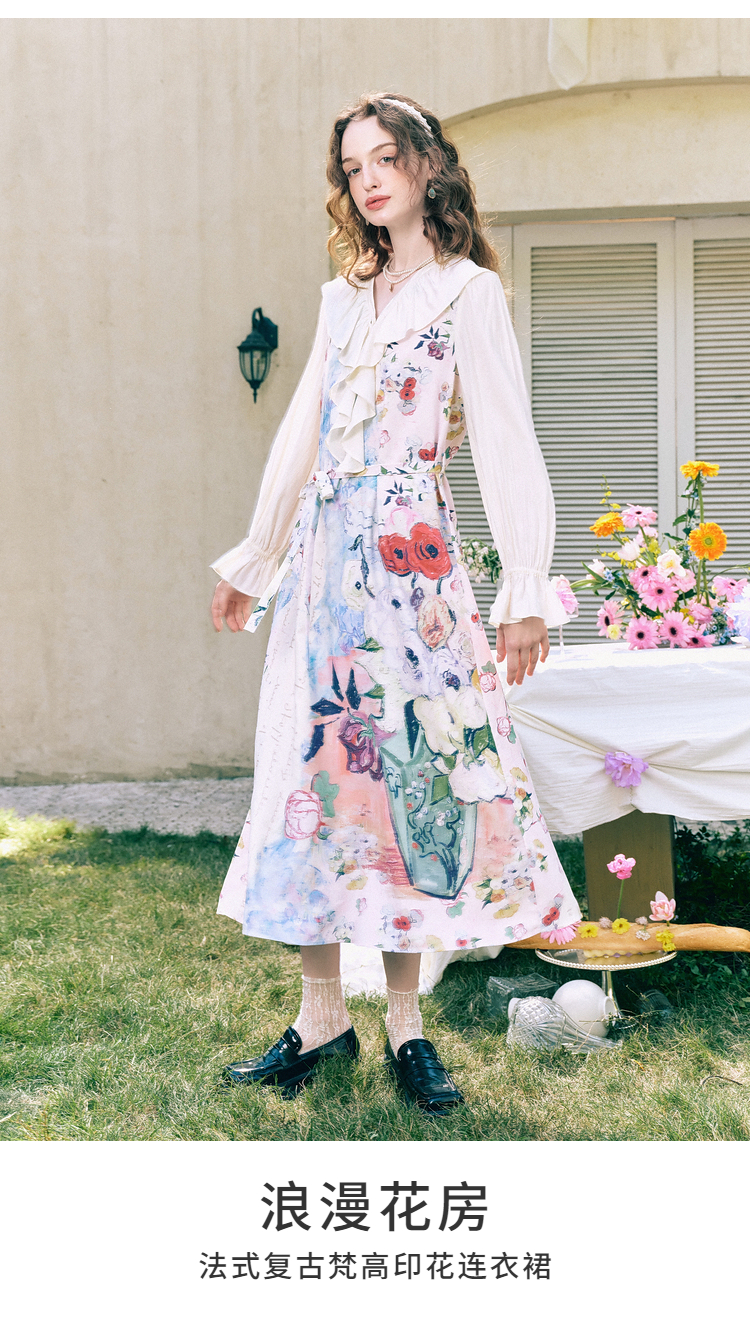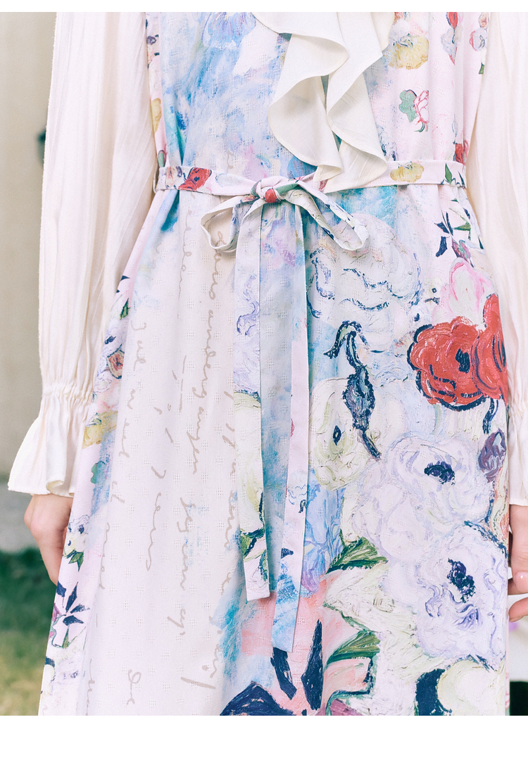 两三事梵高文艺 浪漫花房 2026春季新款荷叶边v领印花绑带连衣裙