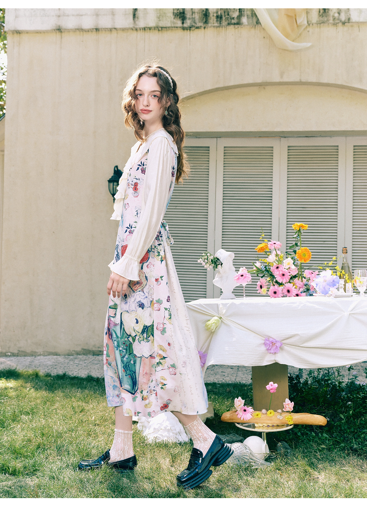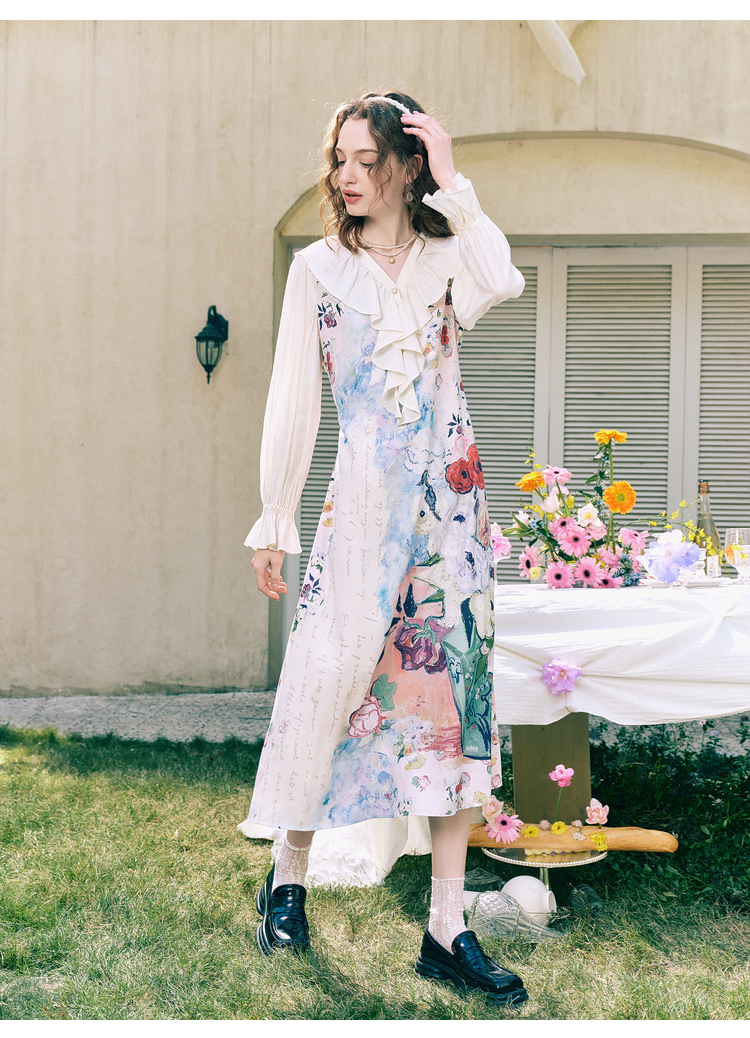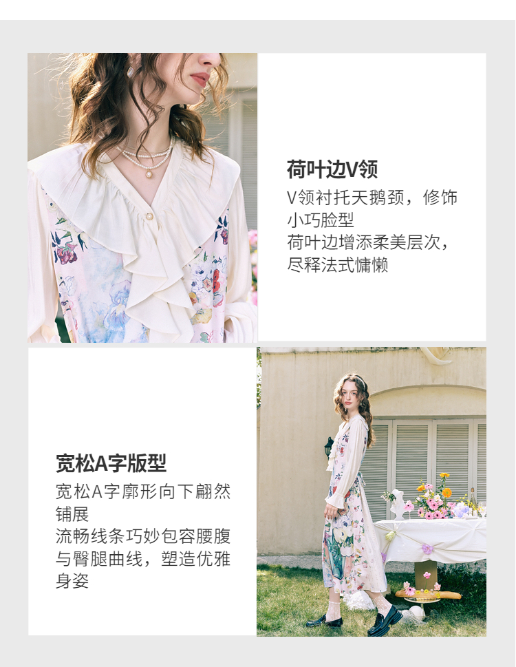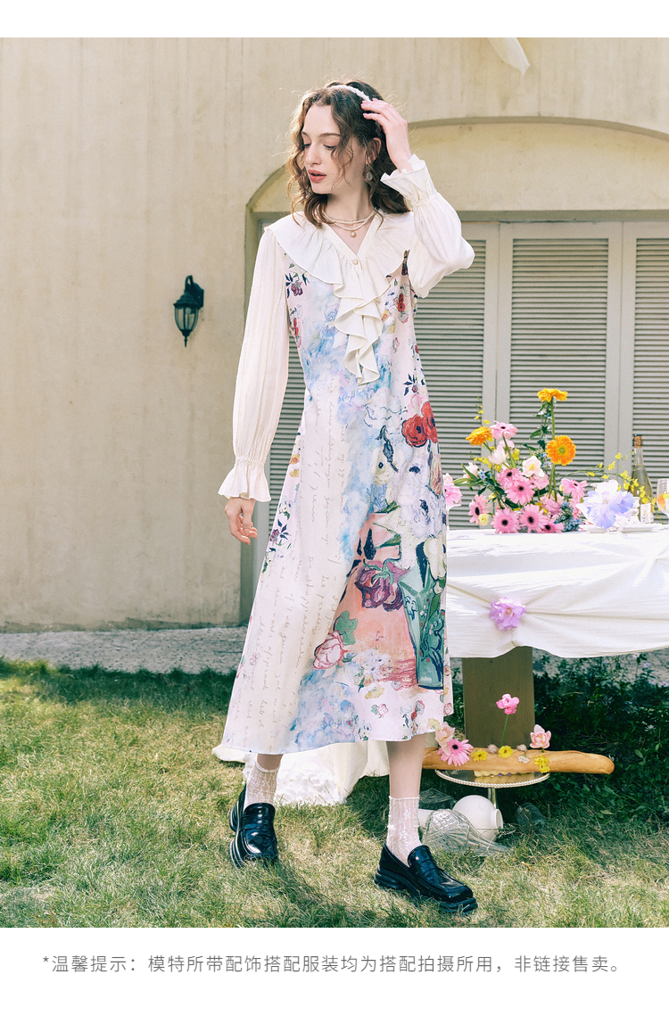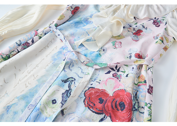 两三事梵高文艺 浪漫花房 2026春季新款荷叶边v领印花绑带连衣裙