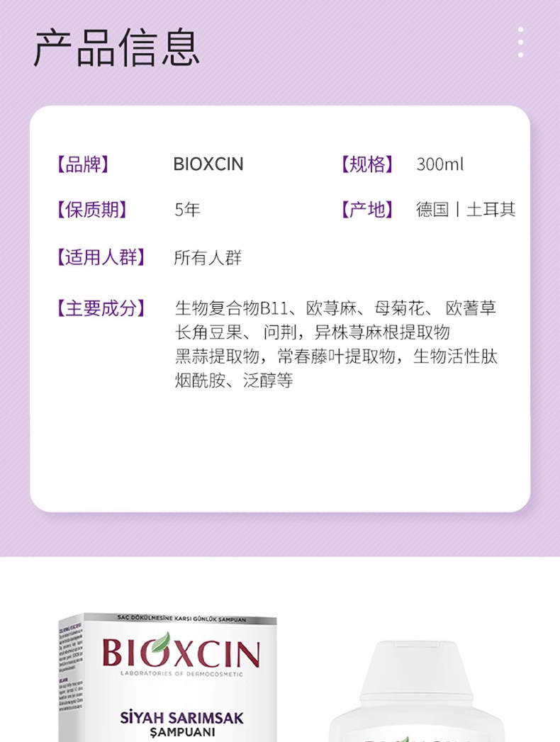【品名】【超值3瓶装 】头发站得住脚!土耳其BIOXCIN柏科生 清爽控油洗发水 300ml/瓶 8倍固发款+黑蒜控油款 【规格】: 300ml*3瓶装(红瓶*2+紫瓶*1) 300ml*3瓶装(红瓶*3) 300ml*4瓶装(红瓶*2+紫瓶*2) 【产地】土耳其 【保质期】5年 【发货包装】独立包装瓶 【发货地】苏州 【发货快递】中通,圆通 【不发货区域】青海、新疆、西藏、港澳台 【发货时效】48-72小时,周末节假日顺延 |